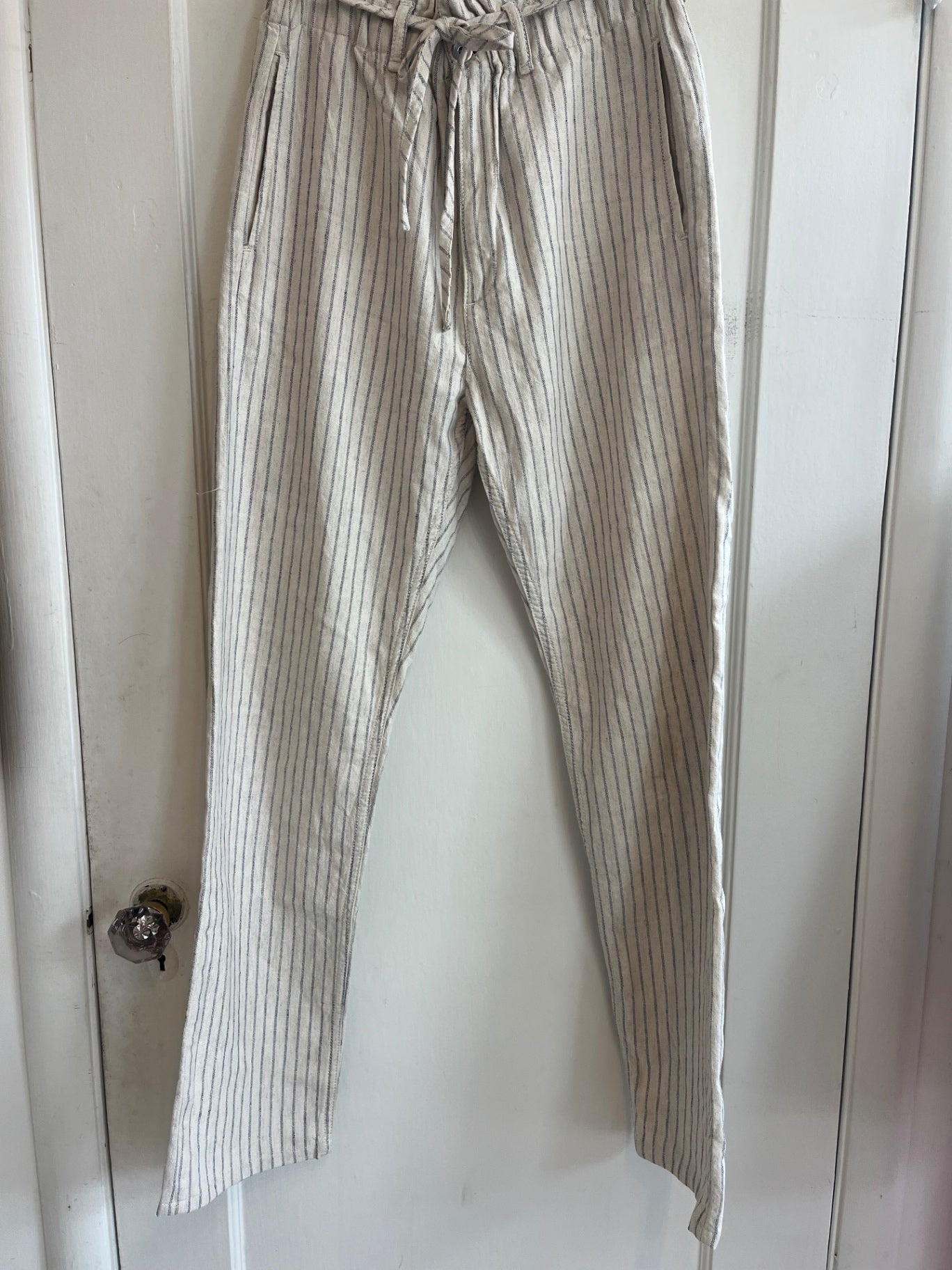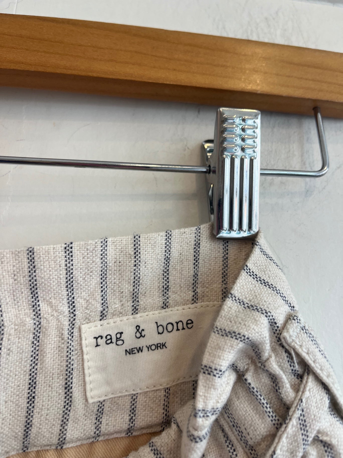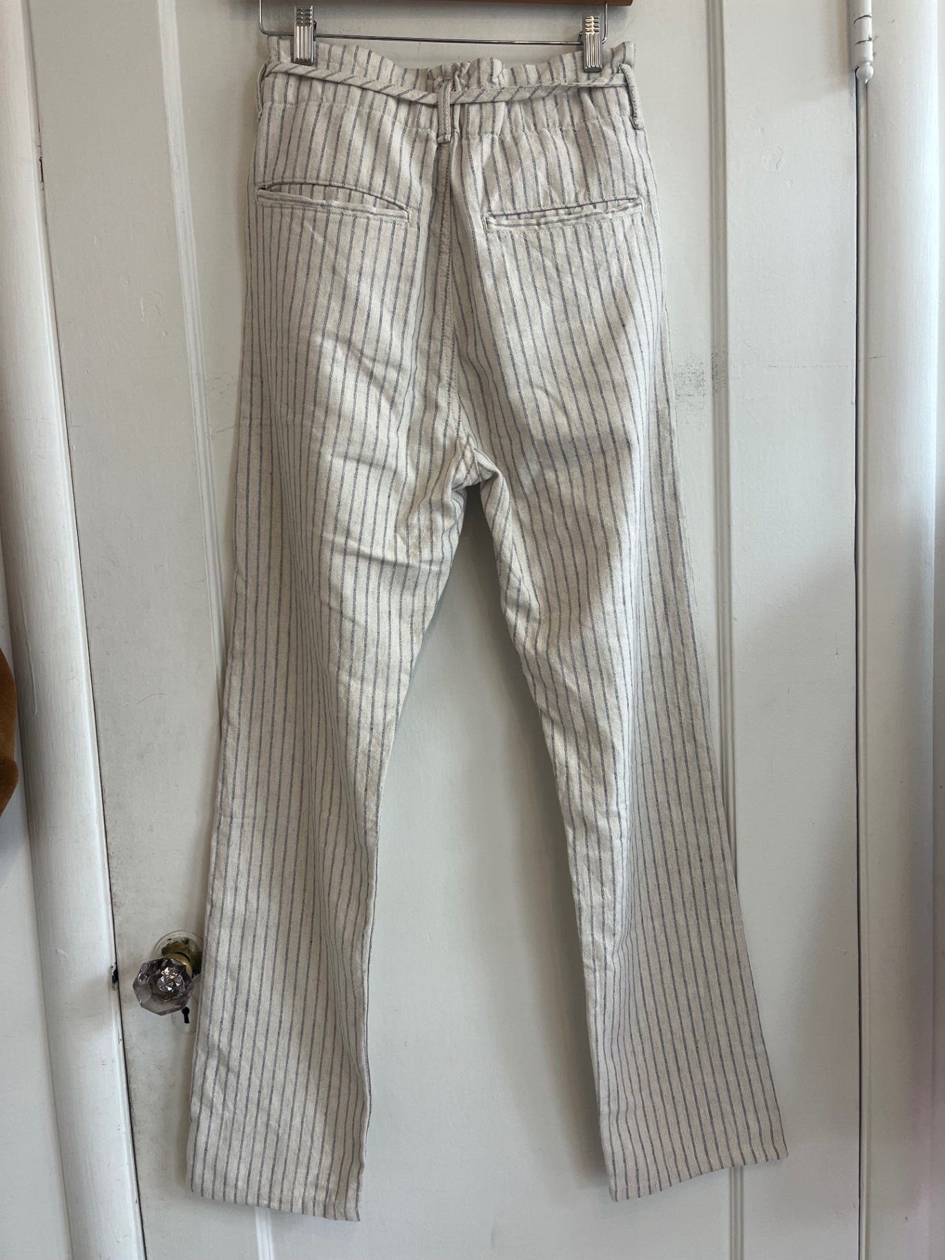 Rag & Bone cream vertical striped trousers with a soft linen feel and comfortable elastic paperbag waist. Relaxed tapered leg and tie waist.