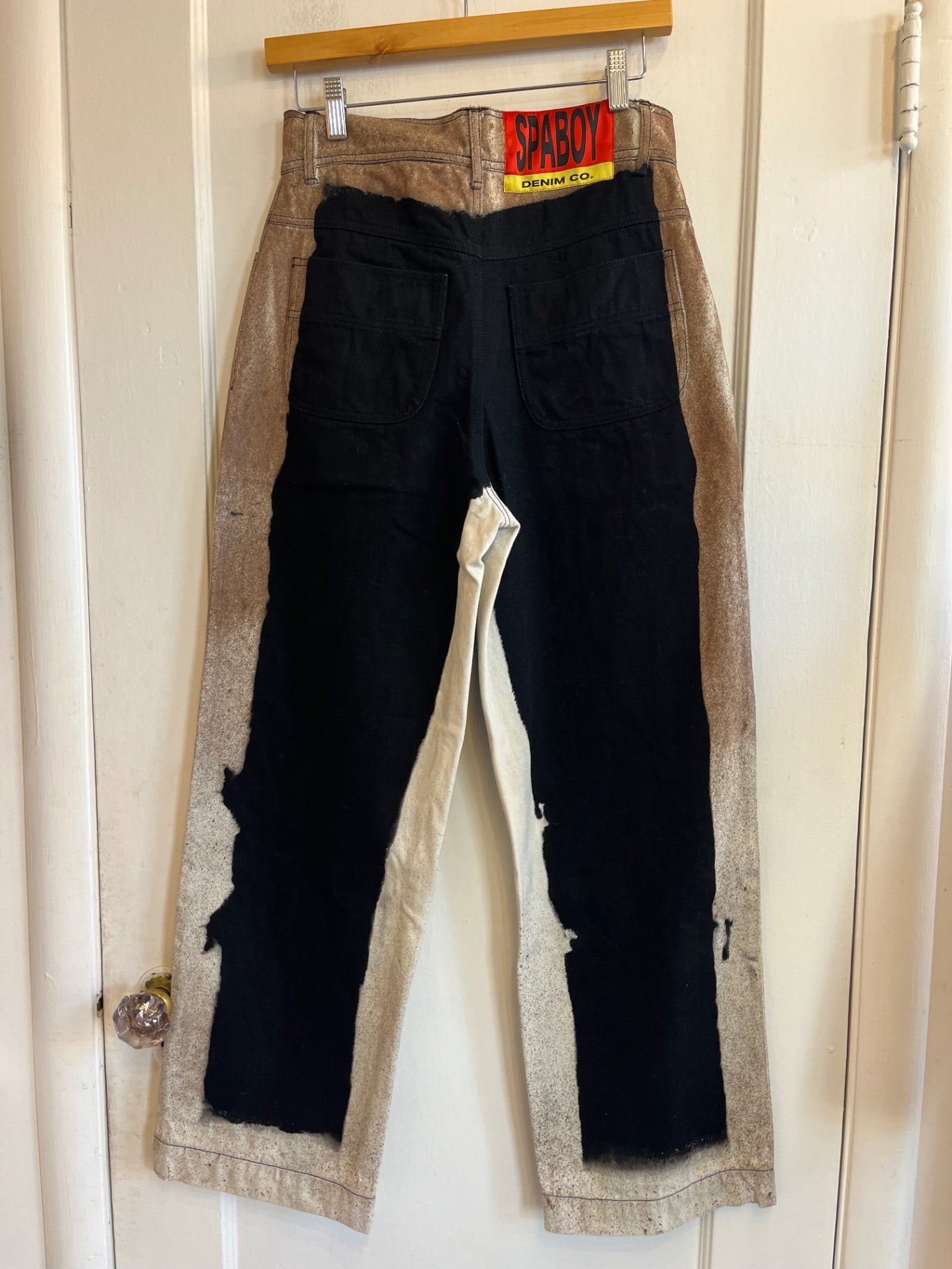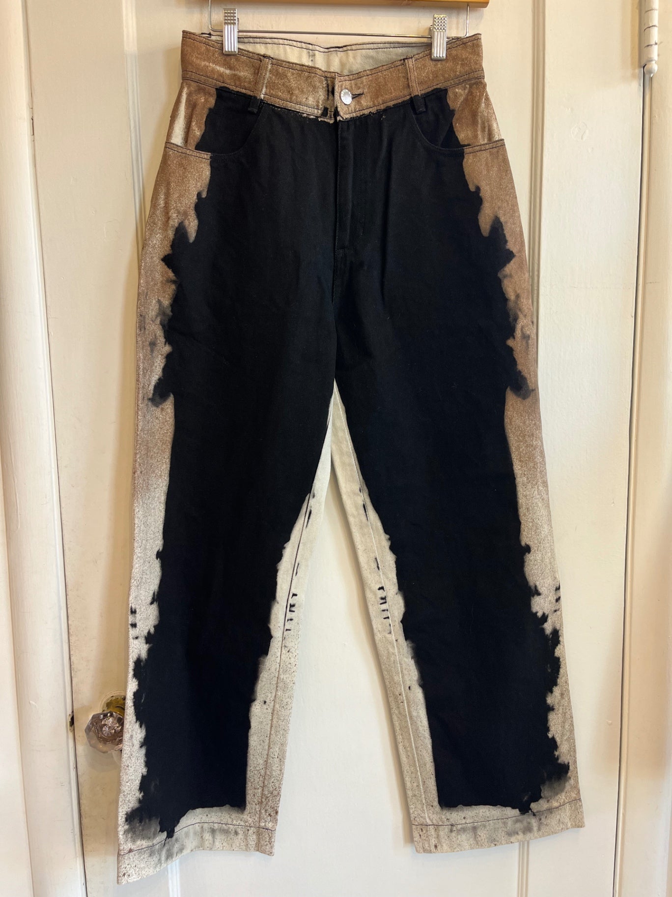 Statement two-tone pants with black center panels and faded tan outer wash. Straight leg with contrast detailing throughout.