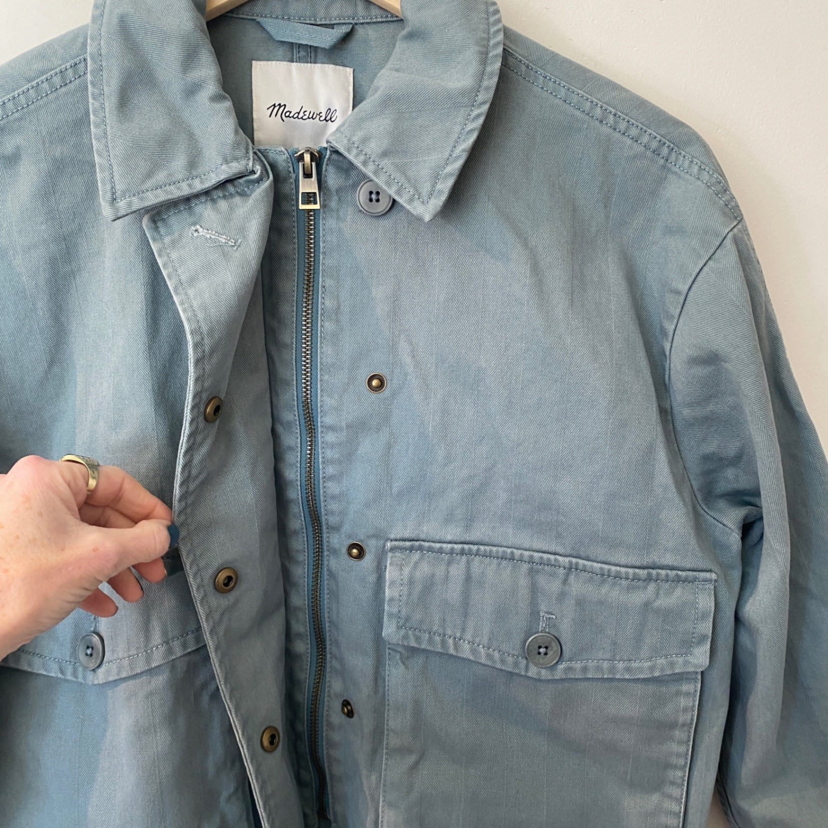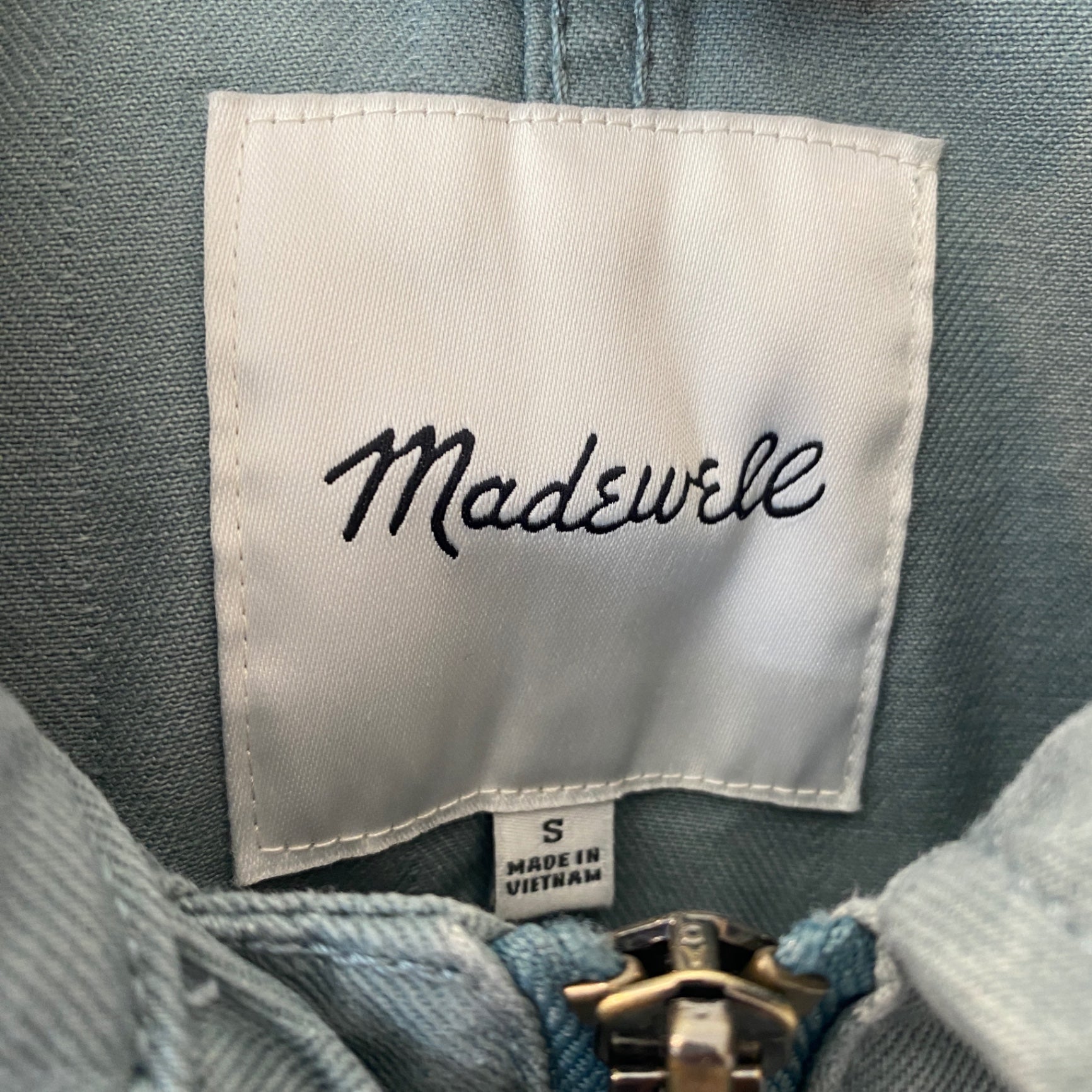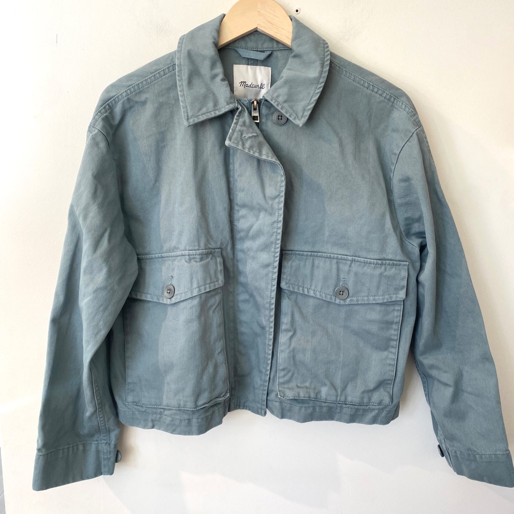 This stylish light blue jacket from Madewell adds a cool, casual touch to any outfit. Crafted from durable denim, it features a classic collar, front button closure, and multiple spacious pockets. Its versatile design makes it perfect for layering over your favorite tops. Ideal for transitional seasons, this jacket combines timelessness with modern simplicity.