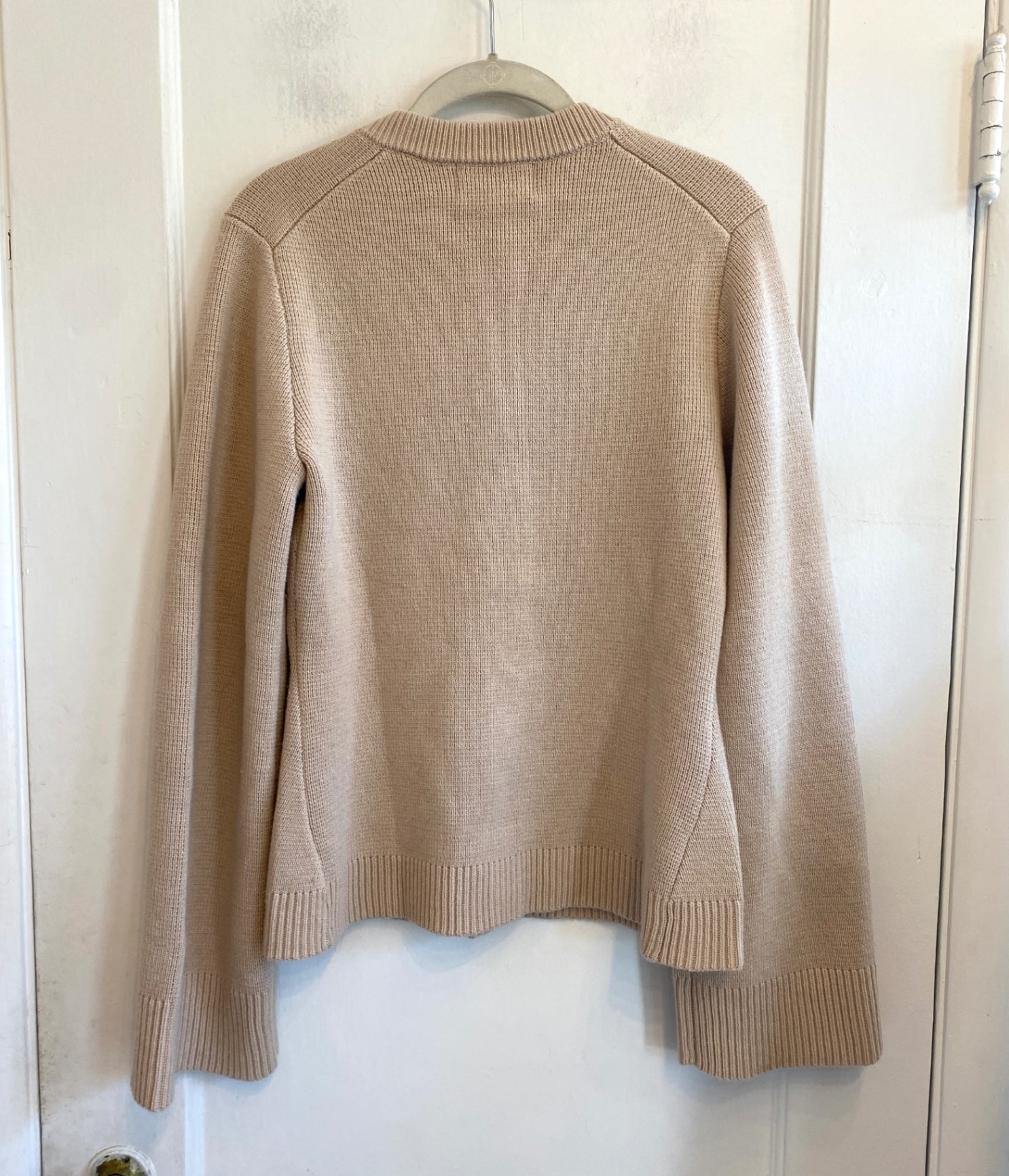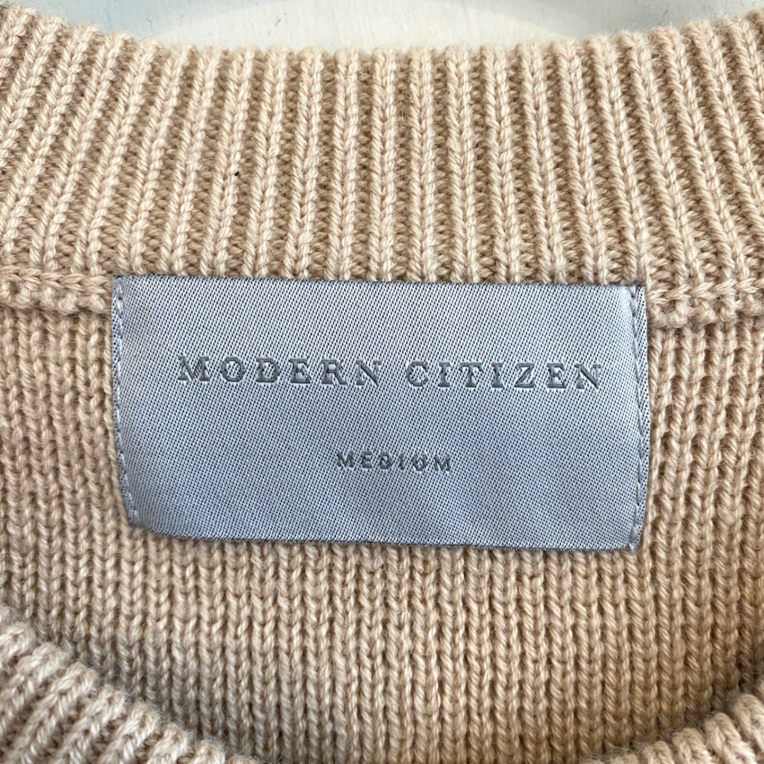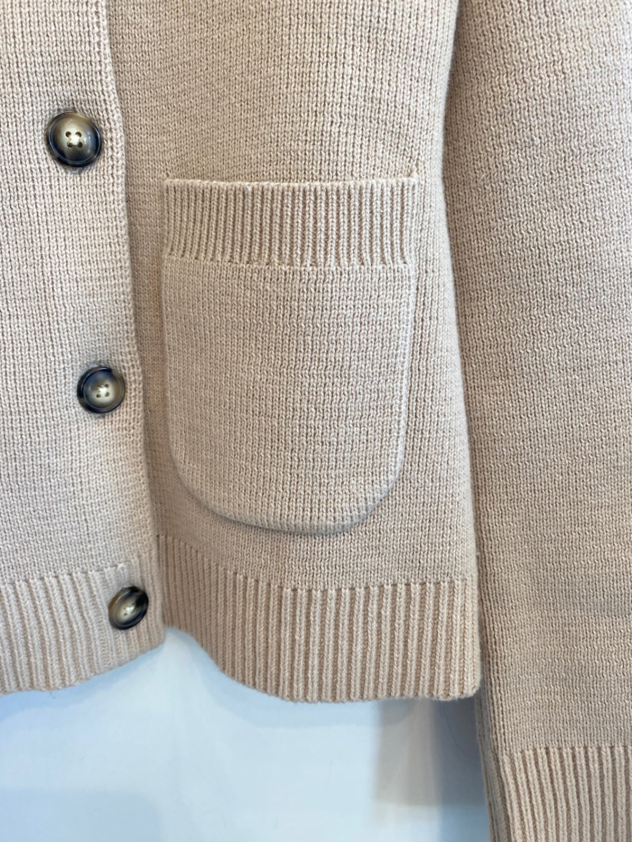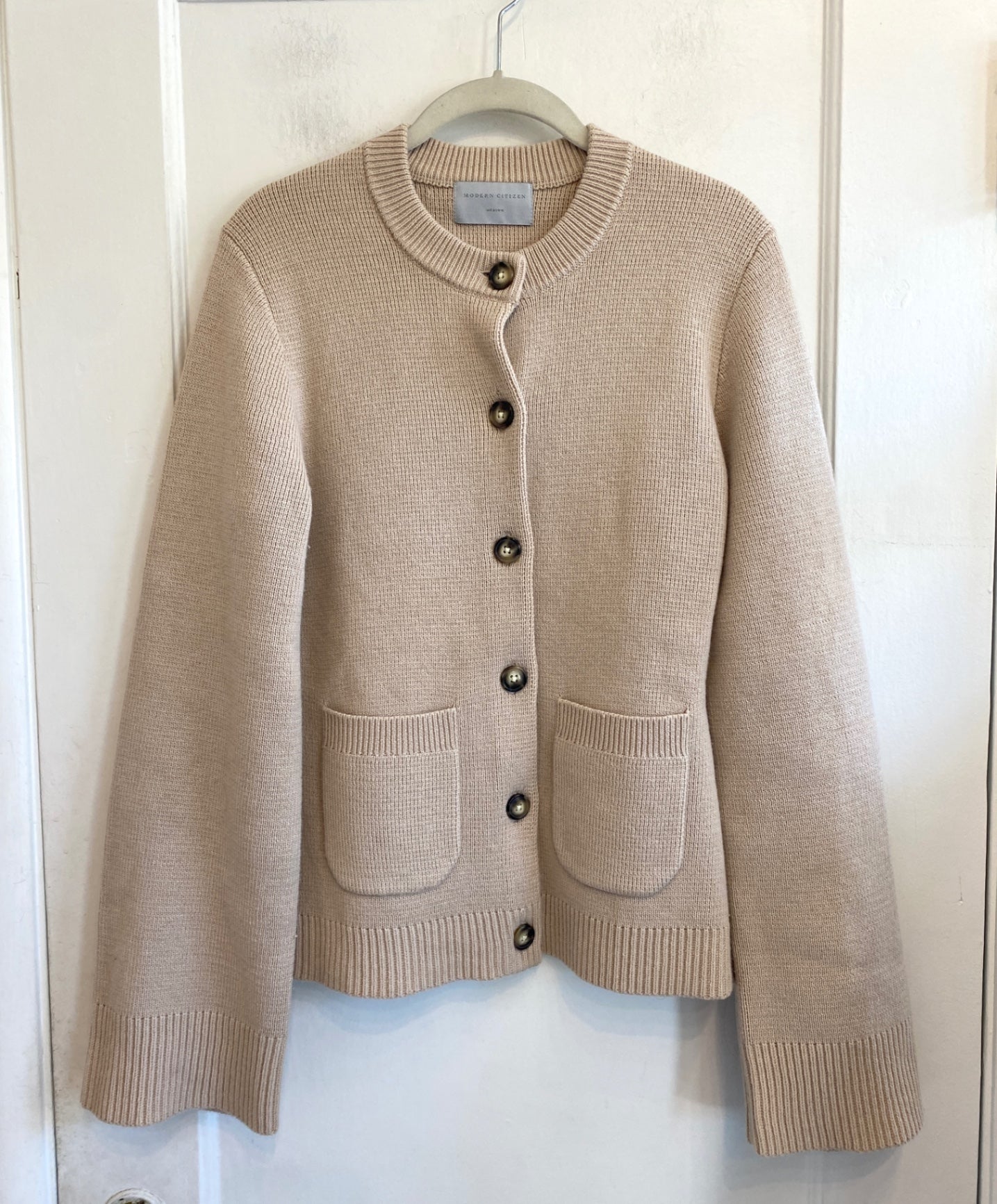 This cozy beige cardigan from Modern Citizen offers a comfortable fit with a classic ribbed design. Featuring a round neckline, it is detailed with pearl-like buttons and a front patch pocket for a charming touch. Perfect for layering, it adds warmth and style to casual or semi-formal outfits.