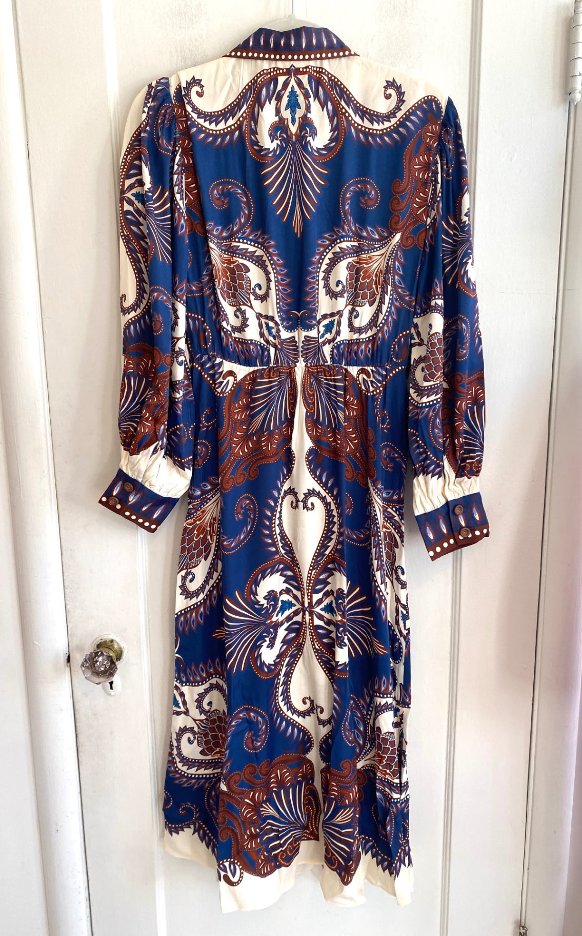 This dress showcases a vibrant, intricate paisley print that blends rich blues with warm browns and creams. Crafted from lightweight polyester, it offers a flowing silhouette perfect for a bold, bohemian style. The tie waist adds a customizable fit, making it both stylish and comfortable. Its long sleeves feature elastic cuffs, allowing versatility for different looks. Ideal for summer outings or casual gatherings, this dress is a statement piece with a unique artistic flair.