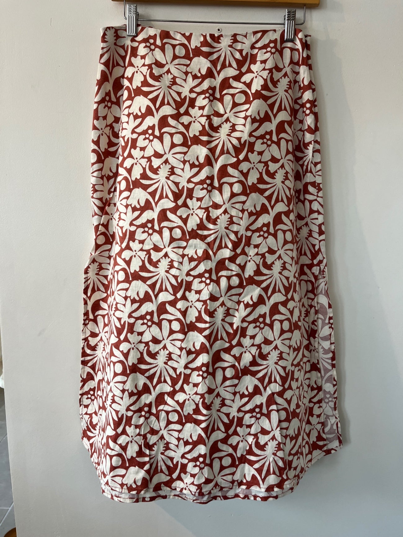 Marine Layer linen blend printed midi skirt, with slit on the side.
