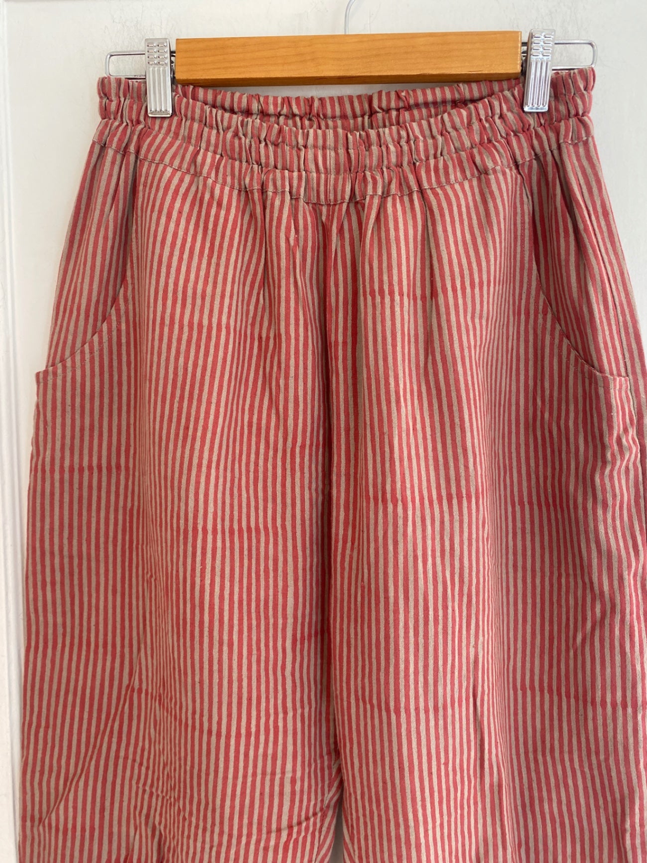 These relaxed fit pants feature a charming red and beige vertical stripe pattern, perfect for casual or laid-back summer days. The elastic waistband ensures comfort, while the spacious pockets add practicality. Crafted from lightweight linen or cotton blend fabric, they offer breathability and easy wear. An effortless addition to your warm-weather wardrobe, these pants combine comfort with timeless striped style.