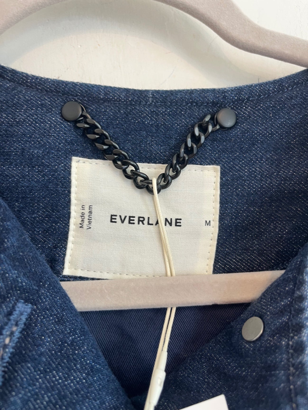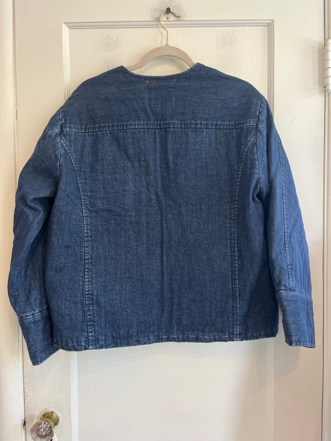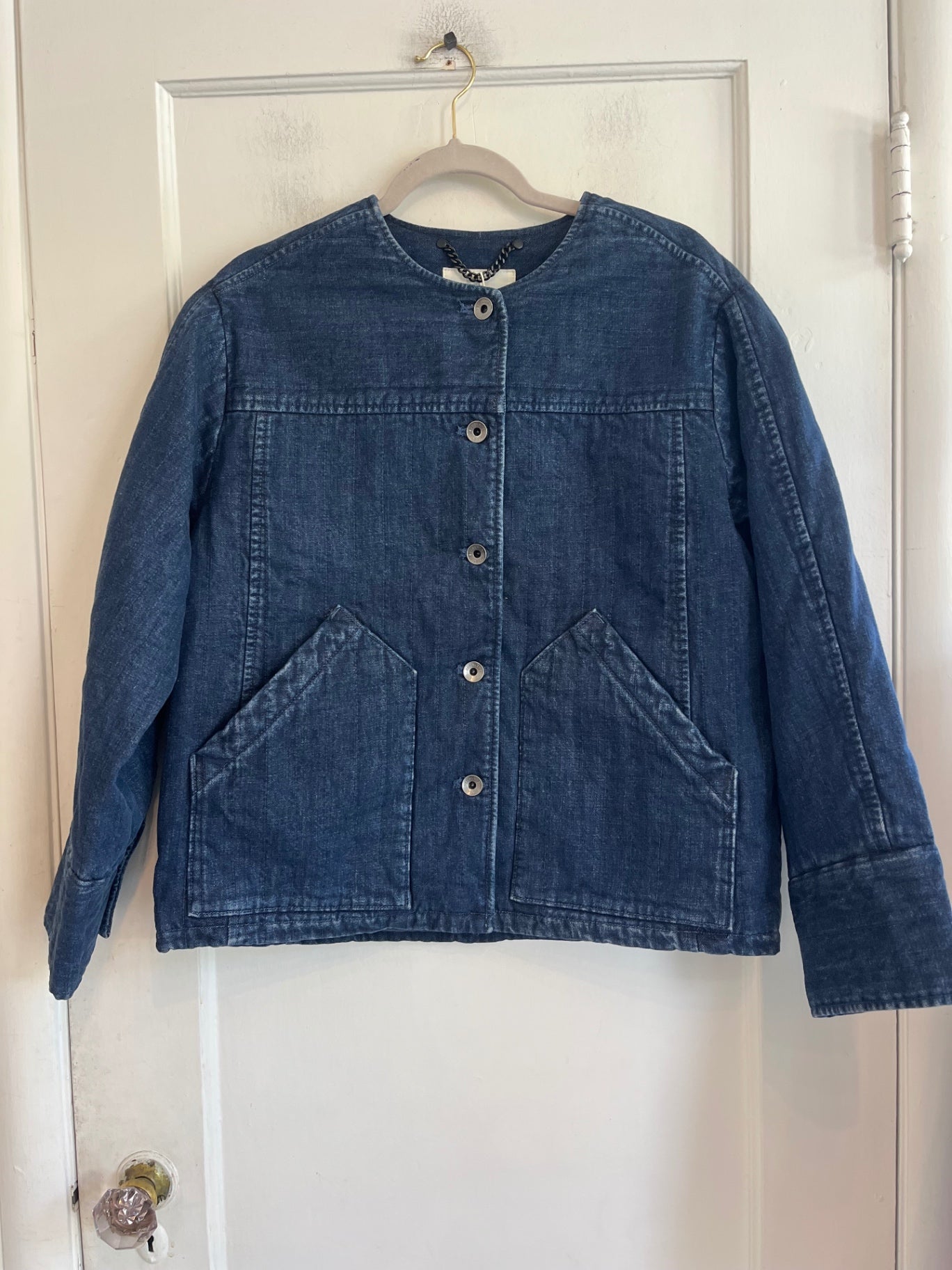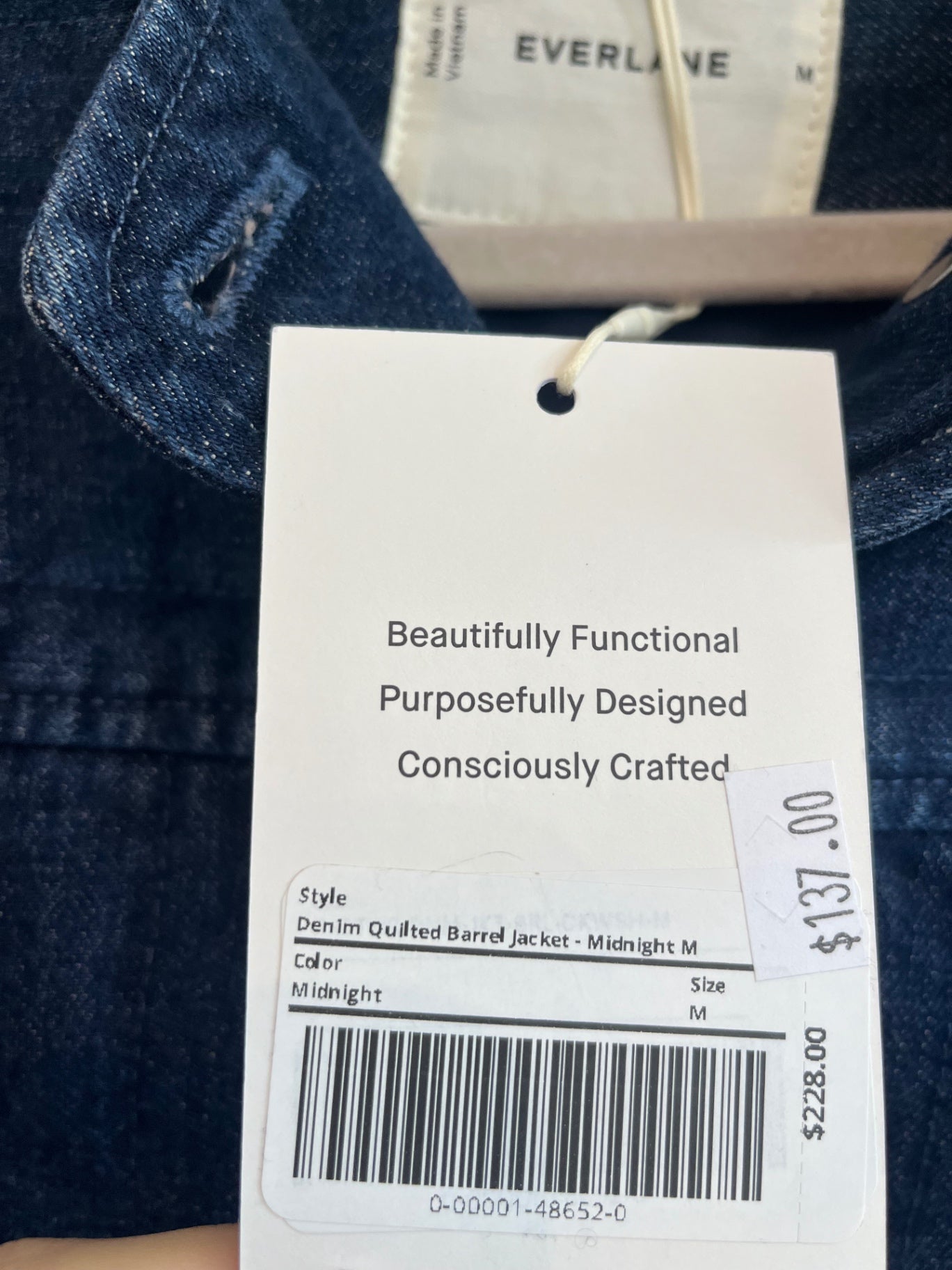 Everlane denim quilted barrel jacket in midnight. New with tags. Structured quilted denim jacket with button front and oversized patch pockets.