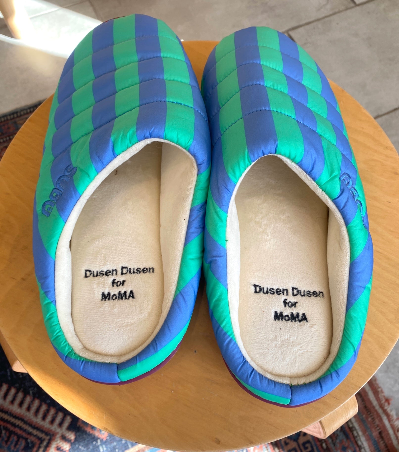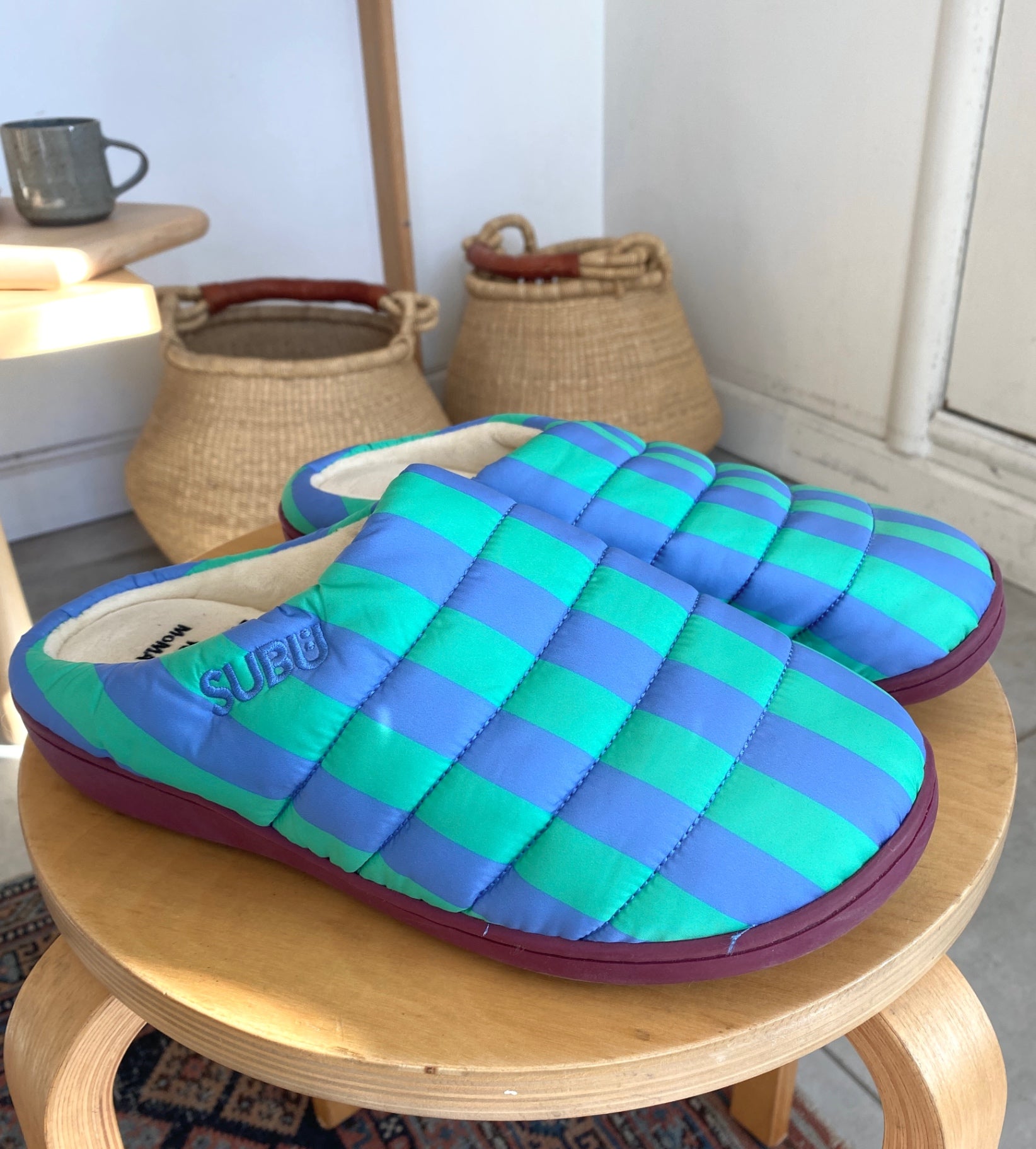 These cozy quilted slippers by Subu feature vibrant blue and green stripes, perfect for lounging at home. Crafted with a soft plush interior, they provide all-day comfort and warmth. Their slip-on style makes them easy to wear, while the durable exterior ensures lasting use. Ideal for adding a touch of comfort to your daily routine.