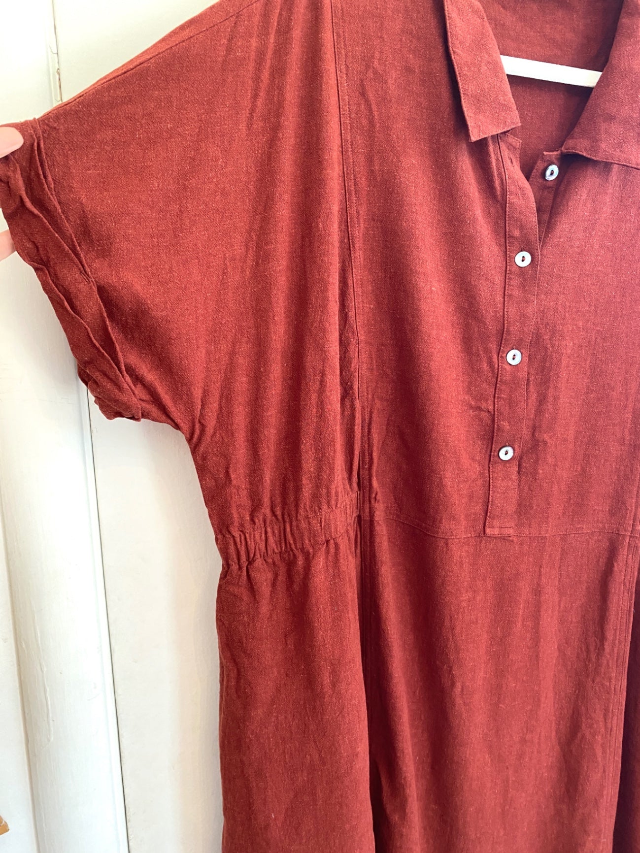 This relaxed-fit dress from Poetry features a warm red hue and a comfortable linen-viscose blend with cotton trim. Designed with a flattering cinched waist and a classic shirt collar, it offers a stylish look for casual occasions. The dress is lightweight and breathable, making it perfect for warm days. Roll-up sleeves add a touch of casual elegance. A versatile piece that pairs well with sandals or sneakers for an effortless style.