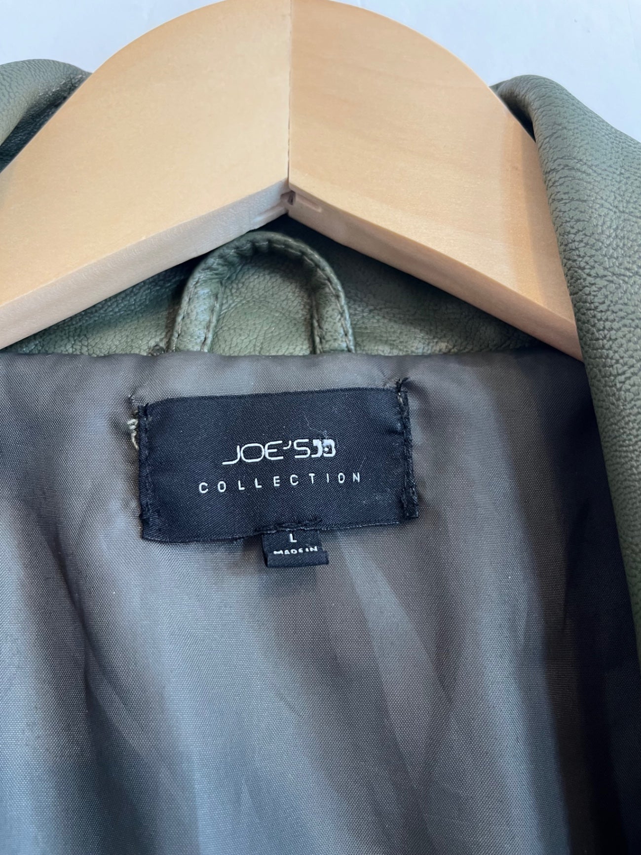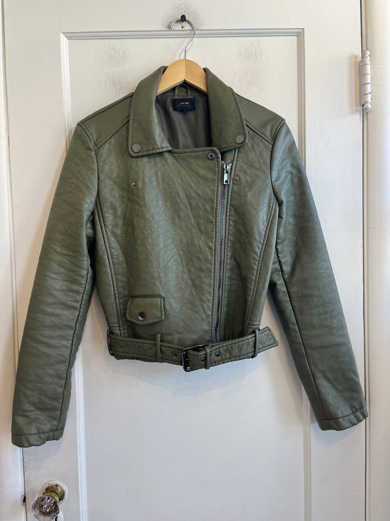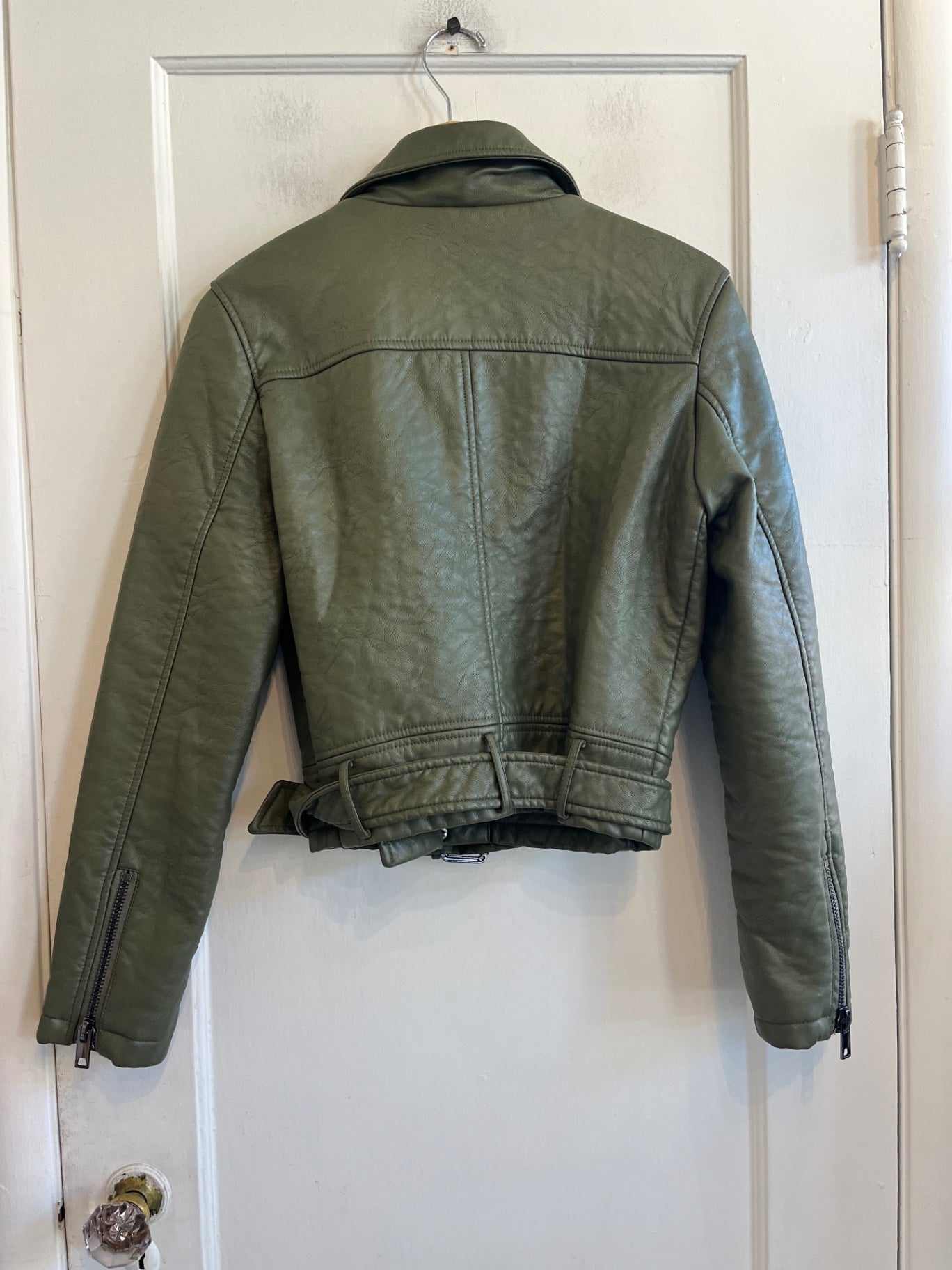 Olive green faux leather moto jacket with asymmetrical zip and belt detail.