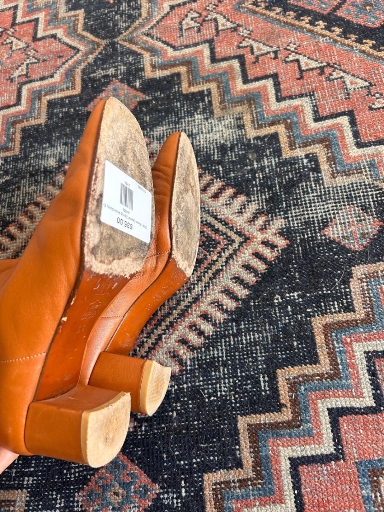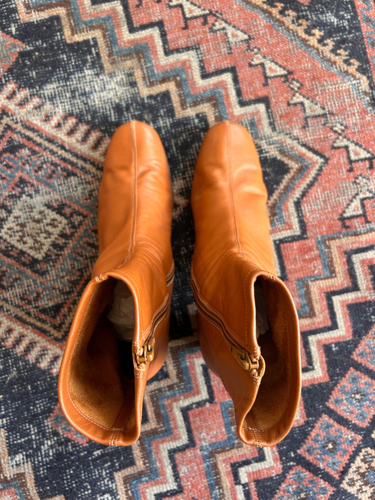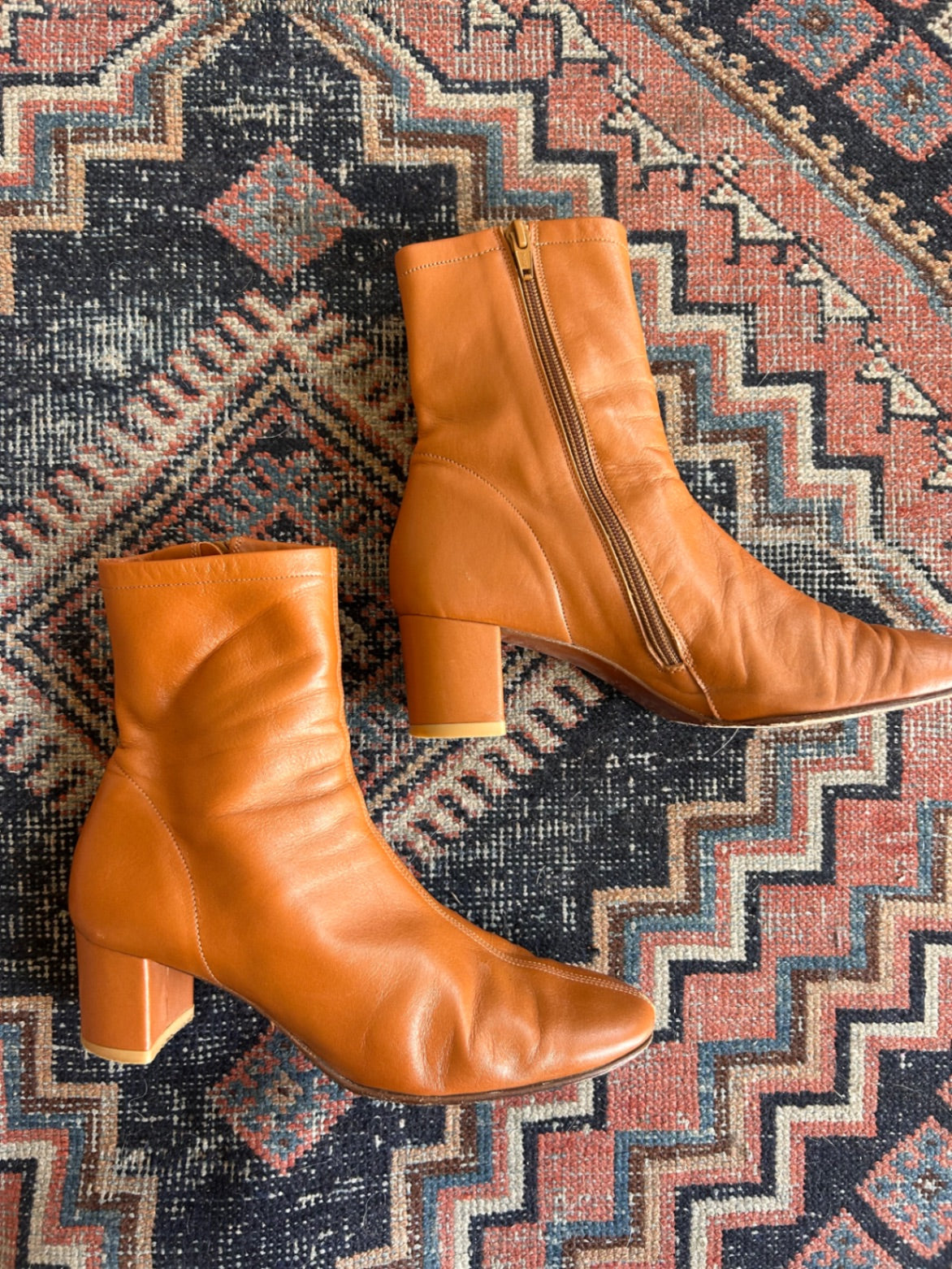 Brown leather ankle boots with a mid block heel and side zipper closure.