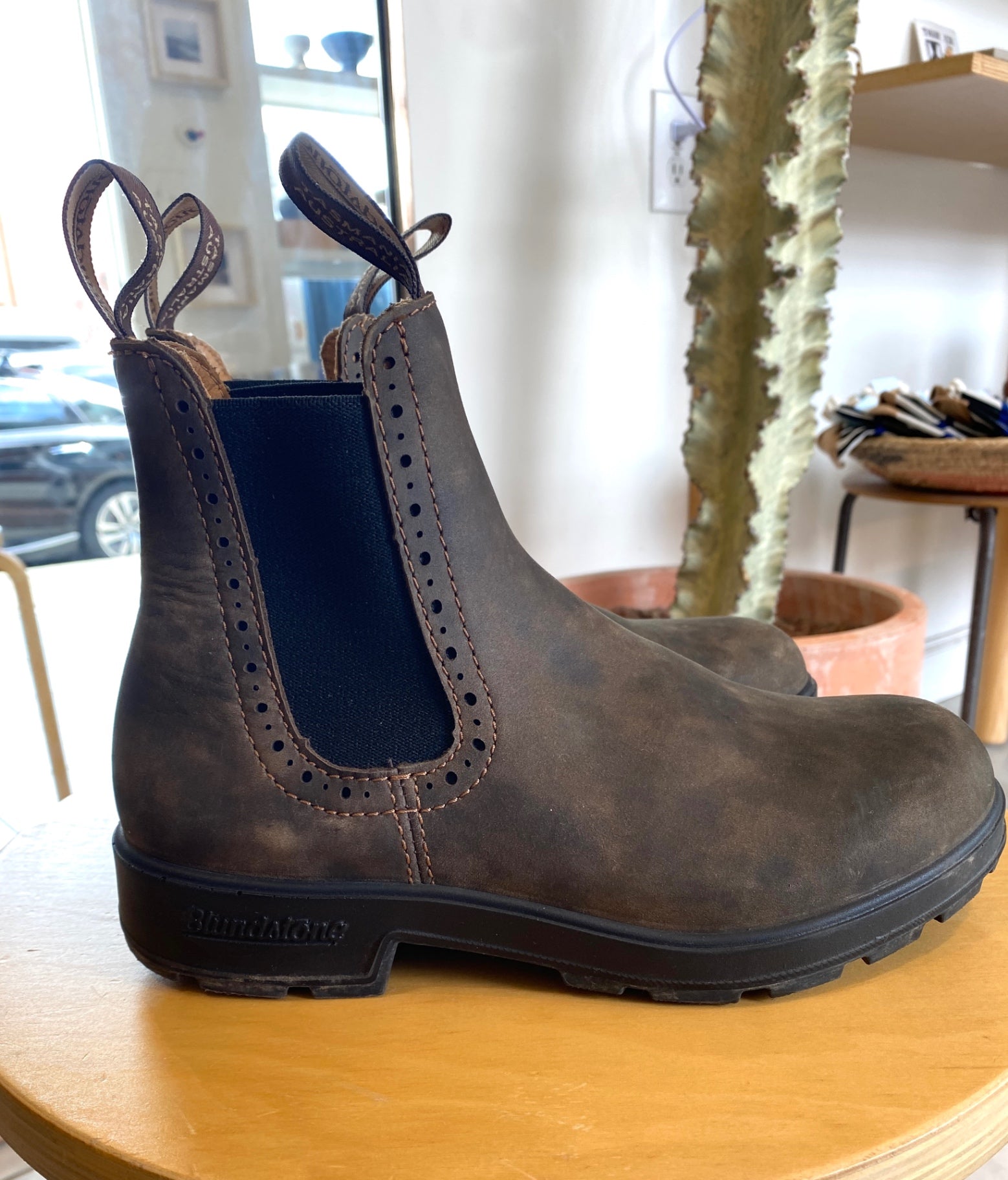 Durable leather boots by Blundstone, featuring a rugged design ideal for outdoor activities. The boots showcase a sturdy, slip-resistant sole perfect for various terrains. Their elastic side panels ensure easy wearing and a comfortable fit. The classic brown color adds versatile style to casual and workwear outfits. These boots are known for their long-lasting quality and timeless appeal.