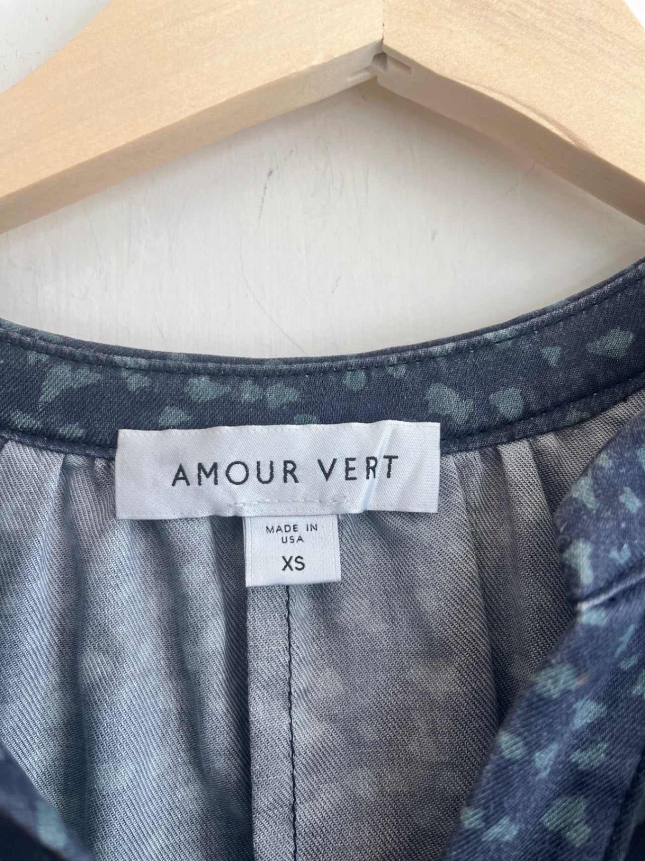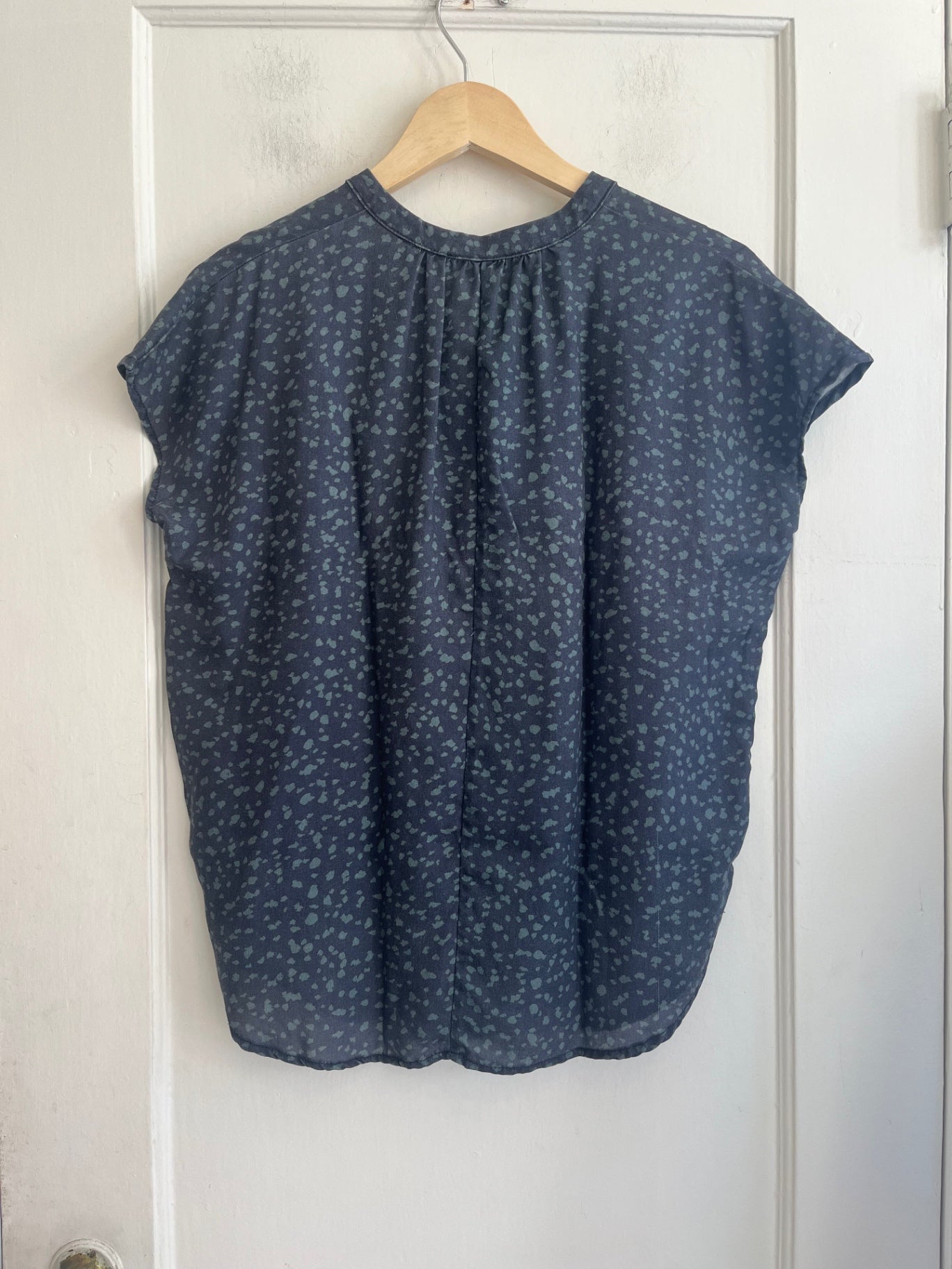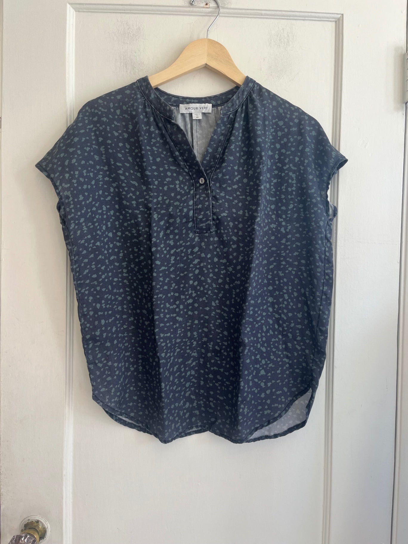 Lightweight blouse from Amour Vert in a blue-gray abstract print. Features relaxed silhouette with a split neckline and short sleeves.