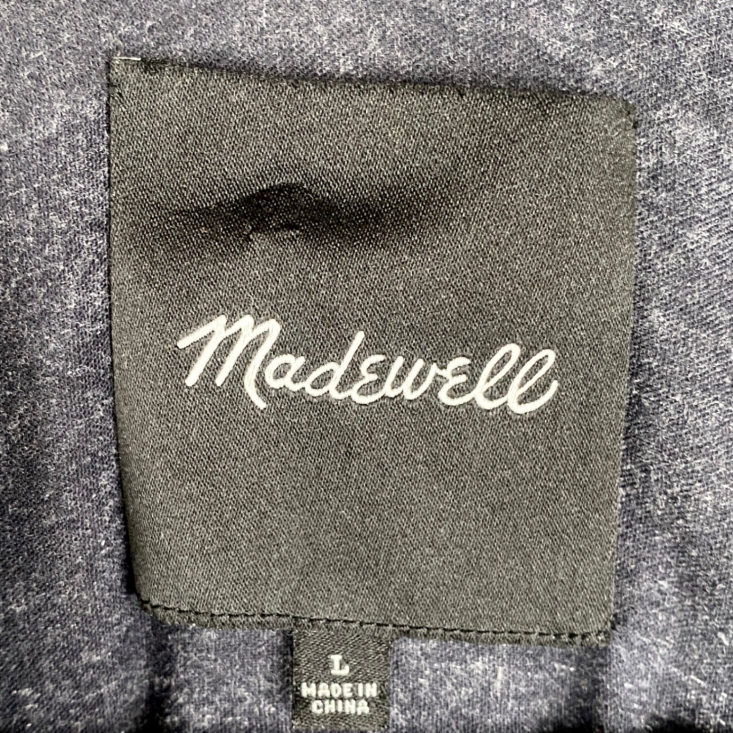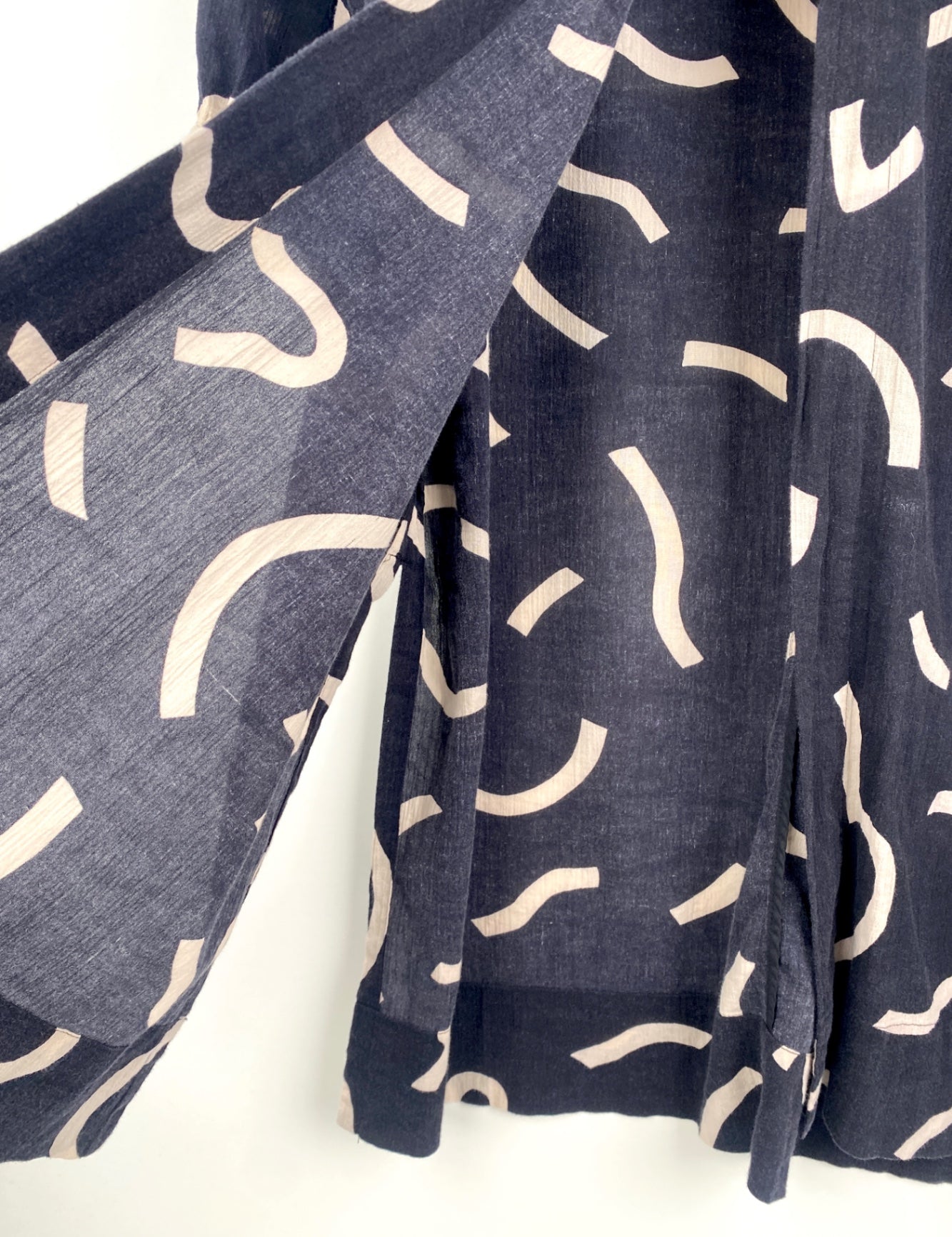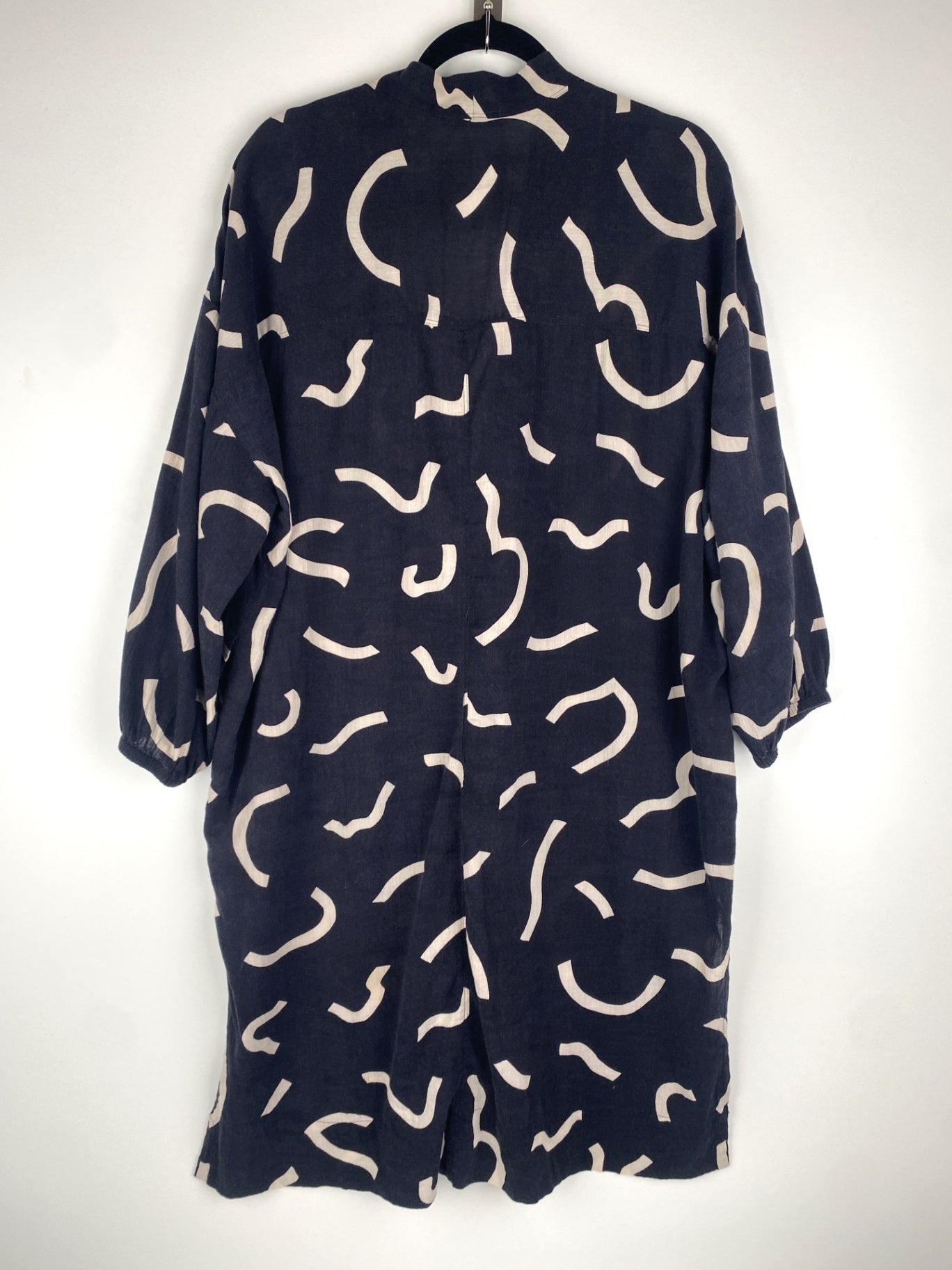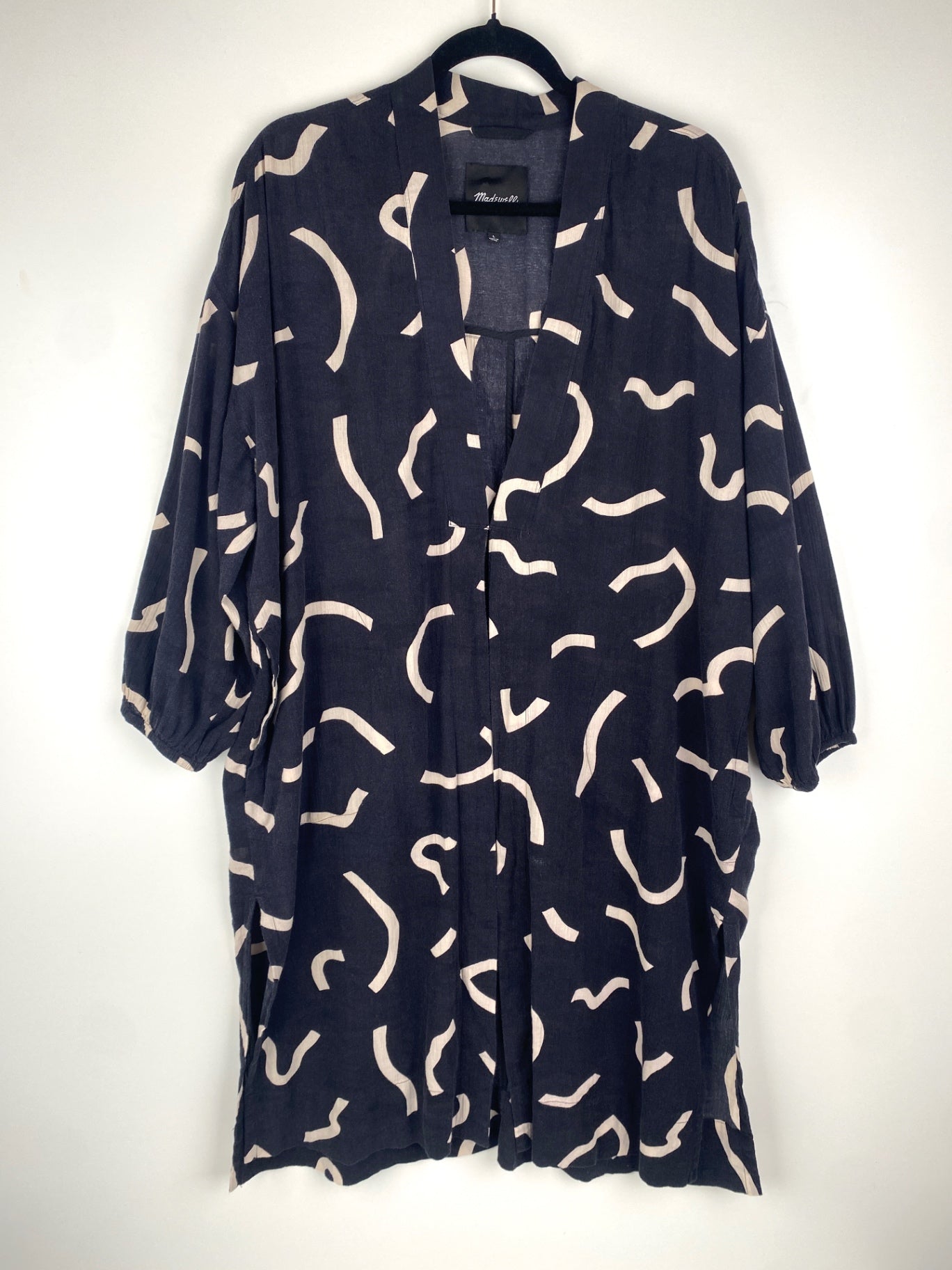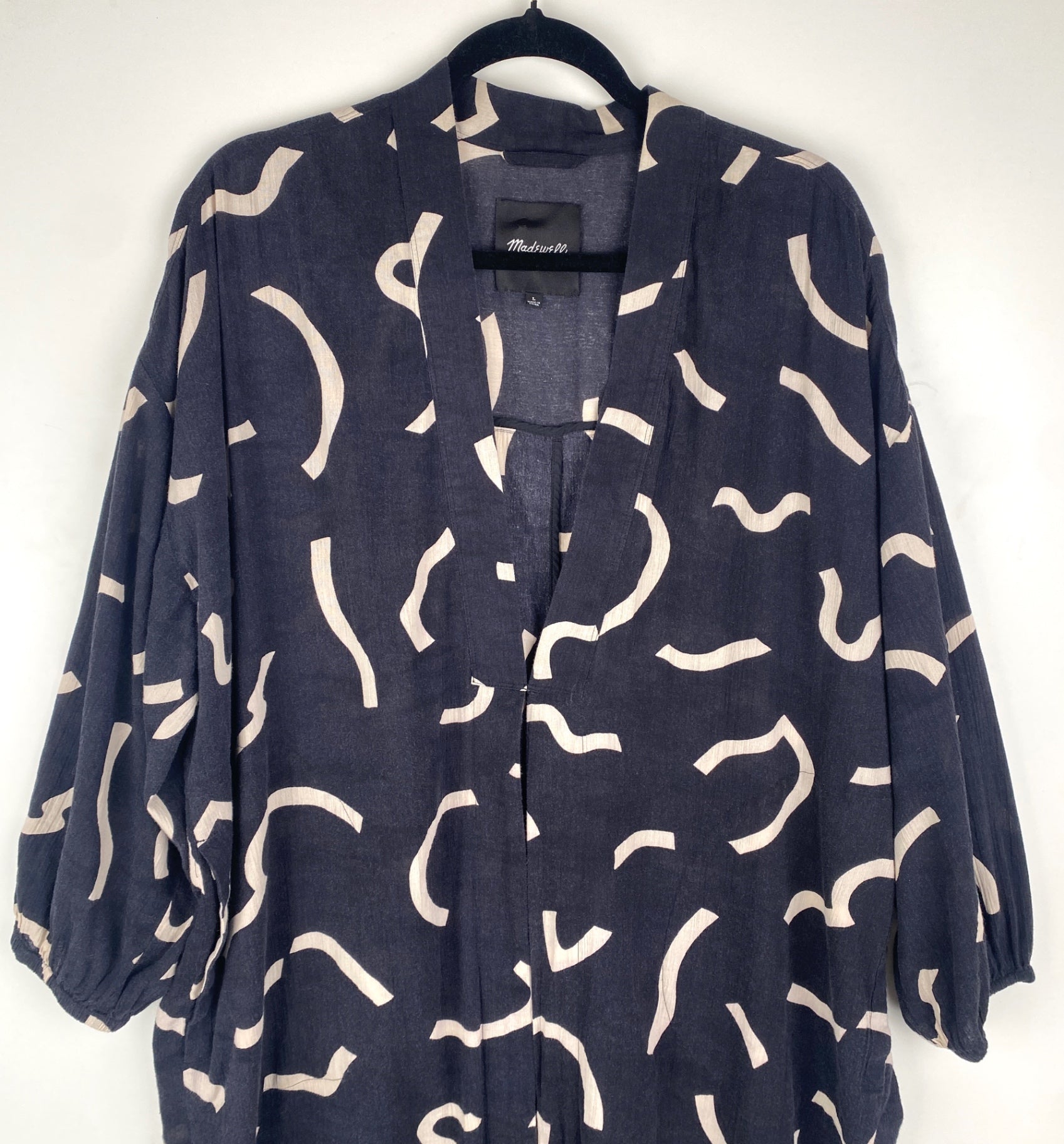 This stylish Madewell duster features a relaxed fit with a bold abstract pattern. Crafted from a breathable linen and cotton blend, it offers comfort and elegance. The blouse has a V-neckline and three-quarter balloon sleeves with elastic cuffs. Its versatile design makes it suitable for both casual and semi-formal occasions. The dark blue base with beige accents creates a striking contrast that enhances any outfit.