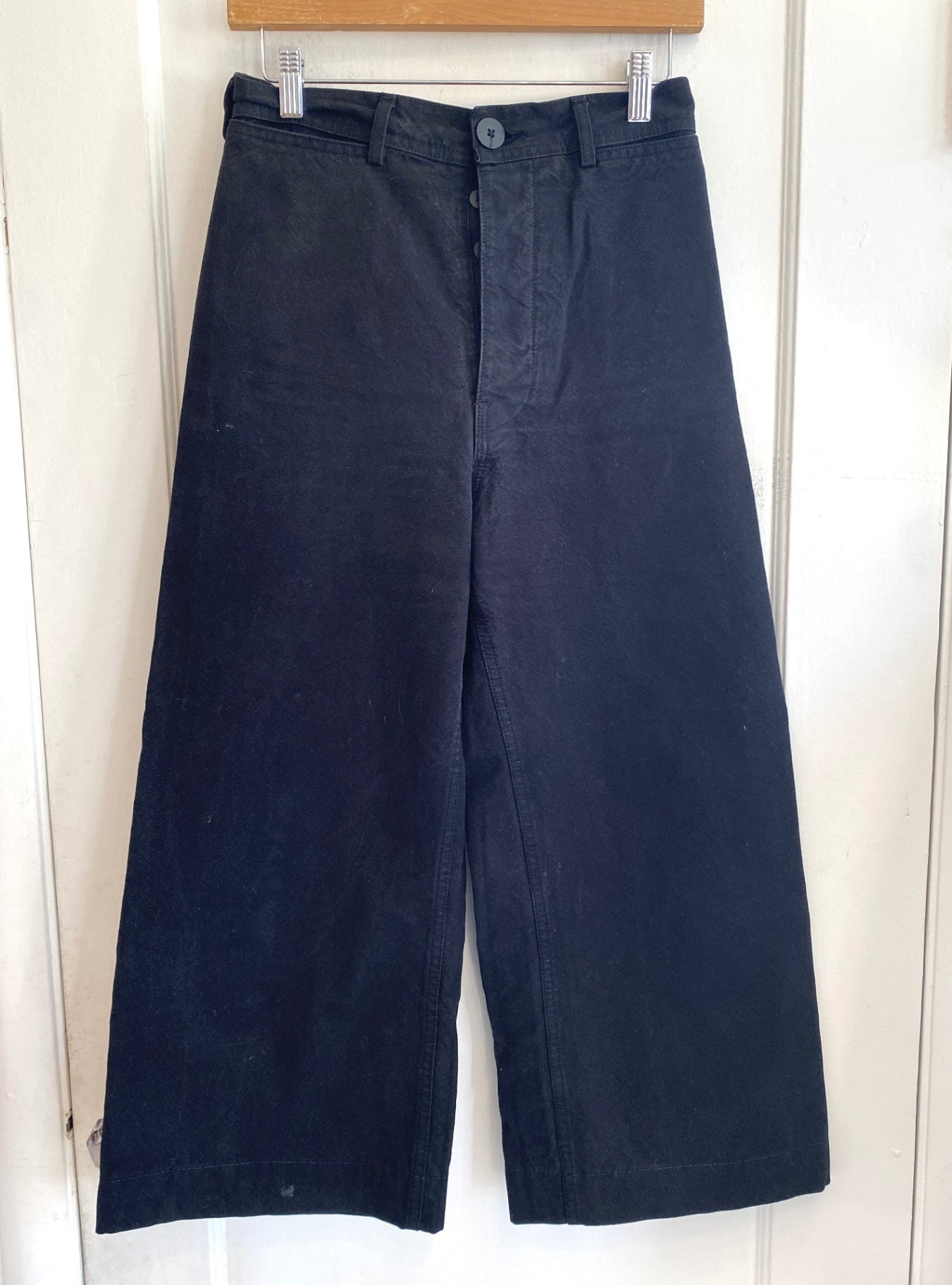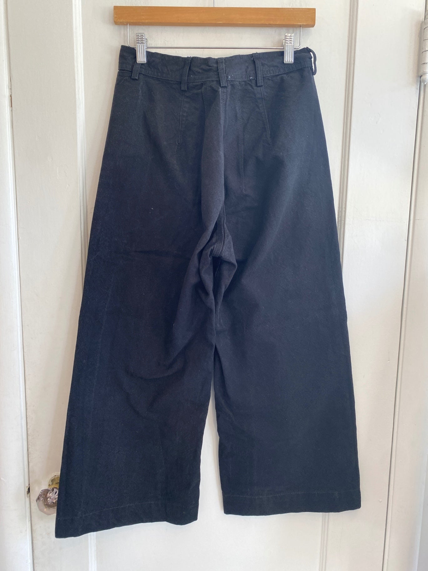 These wide-leg black pants from Jesse Kamm are crafted from high-quality cotton canvas, offering durability and style. The loose fit makes them perfect for casual or semi-formal occasions. With a sleek, minimalist design, they can be paired easily with various tops for a versatile wardrobe addition. Made with an eye for detail in California, these pants blend comfort with contemporary edge.