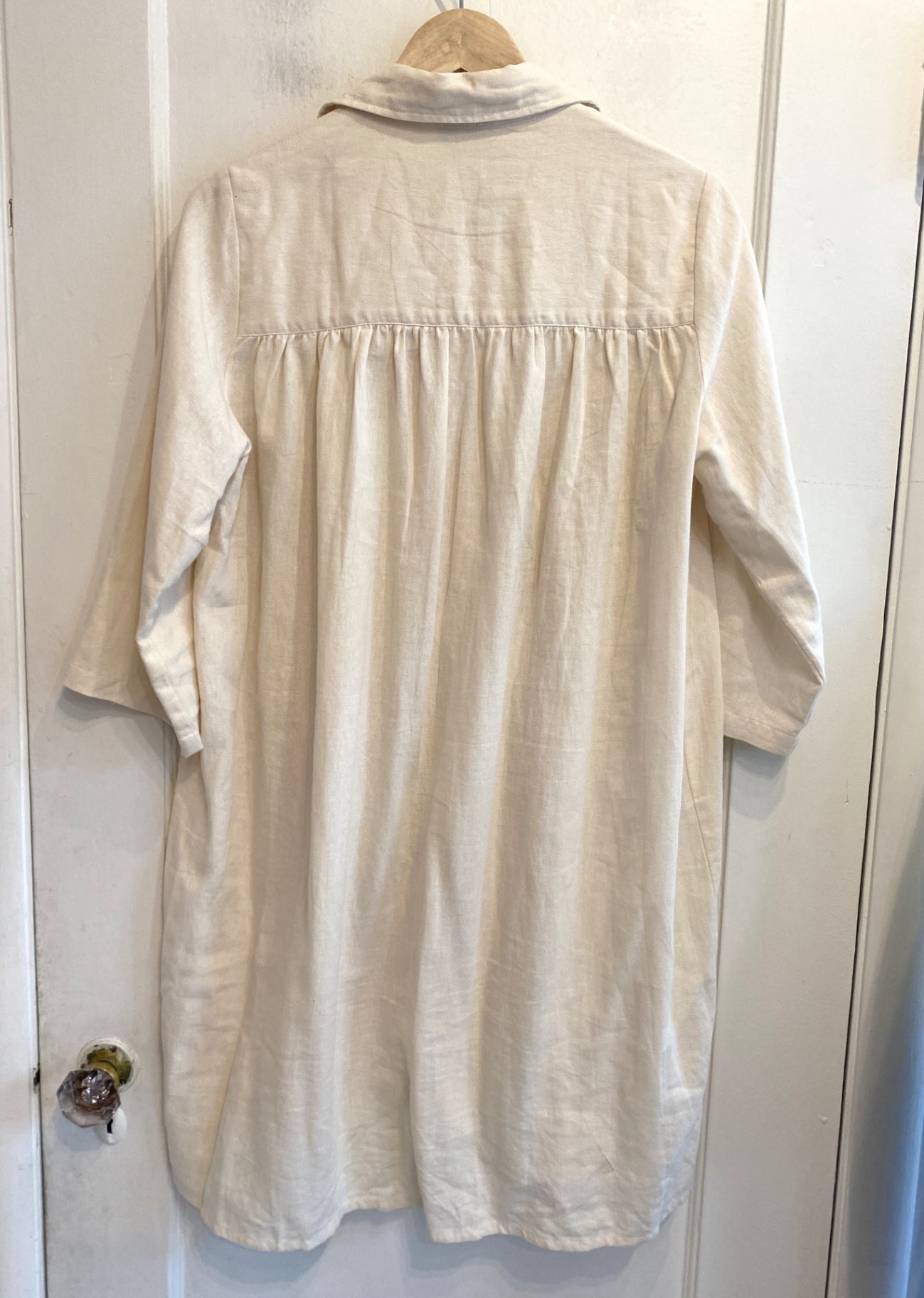 This beige linen blouse offers a relaxed yet sophisticated vibe, perfect for casual outings or layered for a chic office look. Its lightweight fabric and loose fit provide comfort and breathability, while the classic collar and button-down design add timeless style. The delicate gathering detail across the yoke elevates its aesthetic appeal, making it a versatile piece in any wardrobe.