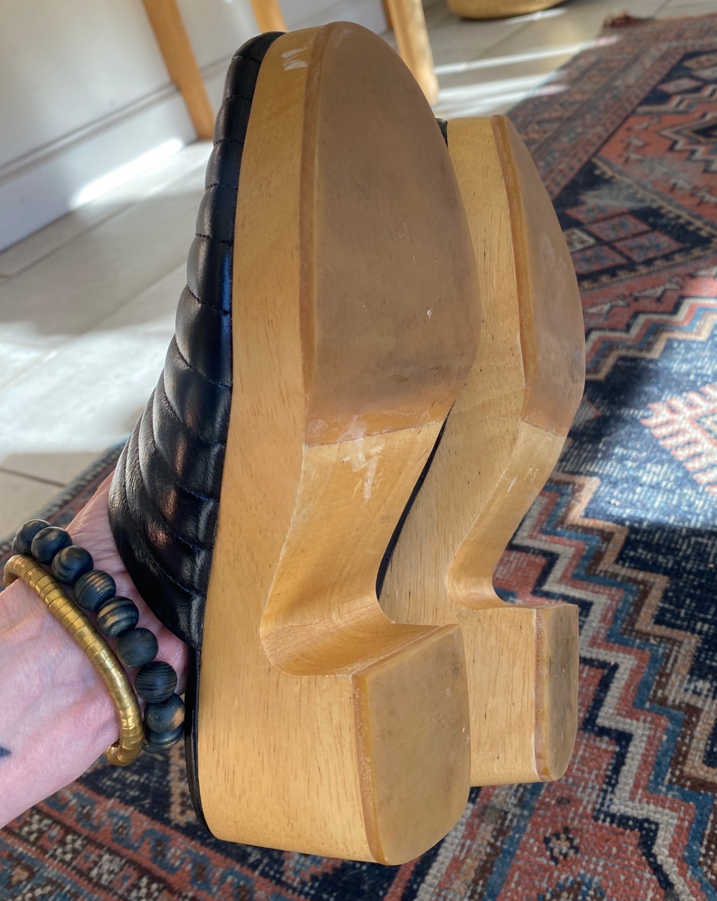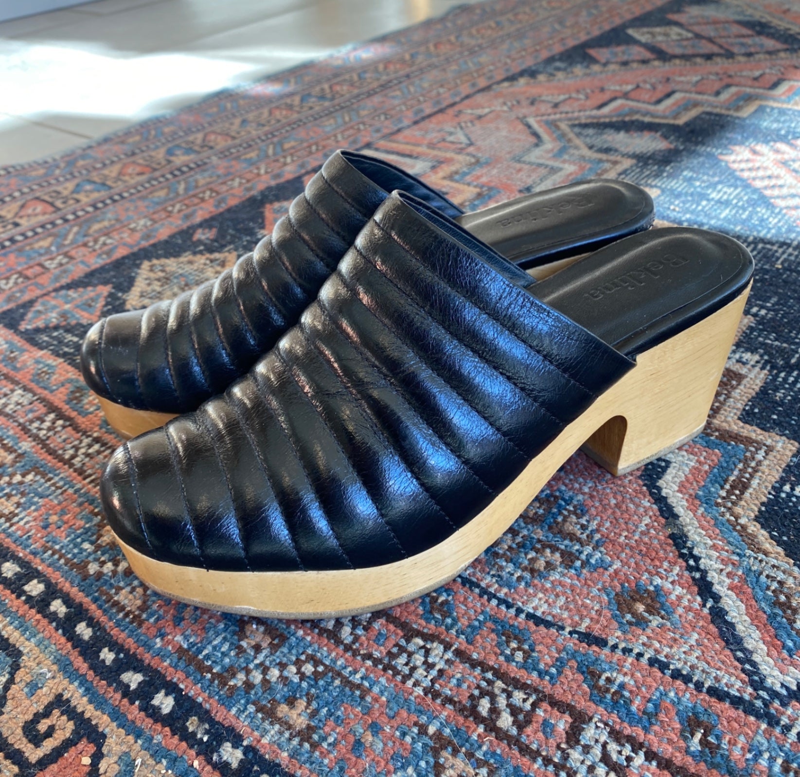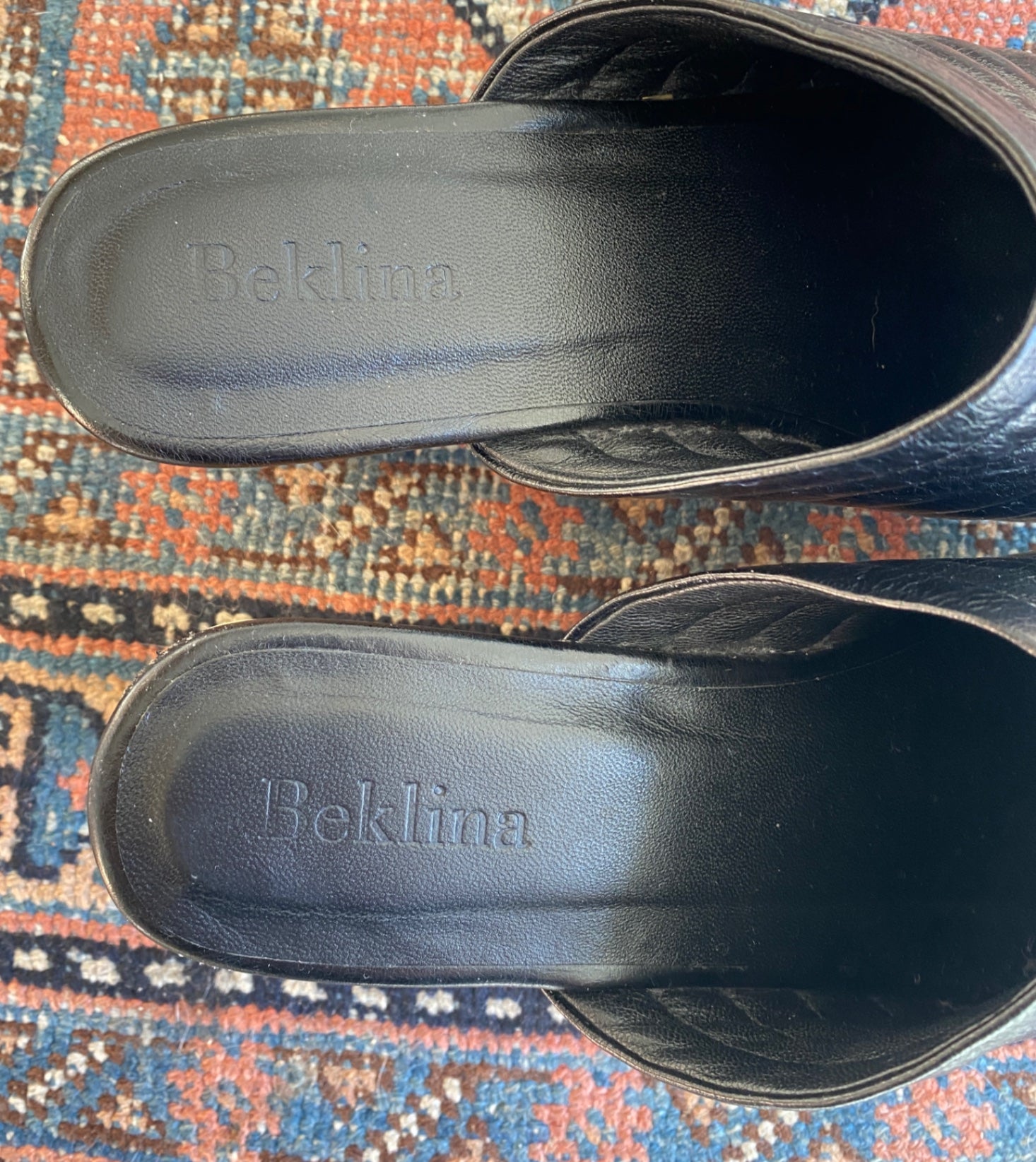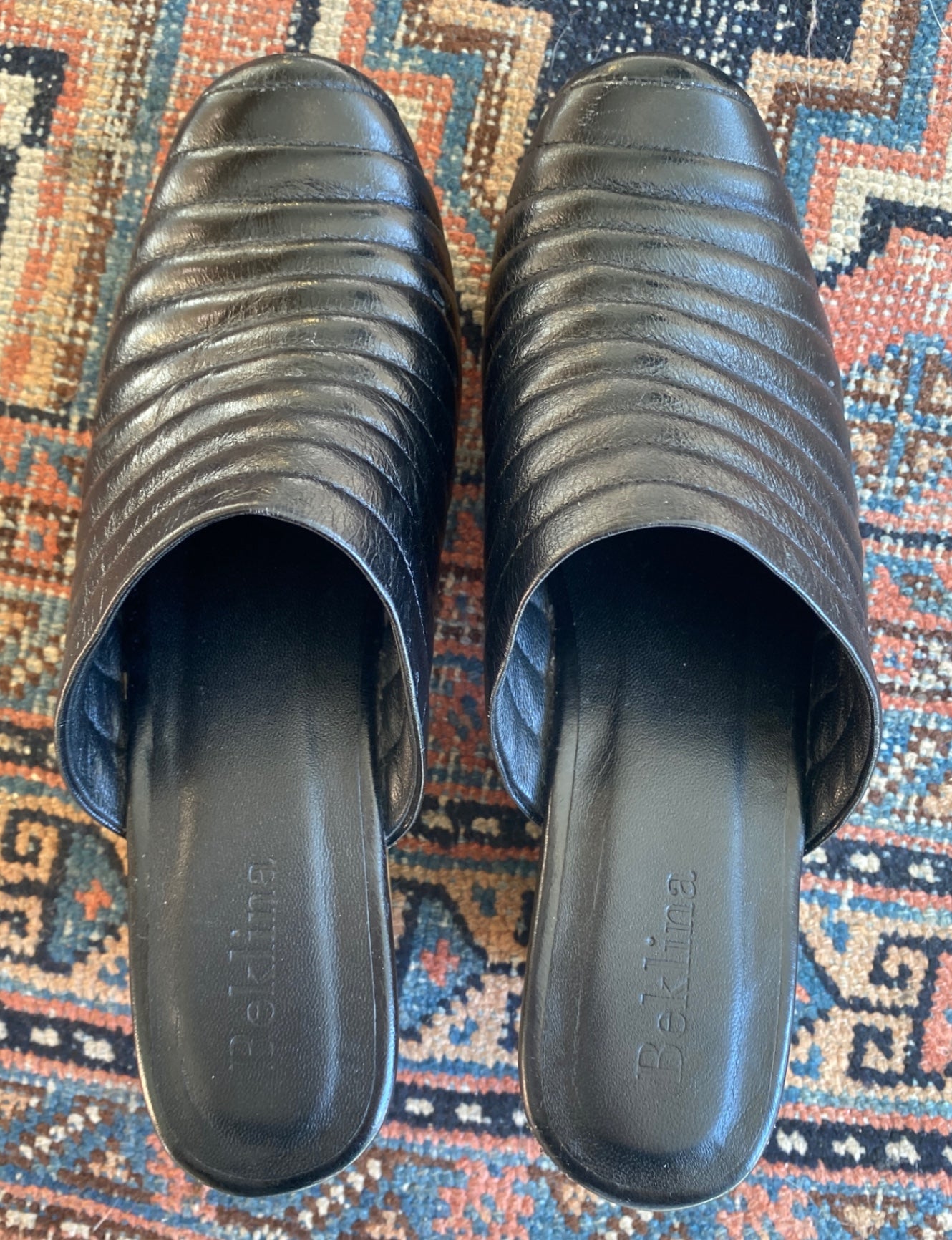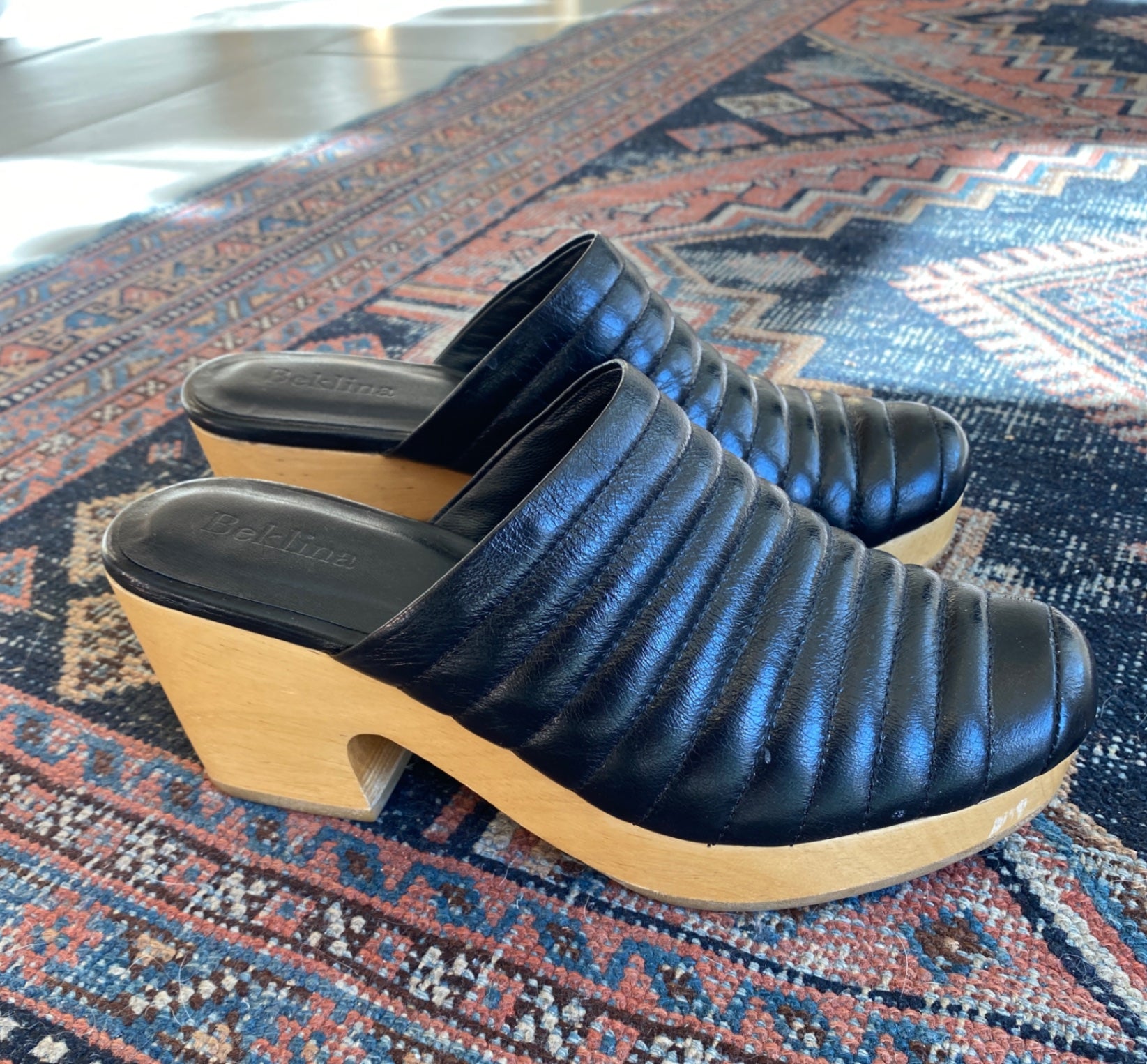Stylish black leather mules with a quilted design on the upper. These slip-on shoes feature a contemporary chunky wooden heel, offering both comfort and sophistication. Perfect for elevating casual or dressy outfits. The leather insole is embossed with the Beklina logo, adding a touch of elegance. Ideal for fashion-forward individuals seeking unique footwear.