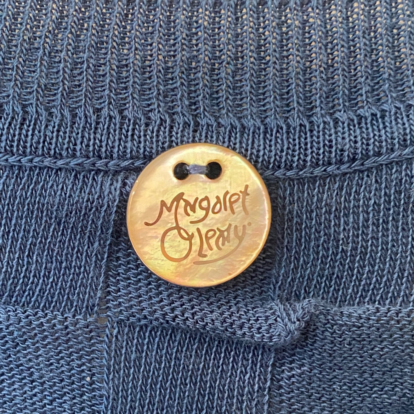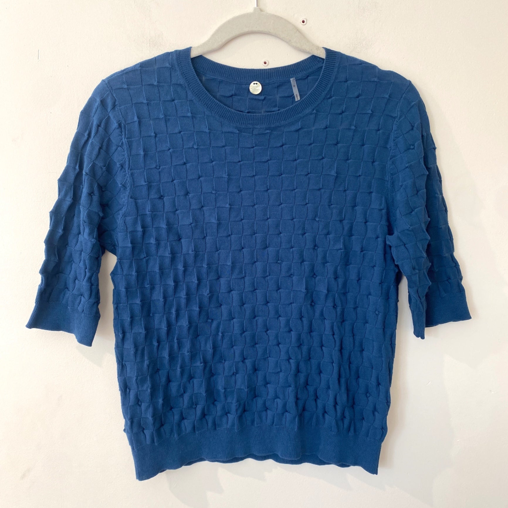 A textured blue sweater featuring a unique woven pattern that adds visual interest and depth. The 3/4 sleeves make it perfect for transitional seasons, offering both style and comfort. Crafted from cotton, it provides warmth without sacrificing breathability. Its classic round neckline makes it versatile for pairing with various outfits. The sweater showcases a stylish, casual aesthetic with an artisanal touch.