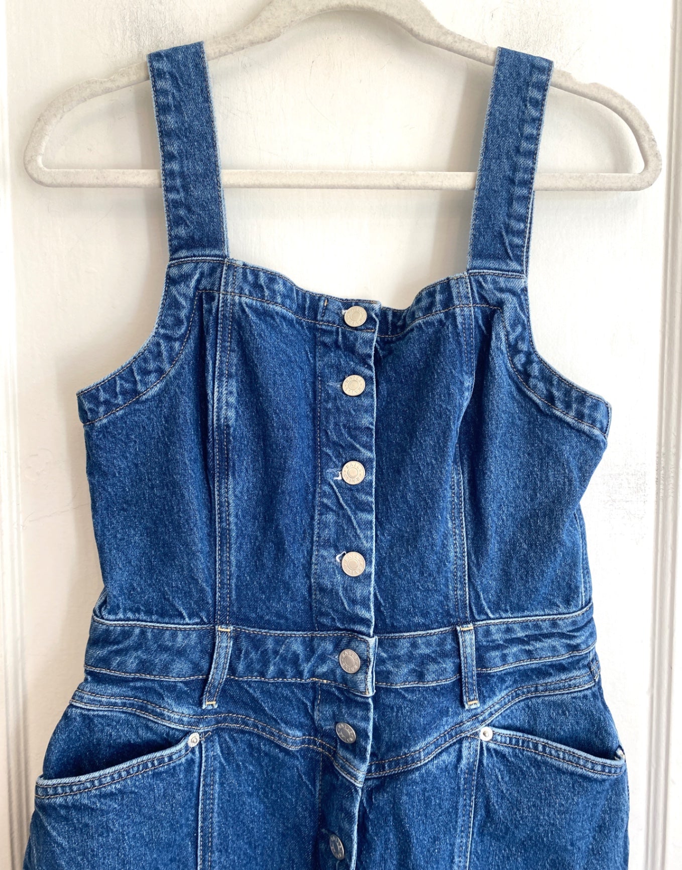 This Rails denim jumper dress combines classic style with a modern silhouette. Crafted from durable denim, it features a flattering fitted waist and a row of metal buttons down the front. Perfect for casual outings or a relaxed day, it's comfortable and effortlessly chic. The sleeveless design and structured fit make it a versatile addition to any wardrobe.
