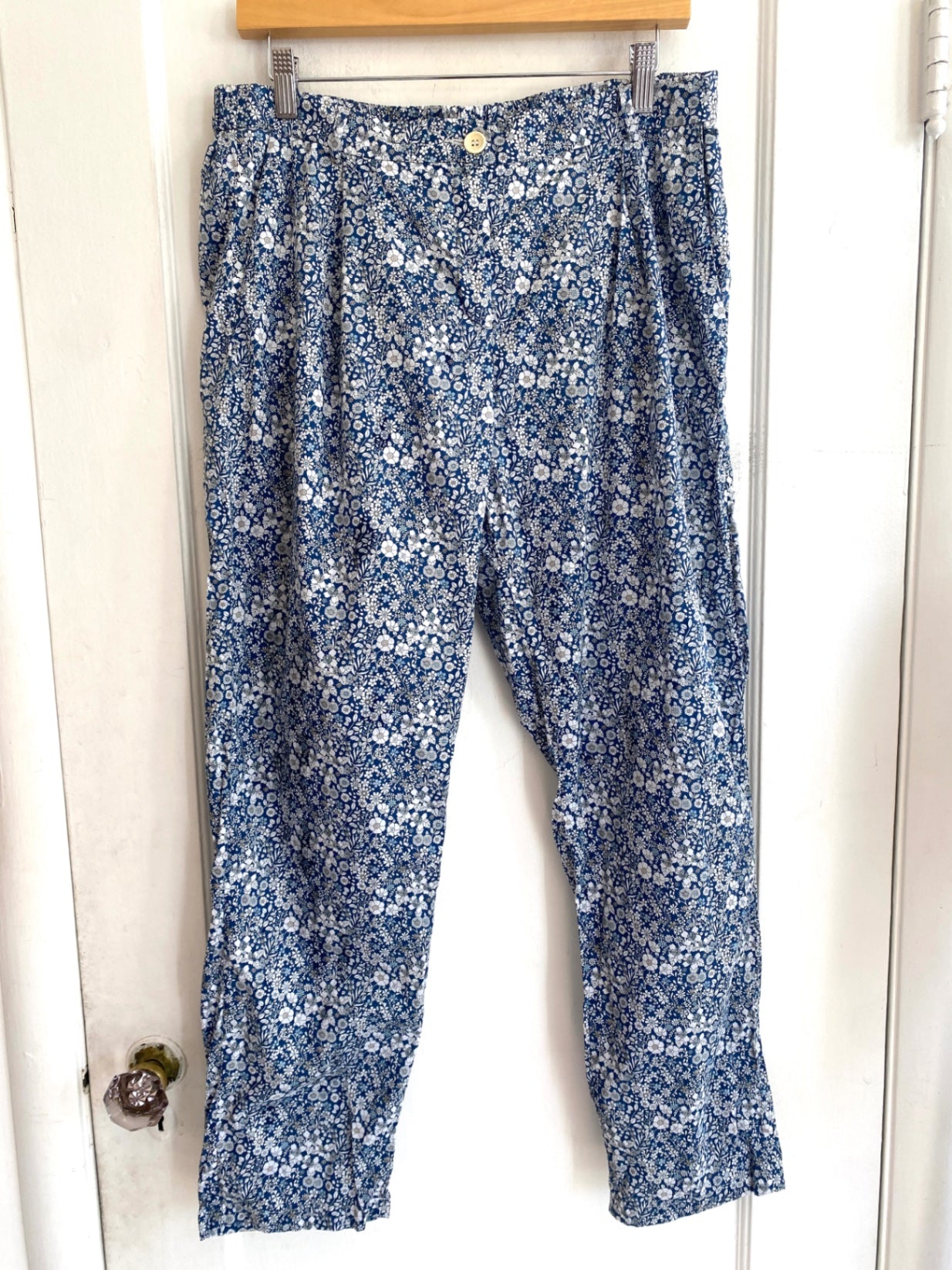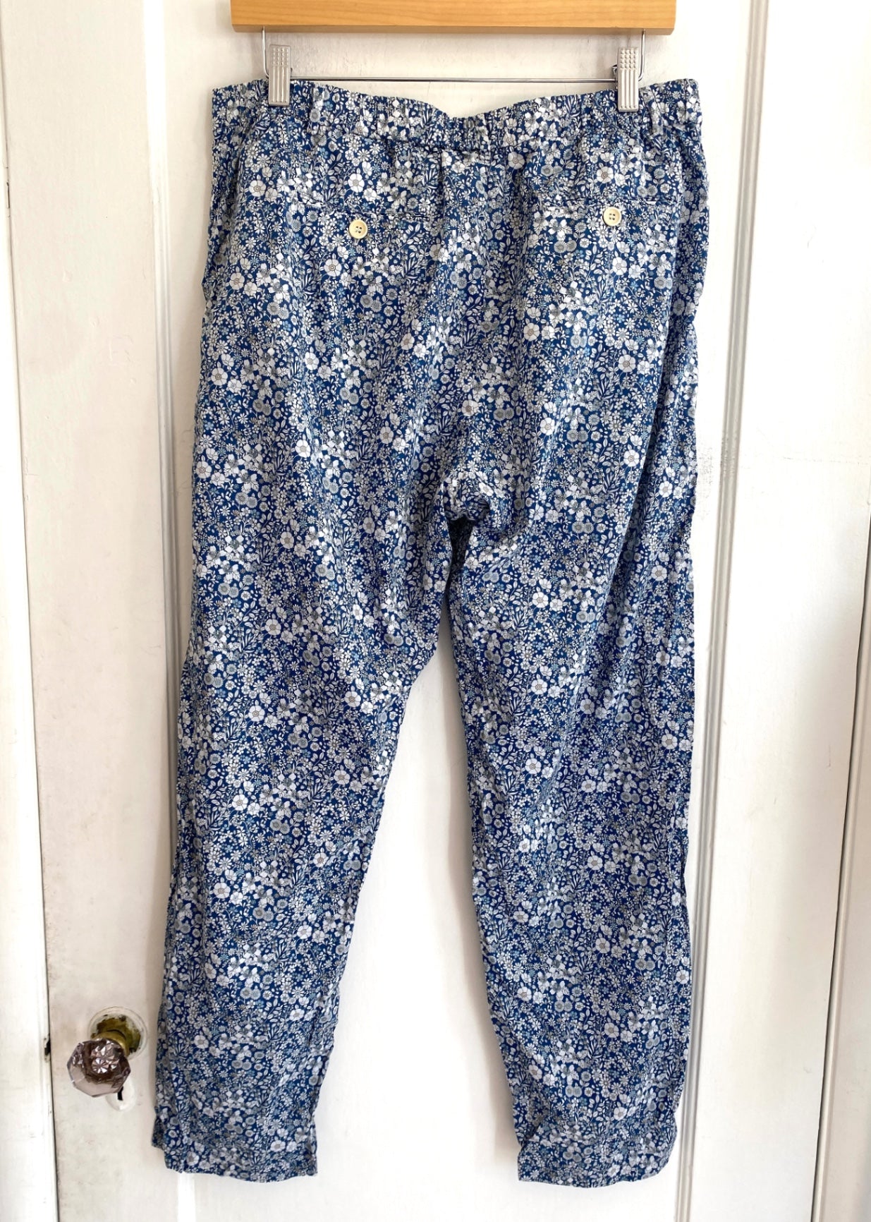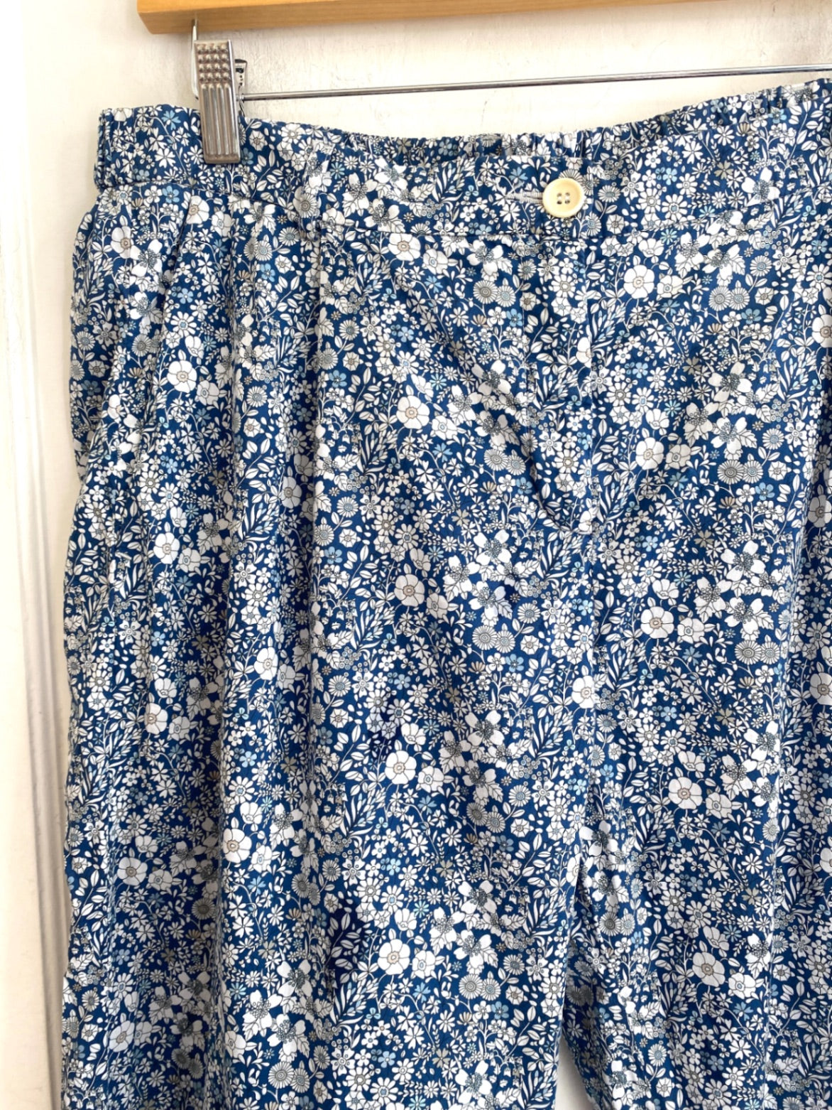 These relaxed-fit pants feature a vibrant blue and white floral print. Made from lightweight cotton, they offer comfort and breathability for everyday wear. The elastic waistband ensures a flexible fit, while the button details add a subtle touch of style. Perfect for casual outings and warm weather.