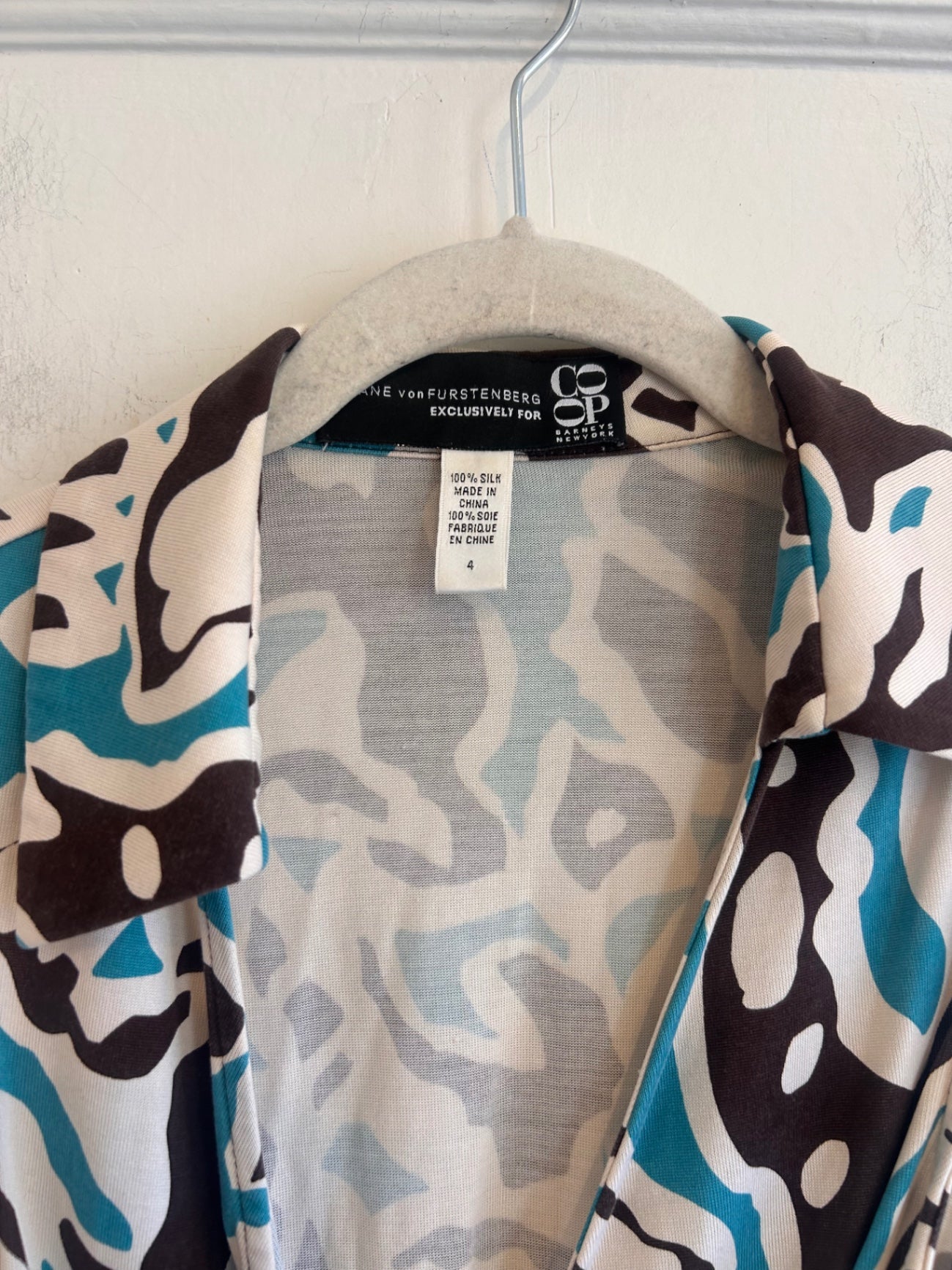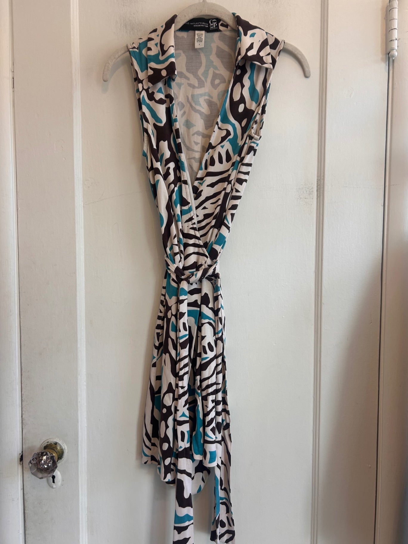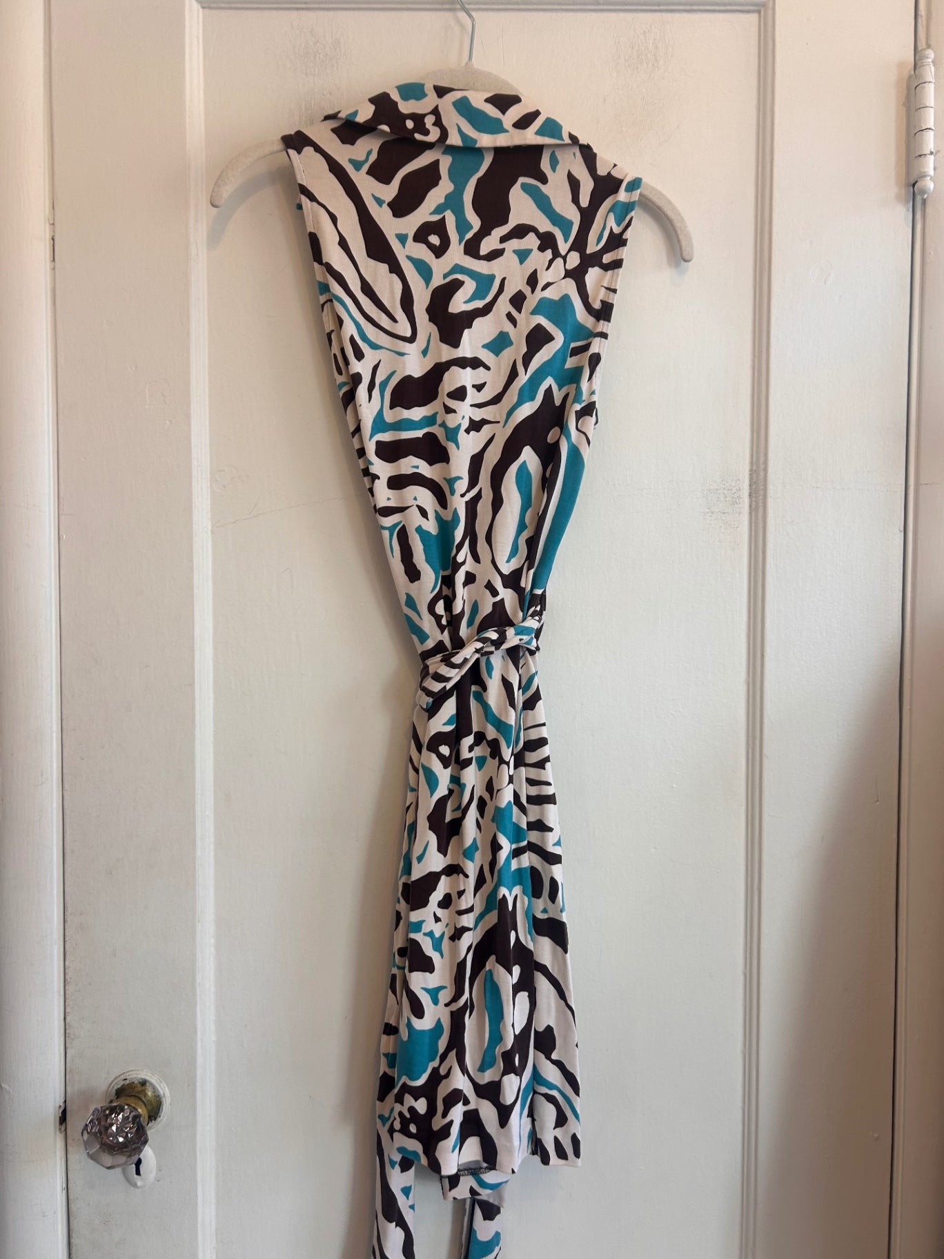 Soft stretch wrap dress in an abstract brown, ivory, and teal print. Sleeveless design with a collar and flattering wrap waist.