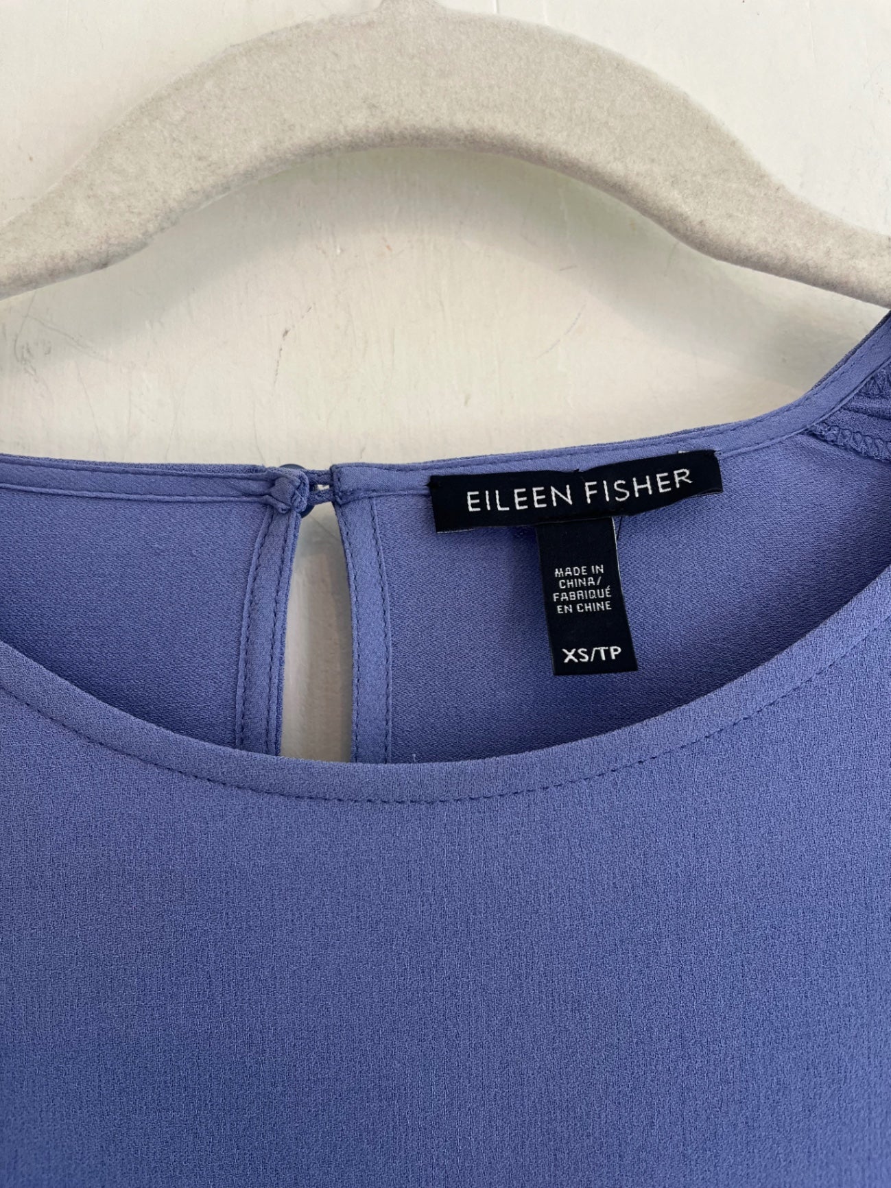Eileen Fisher 100% silk blouse in periwinkle blue. Relaxed fit with back button closure and slit sleeve detail. Lightweight and drapey.