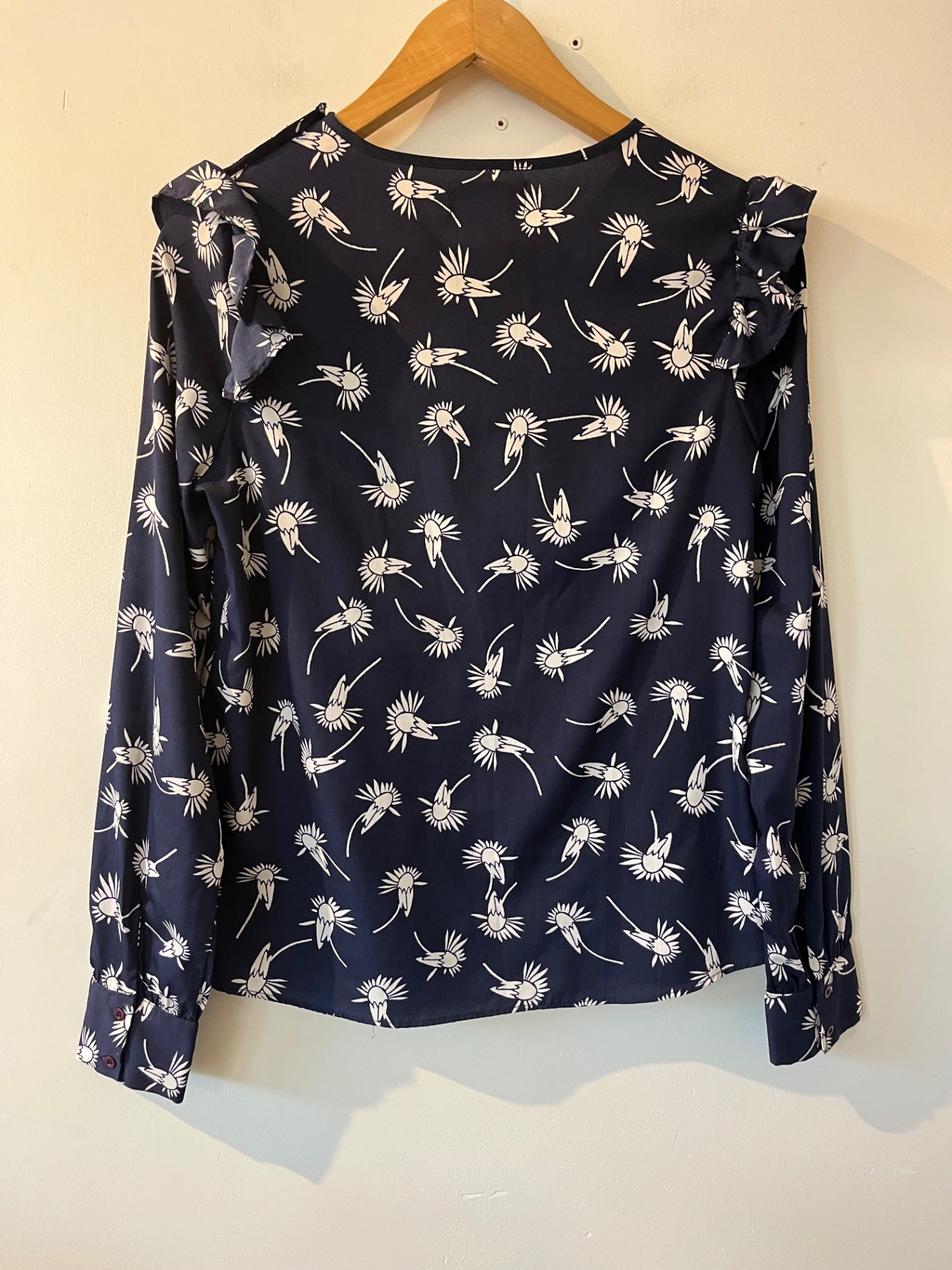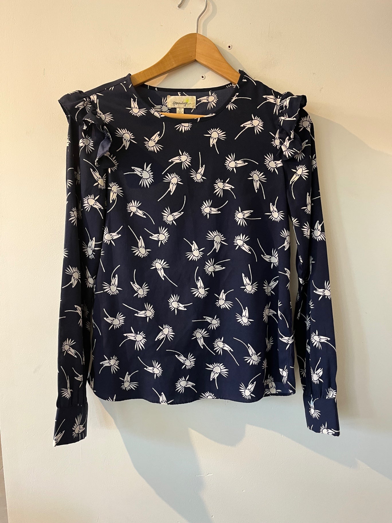 Navy Porridge blouse featuring an all over white floral print and soft ruffle detailing at the shoulders. Designed with relaxed silhouette, long sleeves, and lightweight silky fabric that drapes beautifully.