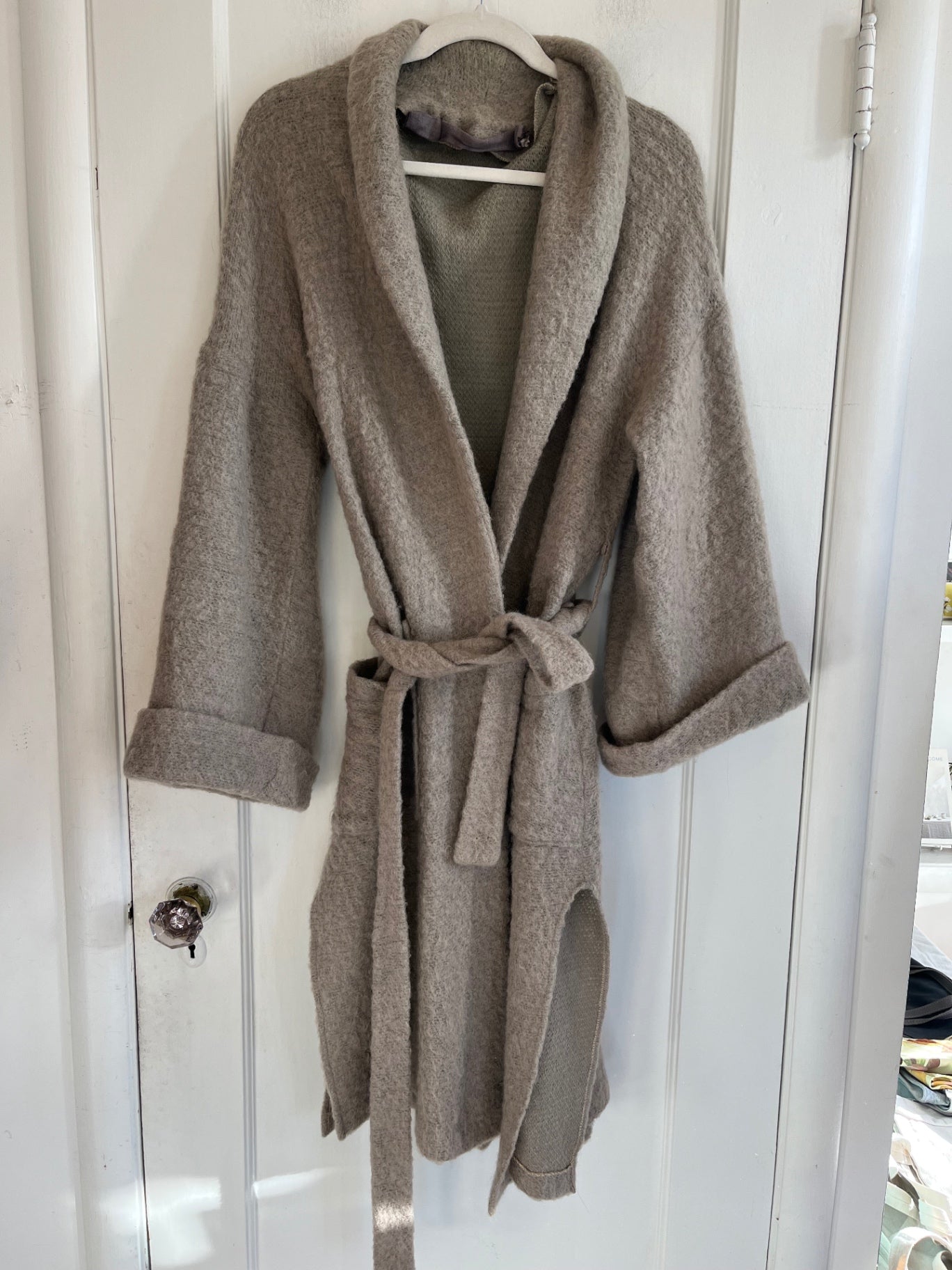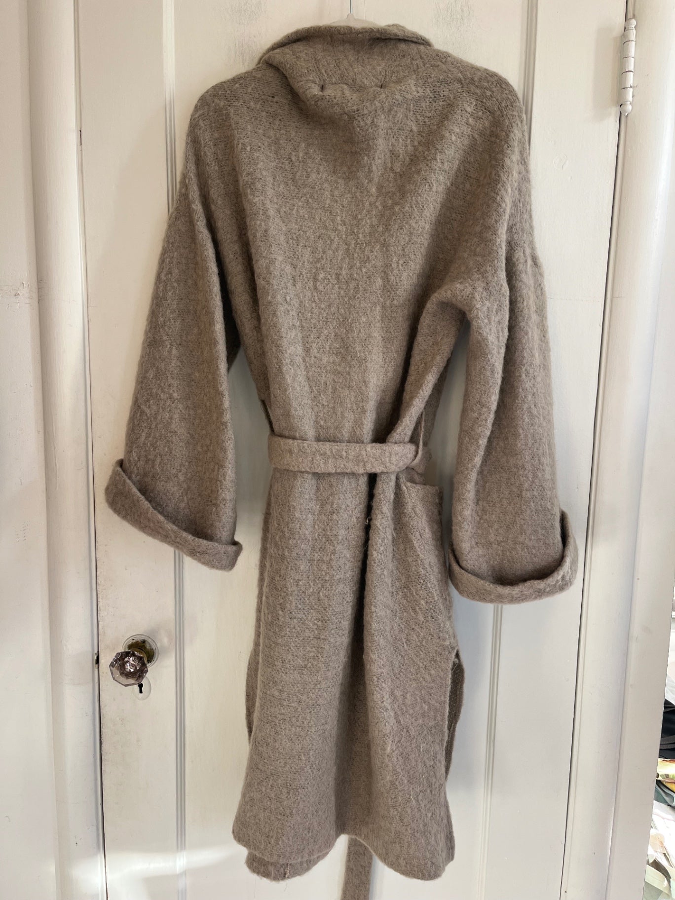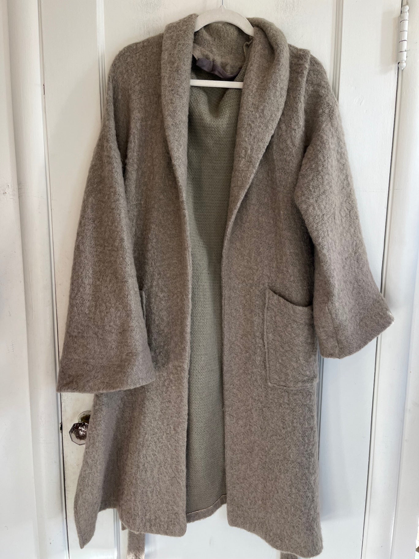 Soft taupe boiled wool wrap coat with a relaxed silhouette, featured a wide shawl collar, self-tie belt, and oversized patch pockets.