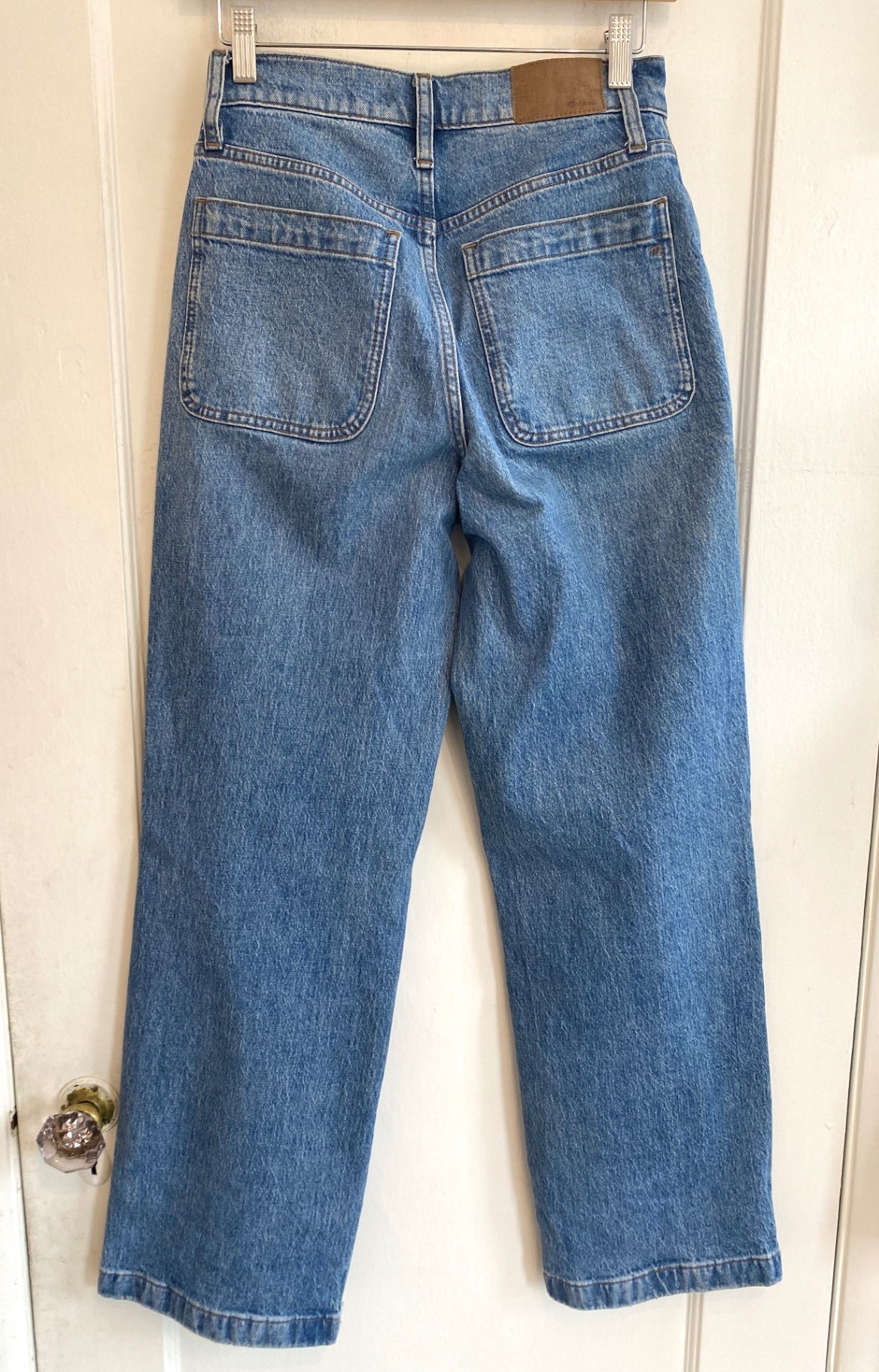 These vintage-style wide-leg jeans from Madewell feature a classic blue wash and a comfortable, relaxed fit. Crafted from durable denim, they offer a timeless look perfect for casual wear. The high-waisted design provides a flattering silhouette, while the large front pockets add a practical touch. Versatile and stylish, they pair well with a variety of tops for everyday outfits.
