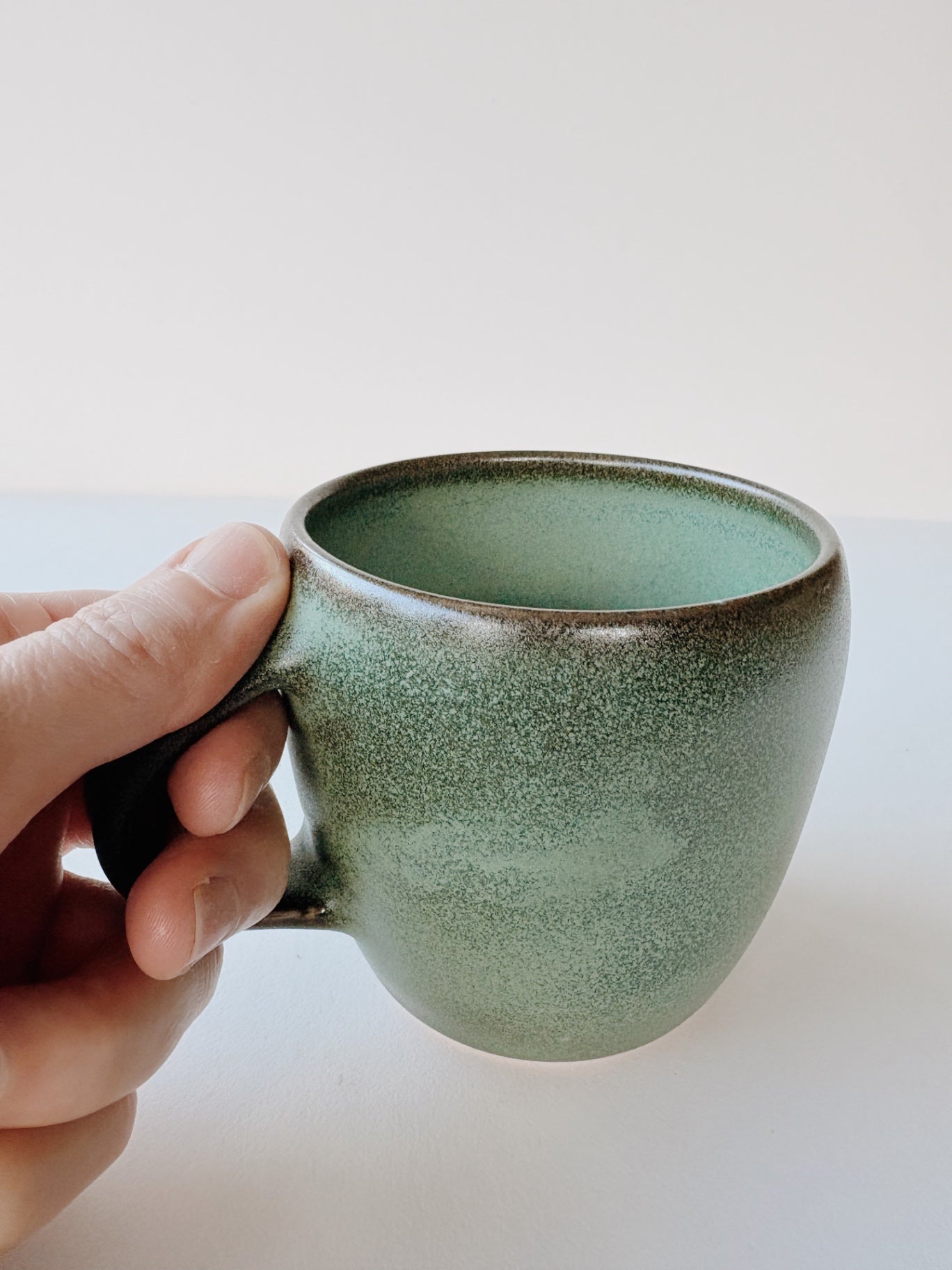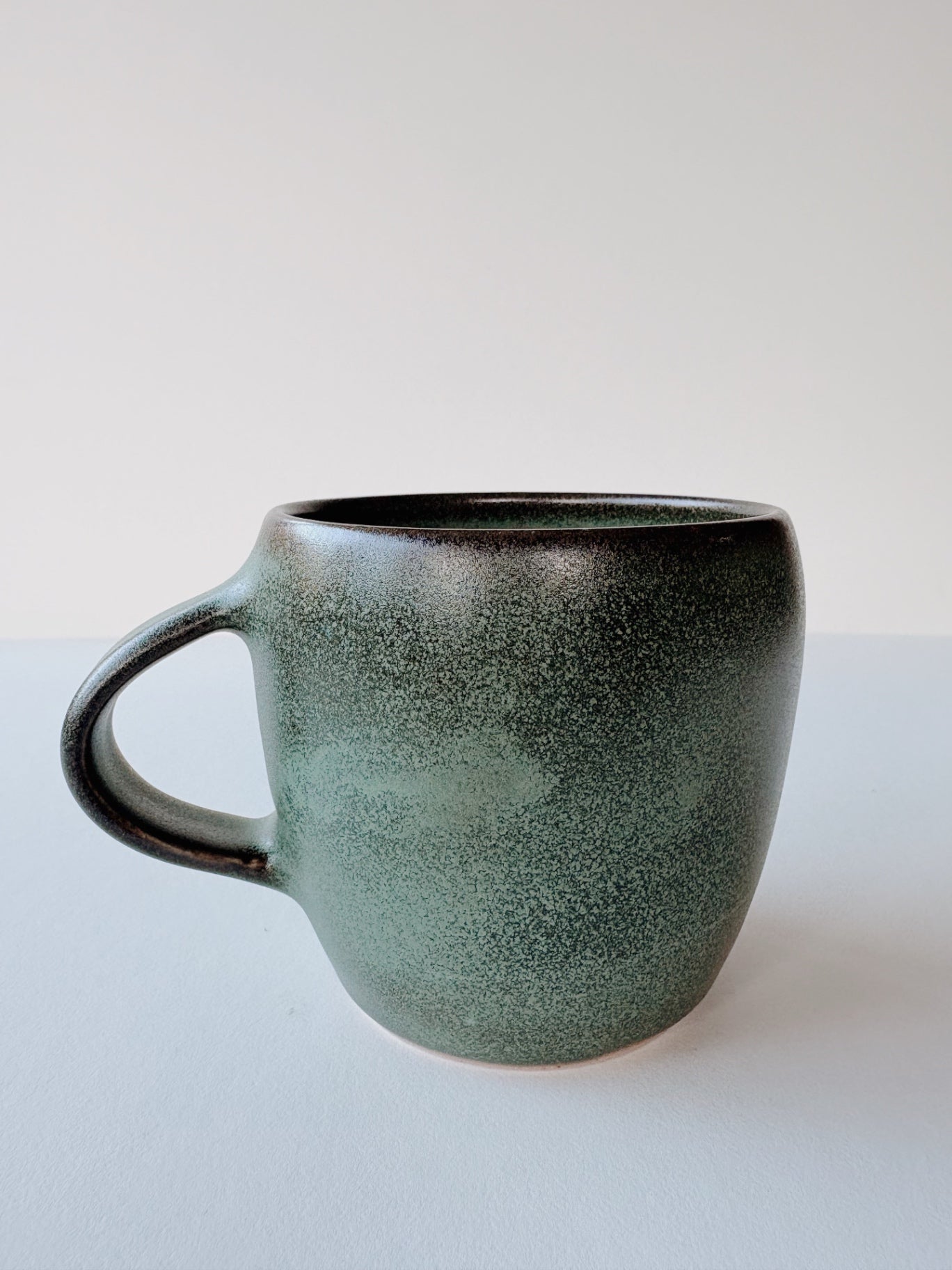 Set of three ceramic mugs in a muted green tone with a speckled finish. Perfect for enjoying hot beverages at home or in the office, these mugs combine functionality with a rustic charm. Their sturdy build makes them ideal for daily use.