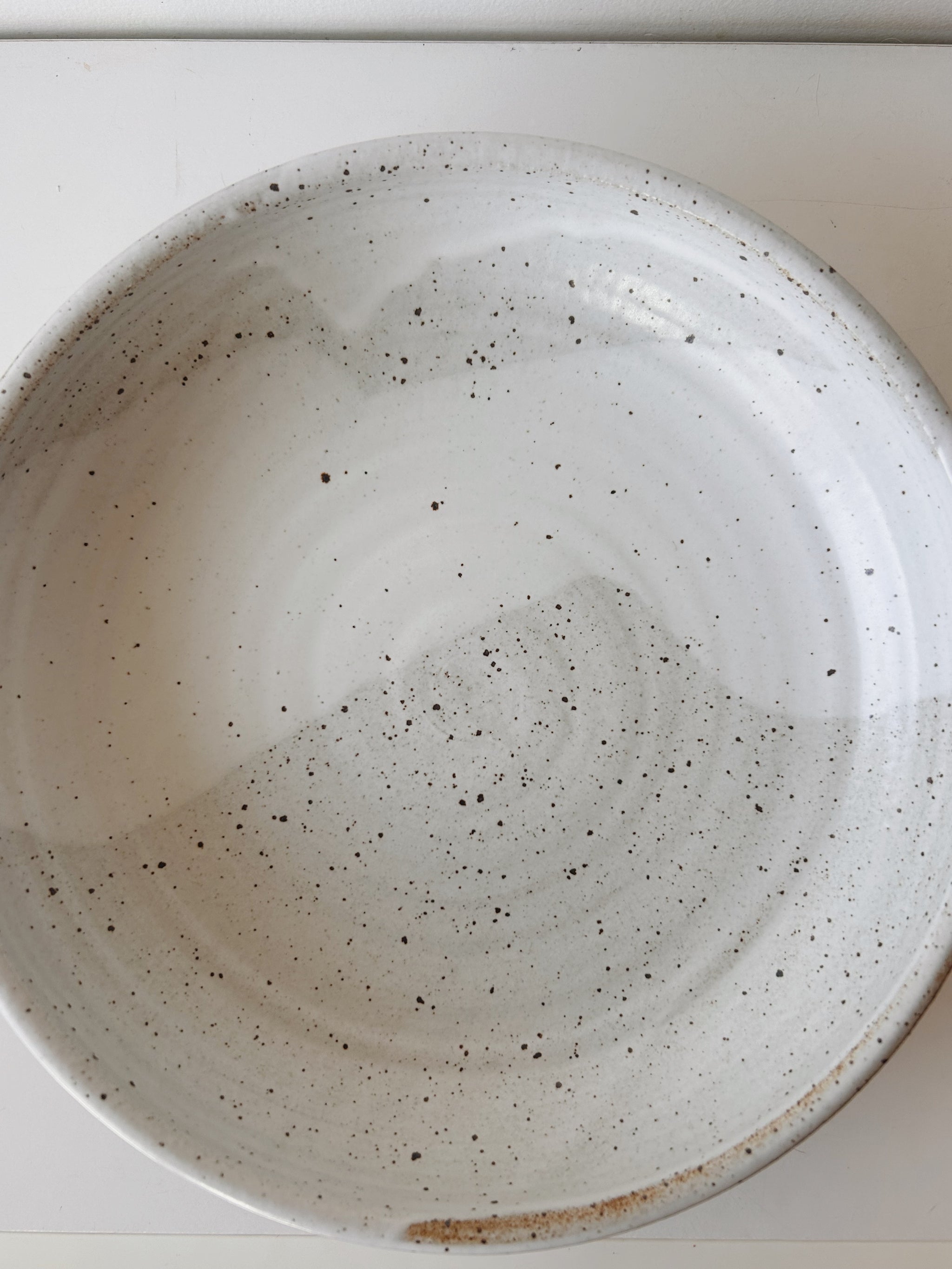 Glazed in a glossy white glaze with a swath of foggy white.