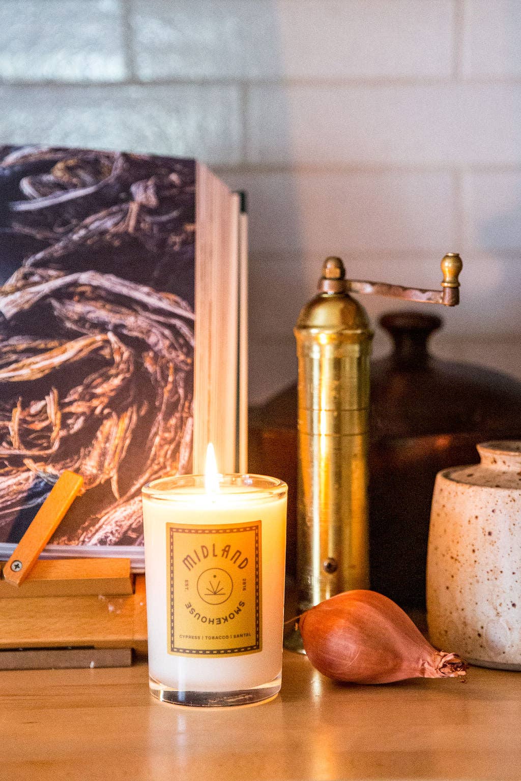 Dusk around a campfire, a balmy breeze catches your hair, a fine-grain whiskey on your tongue. A communal exhale with nowhere to be. Lingering smoke grazes the air as the cypress tree stands still. A gaze into the eye of nature's mystery. Wild and warming, Smokehouse is a sensual place of earth and fire, love and loss, immortality and comfort. Notes of cypress, tobacco, and santal.  Natural coconut wax, paraben-free, sustainable wax base. Lead-free cotton wick, clean burn. Hand poured in the USA by Light 4 Life and the Exceptional Children's Foundation. An organization that provides jobs for adults with disabilities.