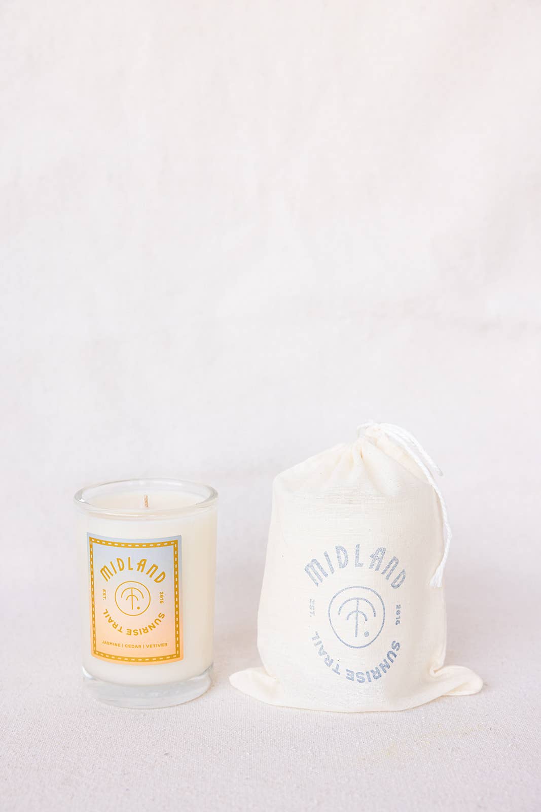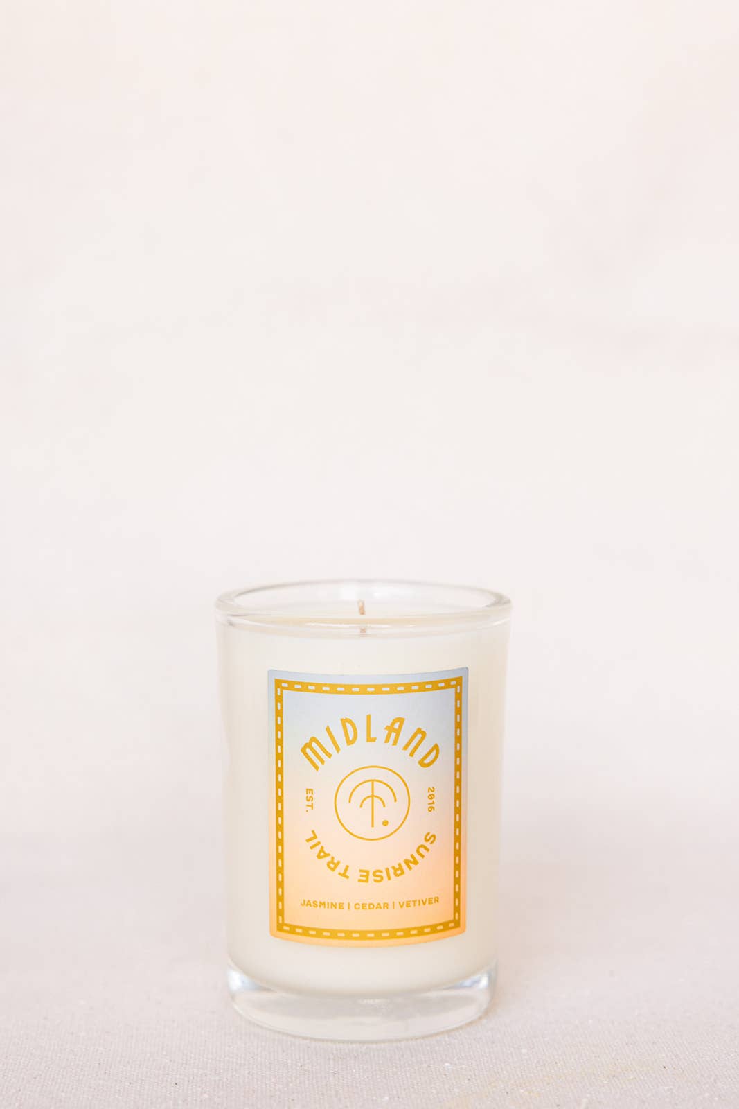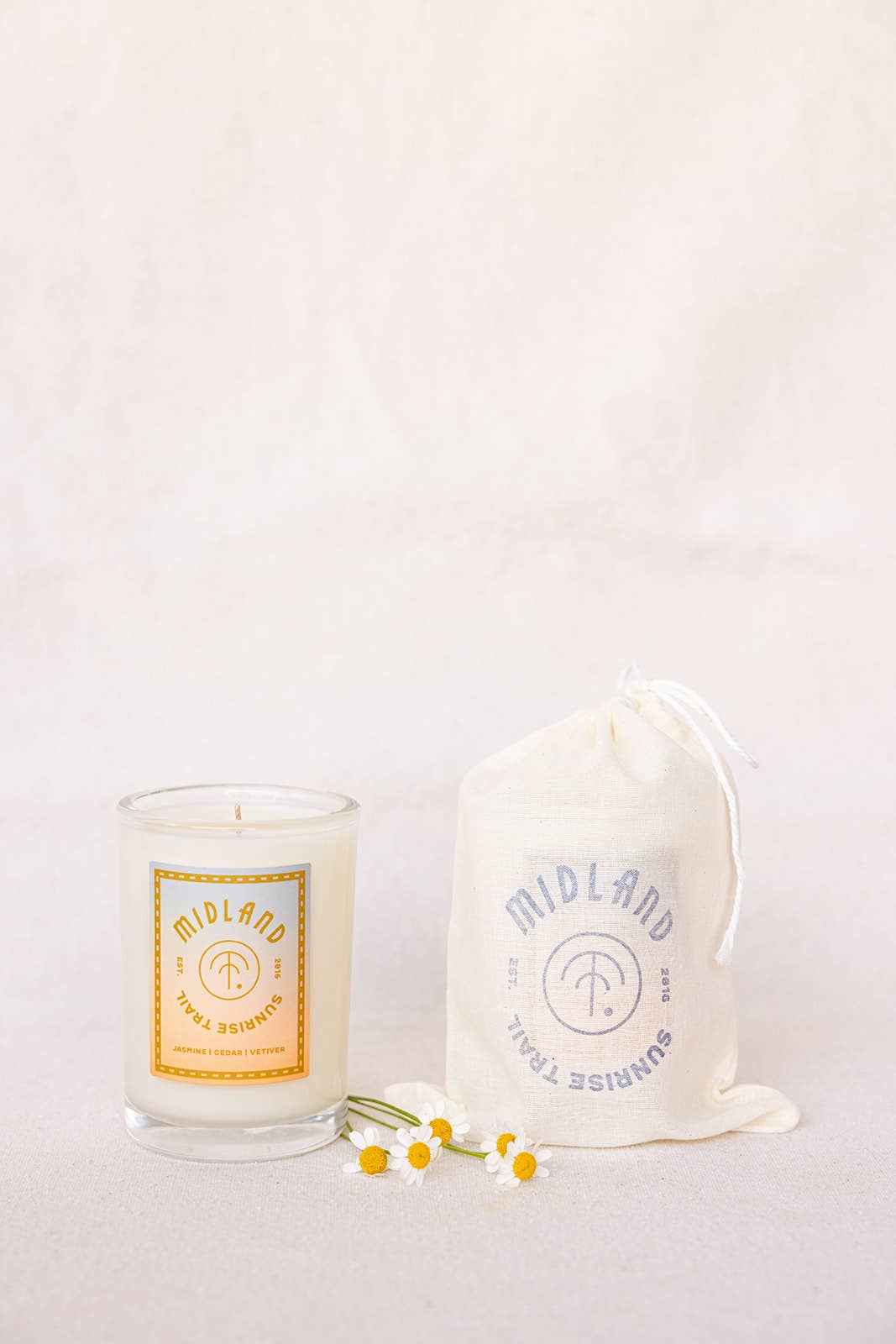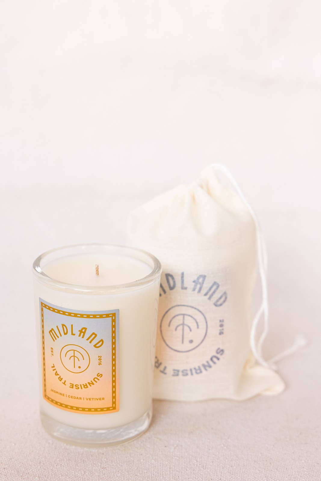 Breathe in the tranquility of a morning hike, surrounded by the crispness of the mountain air and the soft glow of the rising sun. As you light this sensual candle, you're greeted by the delicate aroma of blooming jasmine, its peaceful fragrance mingling with the freshness of rooted cedar. Subtle hints of earthy vetiver add depth to the scent, evoking a sense of serenity and purpose. Each inhalation transports you to a serene landscape, where nature's beauty unfolds with every step we take. This is Sunrise Trail. Notes of Jasmine, Cedar, Vetiver, Patchouli, and Lemongrass. Natural Coconut Wax, Paraben Free, Sustainable wax base. Lead free cotton wick, clean burn. Hand poured in the USA by Light 4 Life and the Exceptional Children's Foundation. An organization that provides jobs for adults with disabilities.