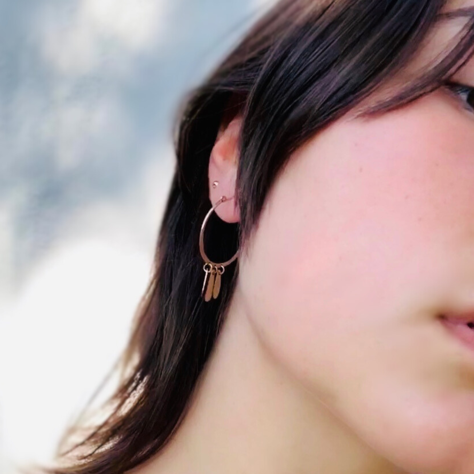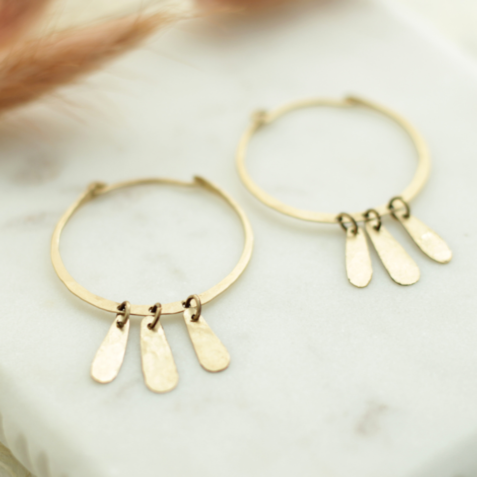 The delicate and lightweight gold-filled hoop chime earrings are hand forged, cut, hammered, drilled and filed. They have a lever and tension closure. These earrings elegantly sway with your movements as the hammered texture catches and reflects light. Chimes are a symbol of good luck and Eastern cultures believe they enhance the flow of life energy.