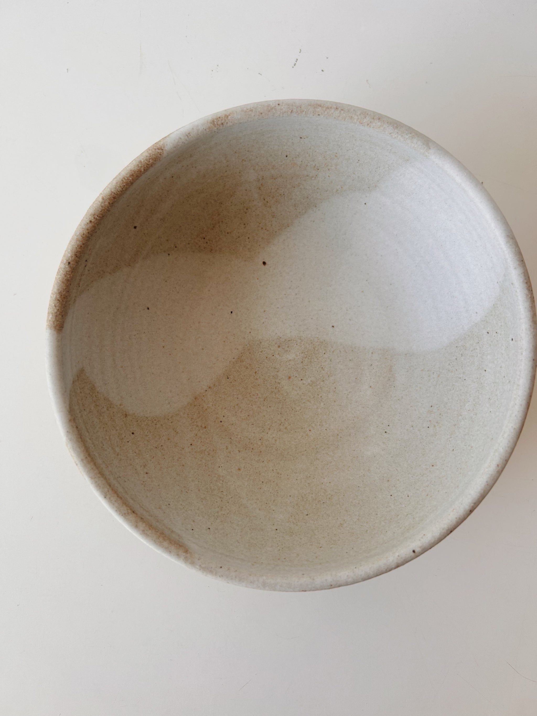 A big bowl for noodles, soup, or stews glazed in a matte white glaze with a swath of foggy white.