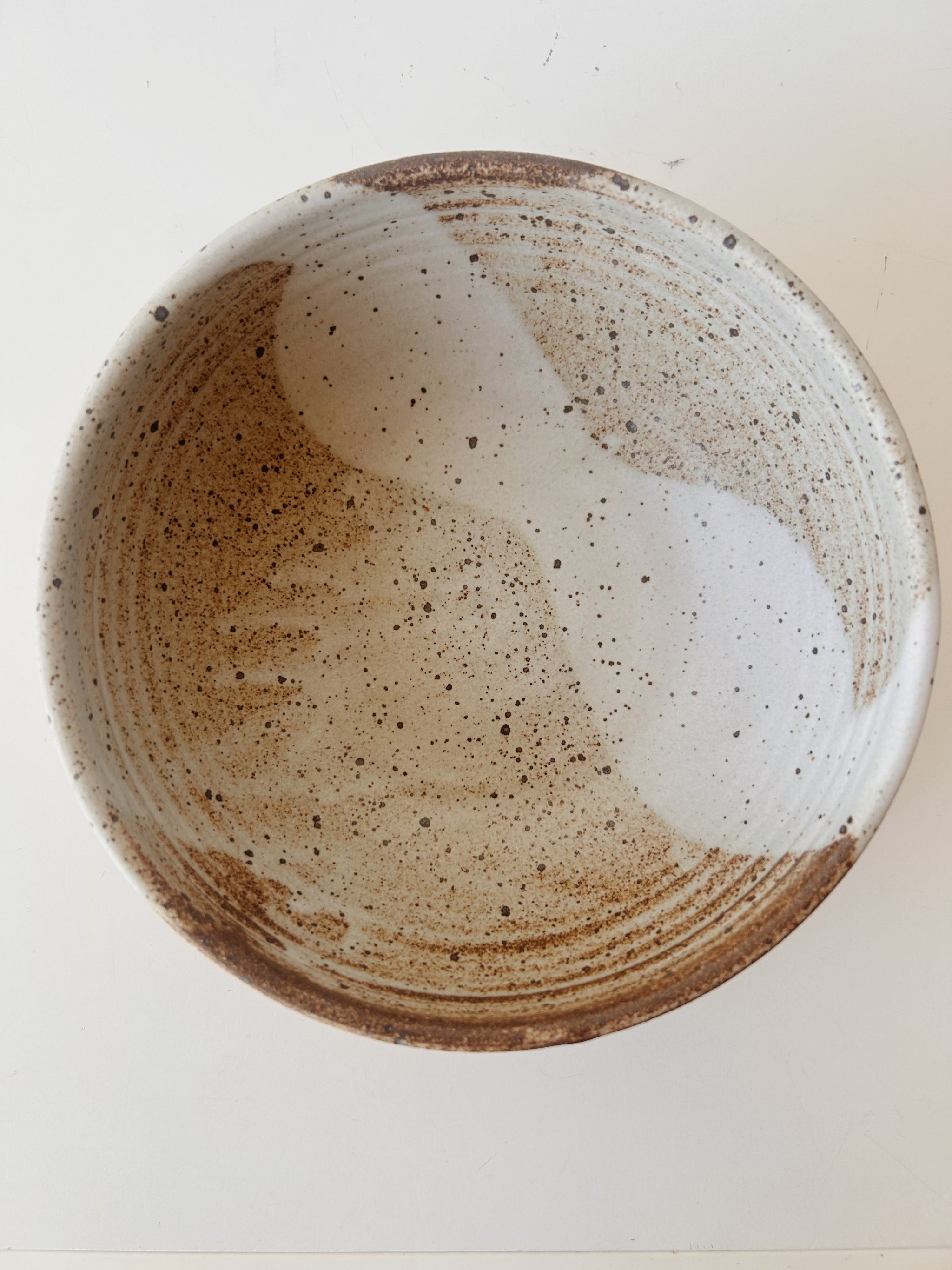 A big bowl for noodles, soup, or stews glazed in a matte white glaze with a swath of foggy white.
