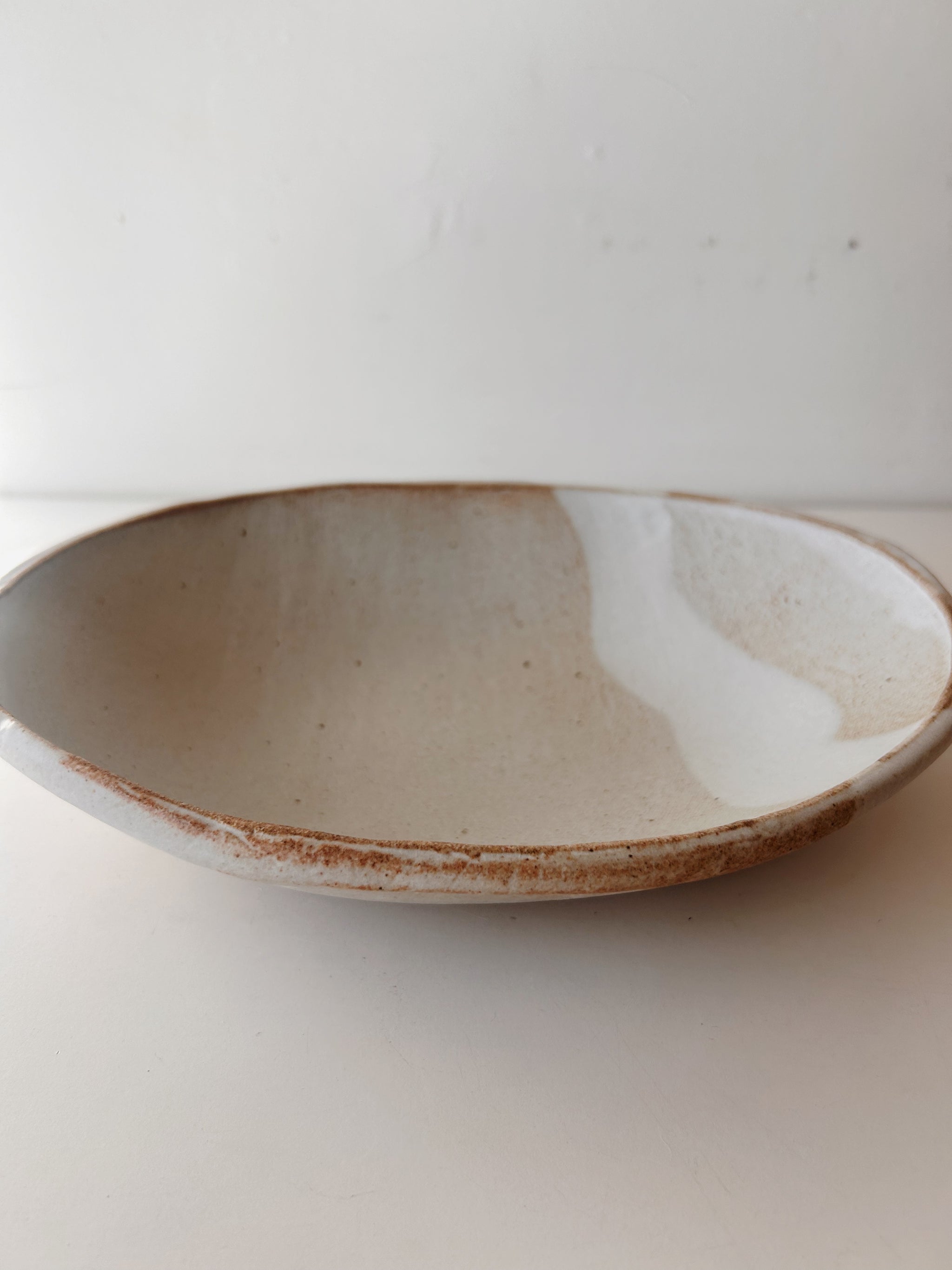 An oval bowl glazed in a matte white with a swath of foggy white.
