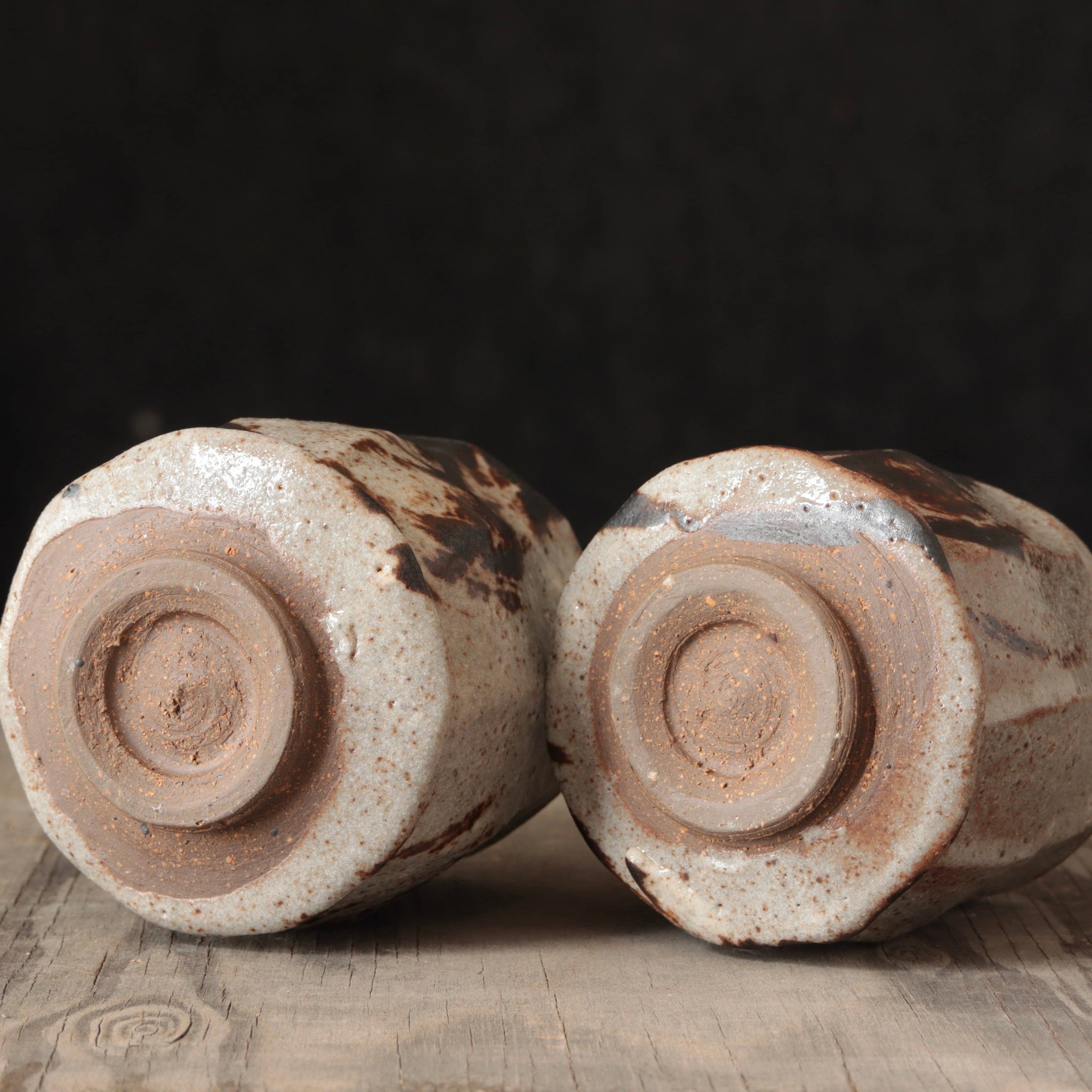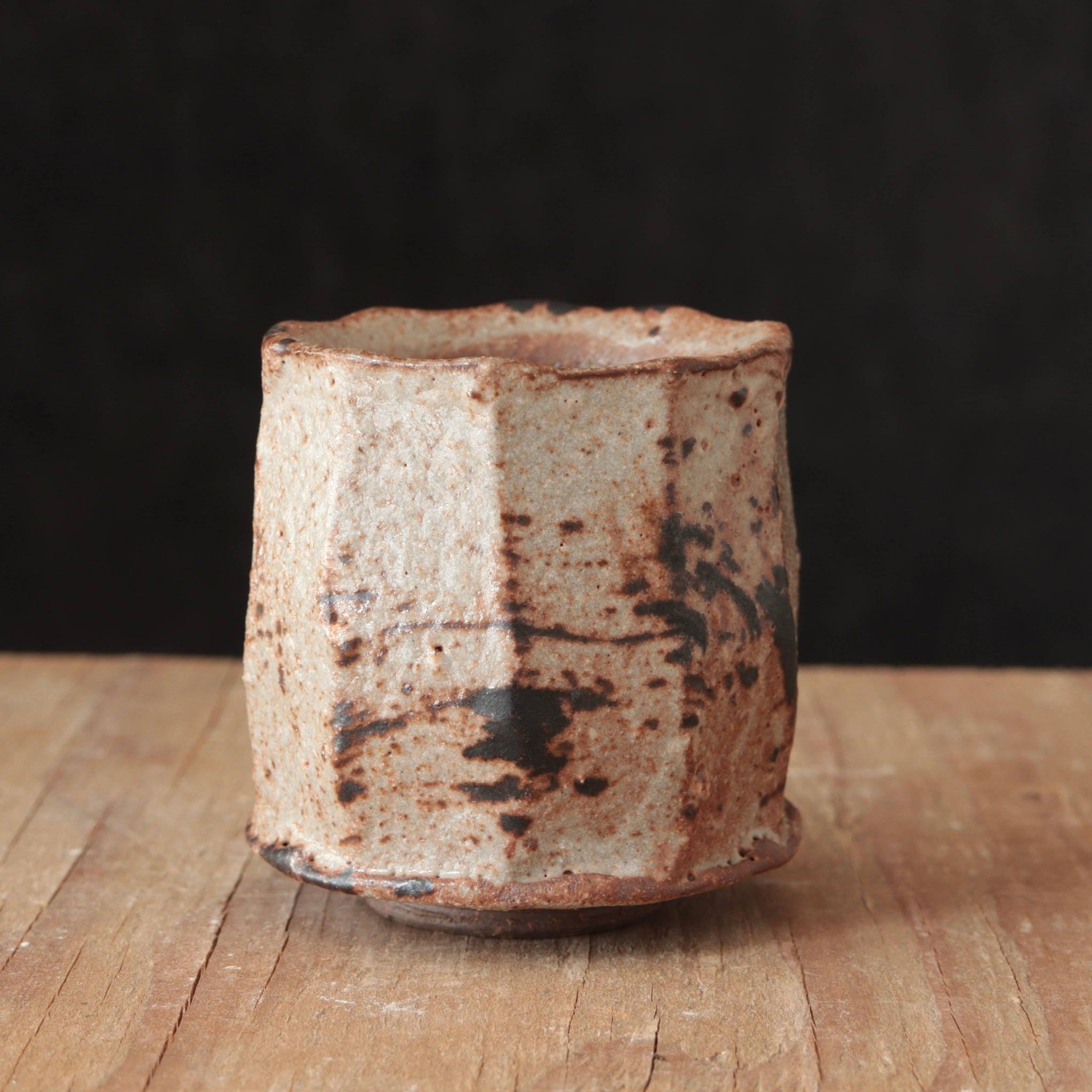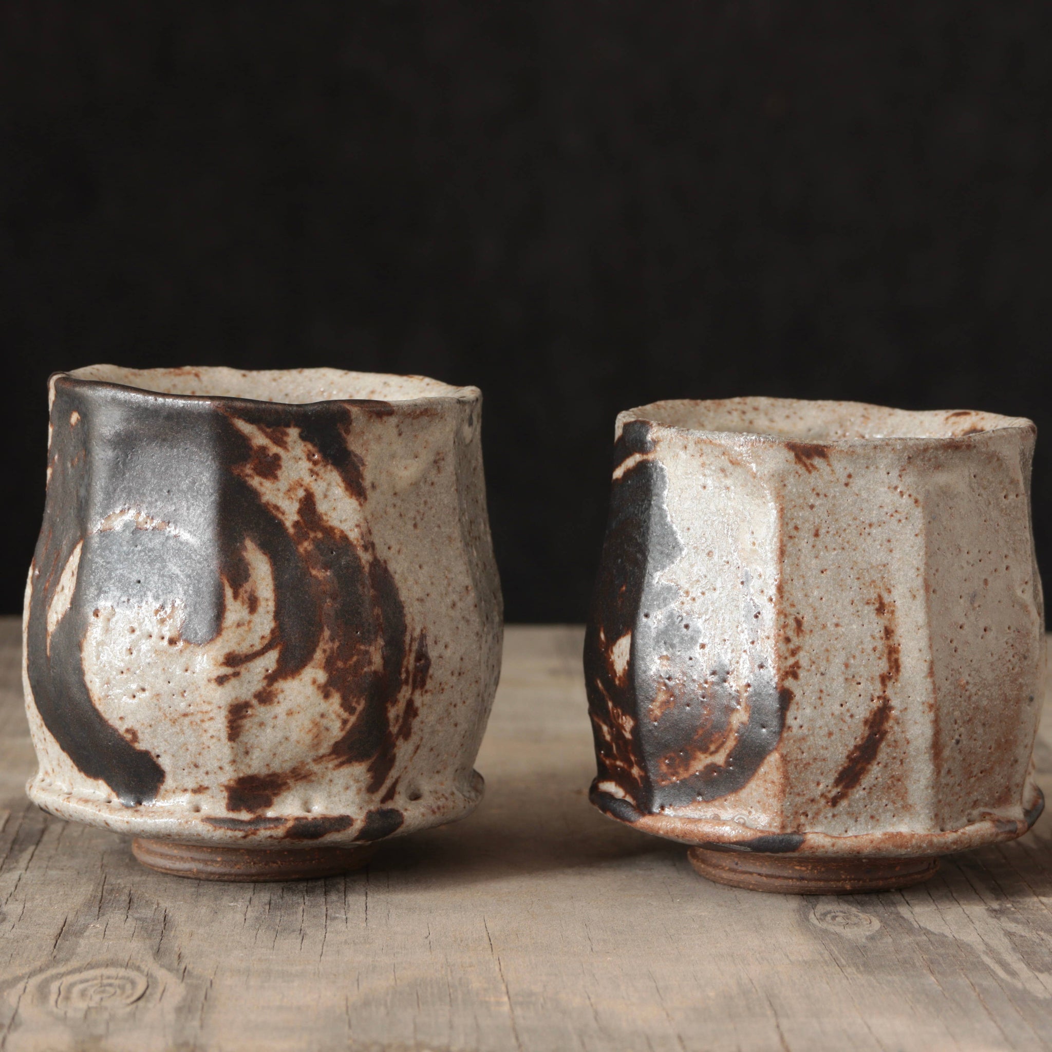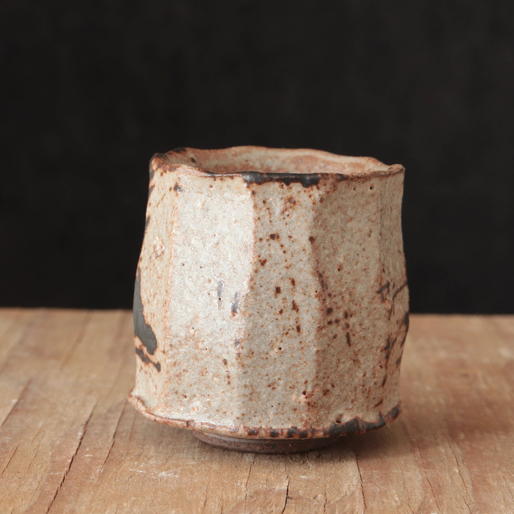 Handmade cup, thrown on a potters wheel and faceted while still wet to create an organic shaped but multi-sided design. The clay and glaze materials for these are entirely foraged in Northern California and minimally processed to allow the natural beauty to show through. This glaze is almost entirely granite, ground relatively course for pleasing stone-like feel. Finished with accents of local ilmenite, a local iron/titanium material.