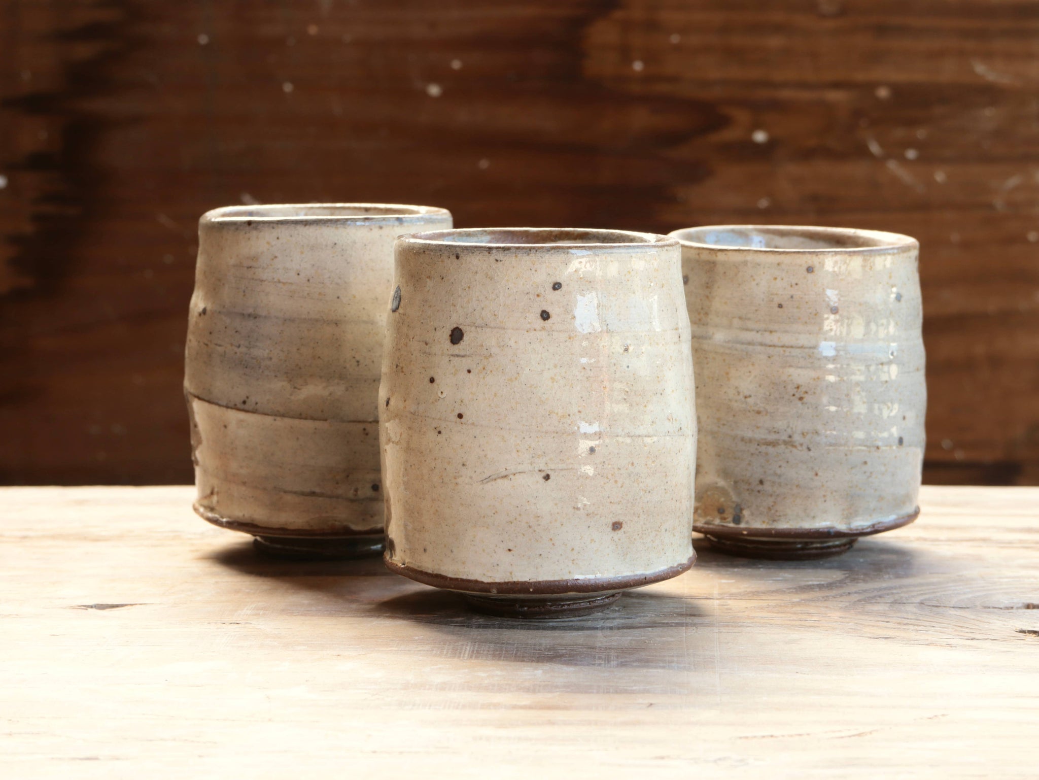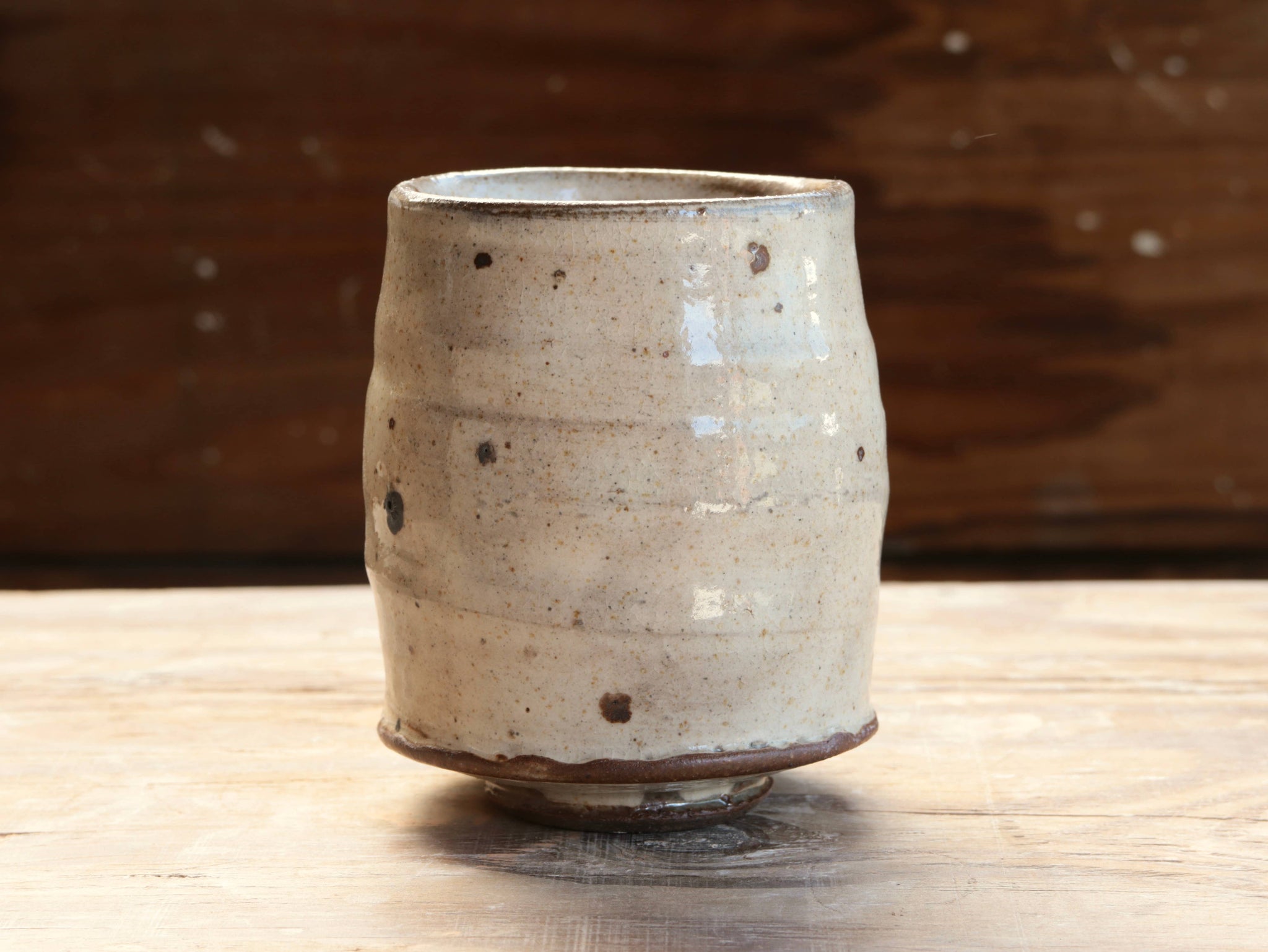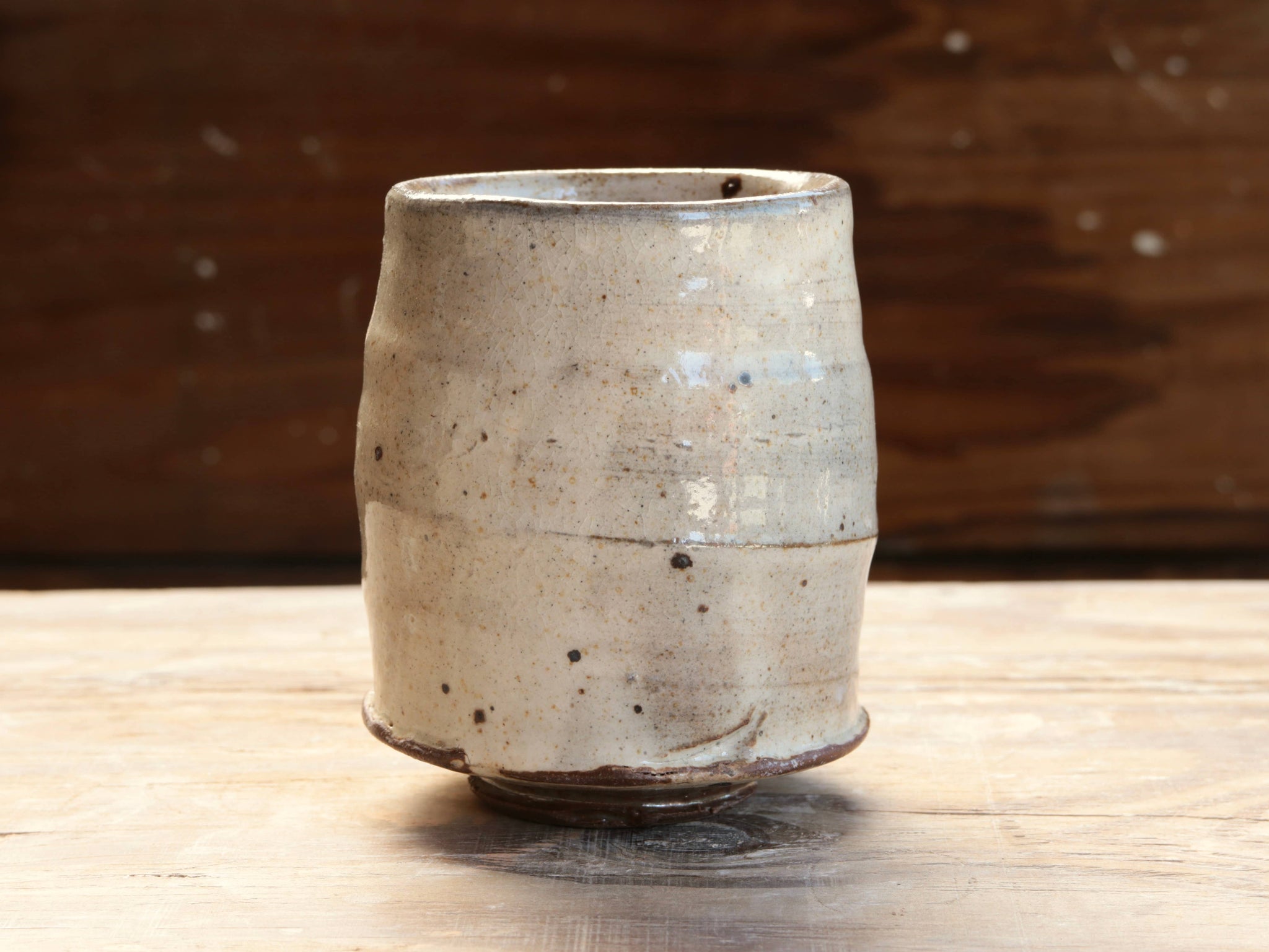 Handmade cup, thrown and trimmed on a potters wheel. The clay and glaze materials for these are entirely foraged in Northern California and minimally processed to allow the natural beauty to show through. A dark, rough clay body is used for these, with a white clay slip applied after drying. A simple clear glaze made of local feldspar and wood ash is then applied. The various layers interact to give a rich and varied white-light grey surface with occasional pink flashing known as "gohonde".