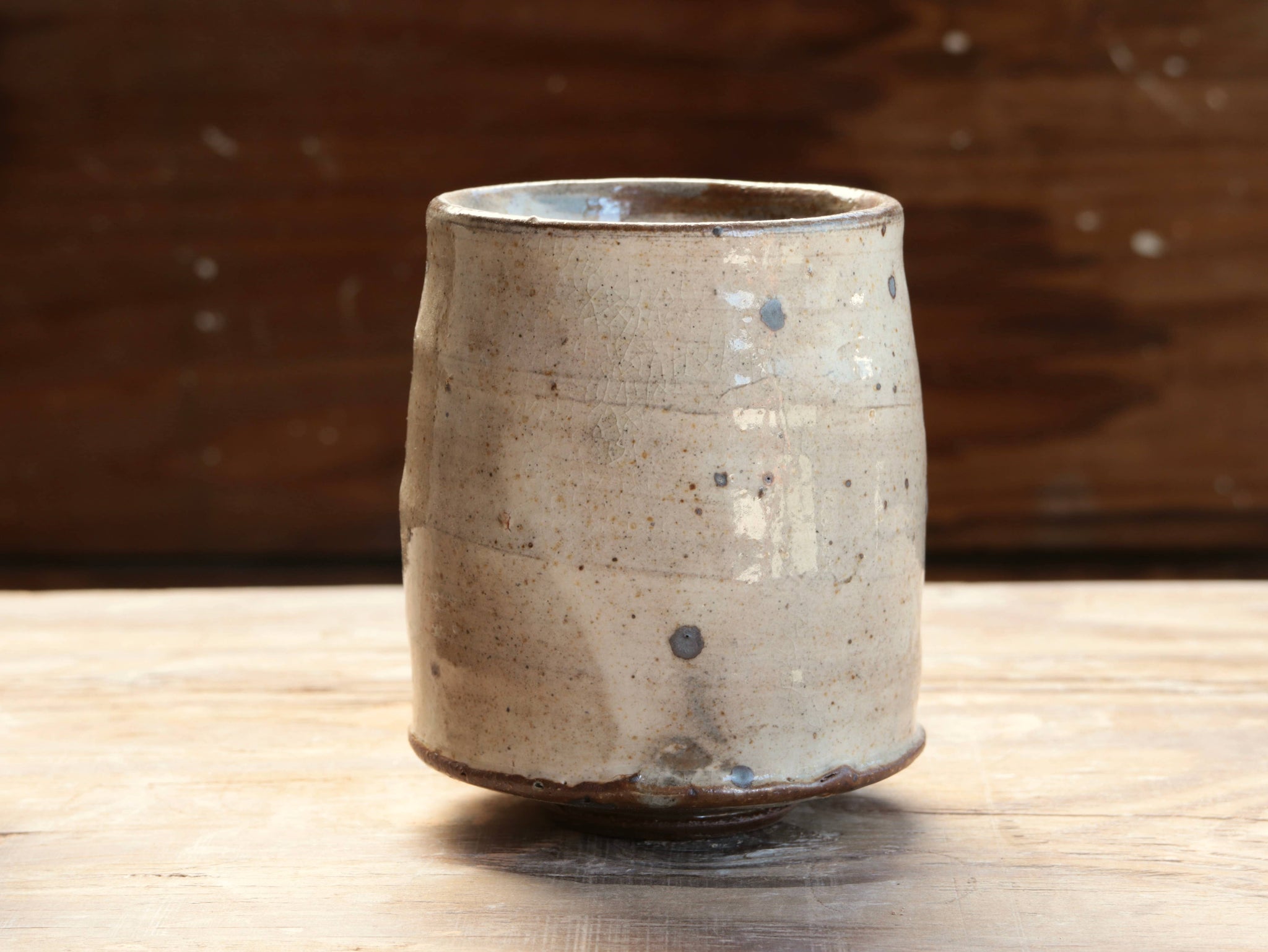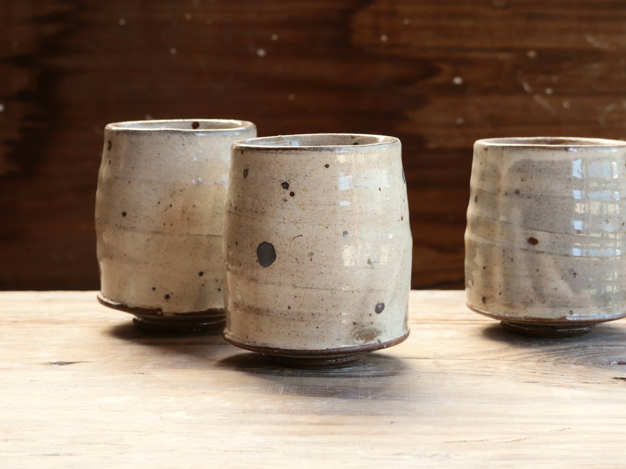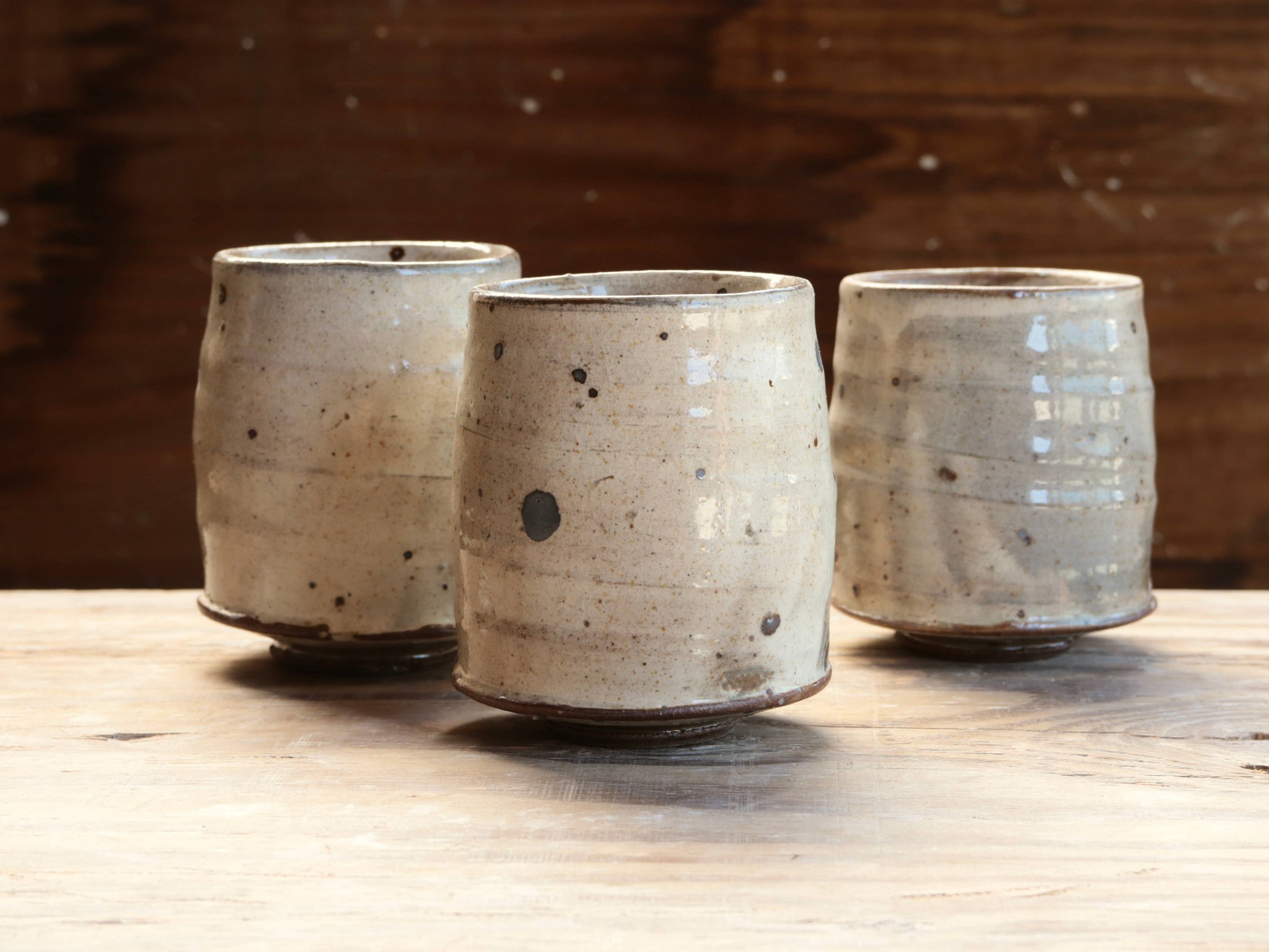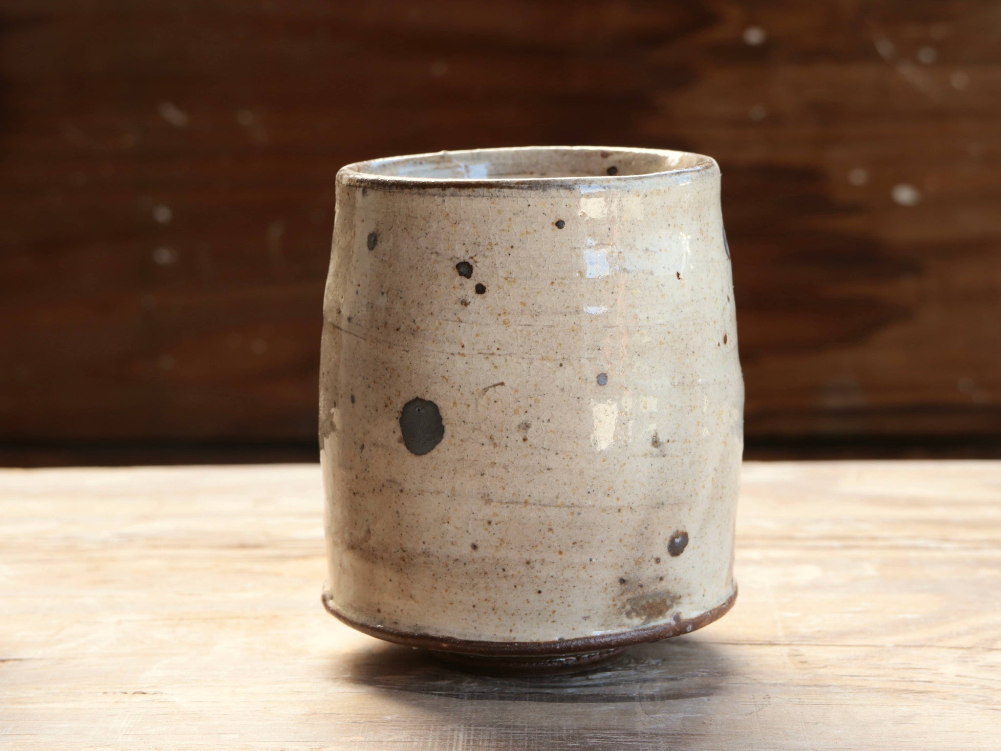 Handmade cup, thrown and trimmed on a potters wheel. The clay and glaze materials for these are entirely foraged in Northern California and minimally processed to allow the natural beauty to show through. A dark, rough clay body is used for these, with a white clay slip applied after drying. A simple clear glaze made of local feldspar and wood ash is then applied. The various layers interact to give a rich and varied white-light grey surface with occasional pink flashing known as "gohonde".