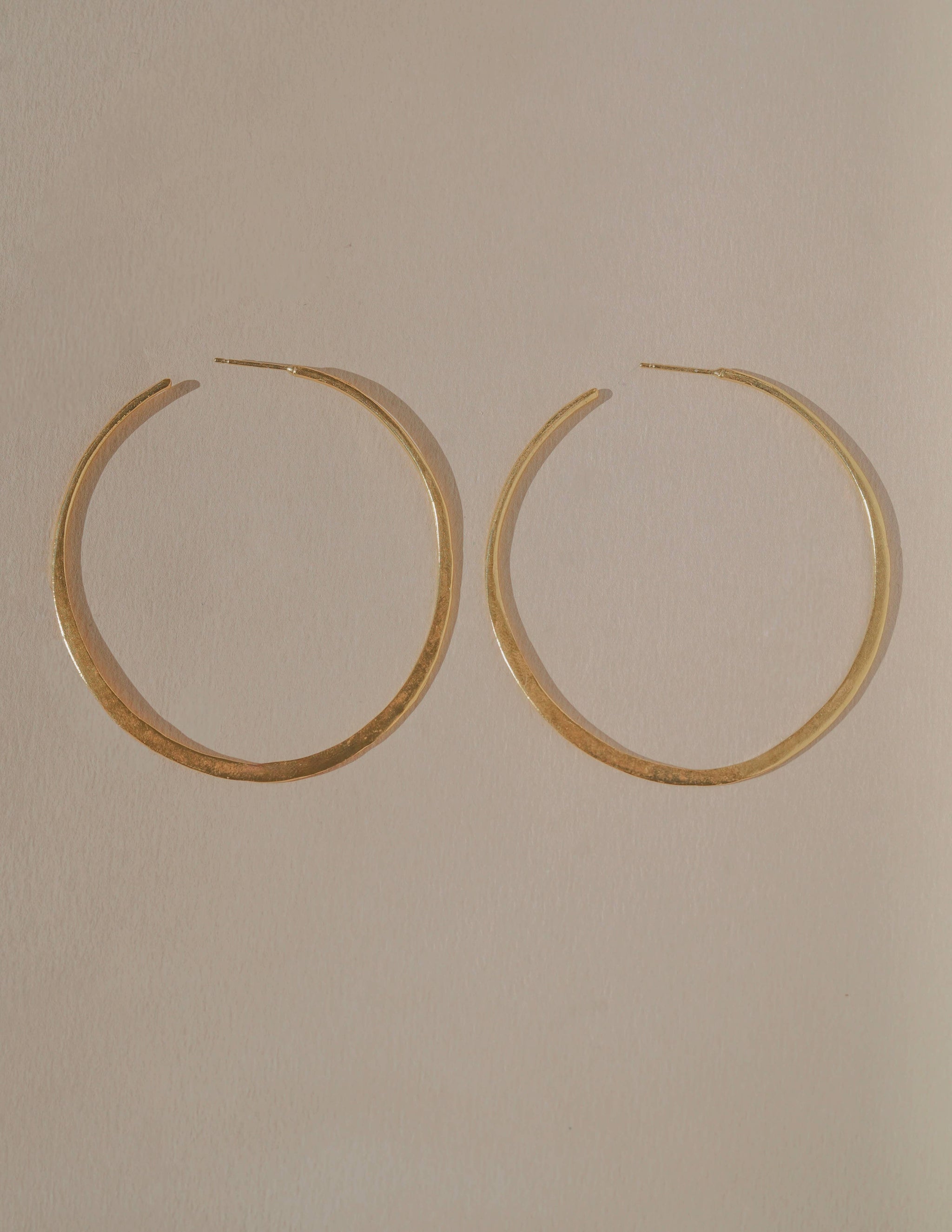 Large handcrafted textured flat hoop earrings ~ lightweight, bold and beautiful. Can't go wrong with this style! Options: * Gold Vermeil Details: * 60mm, 6 grams * Made with recycled metals * Sold as a pair * Made in the USA