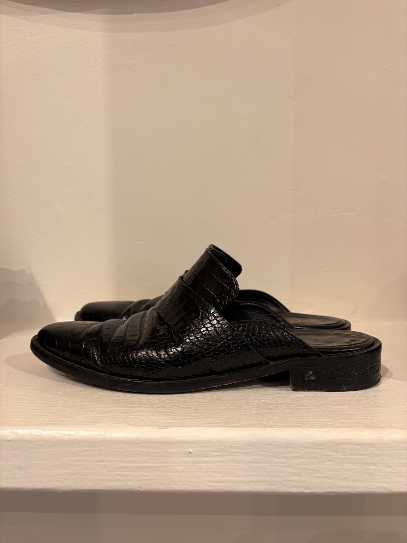 These chic black leather slippers feature a textured, crocodile-embossed finish, adding a touch of sophistication to your casual wardrobe. The slip-on style offers easy wearability while providing a sleek look. Perfect for lounging or casual outings, these slippers combine comfort with high-end fashion appeal.