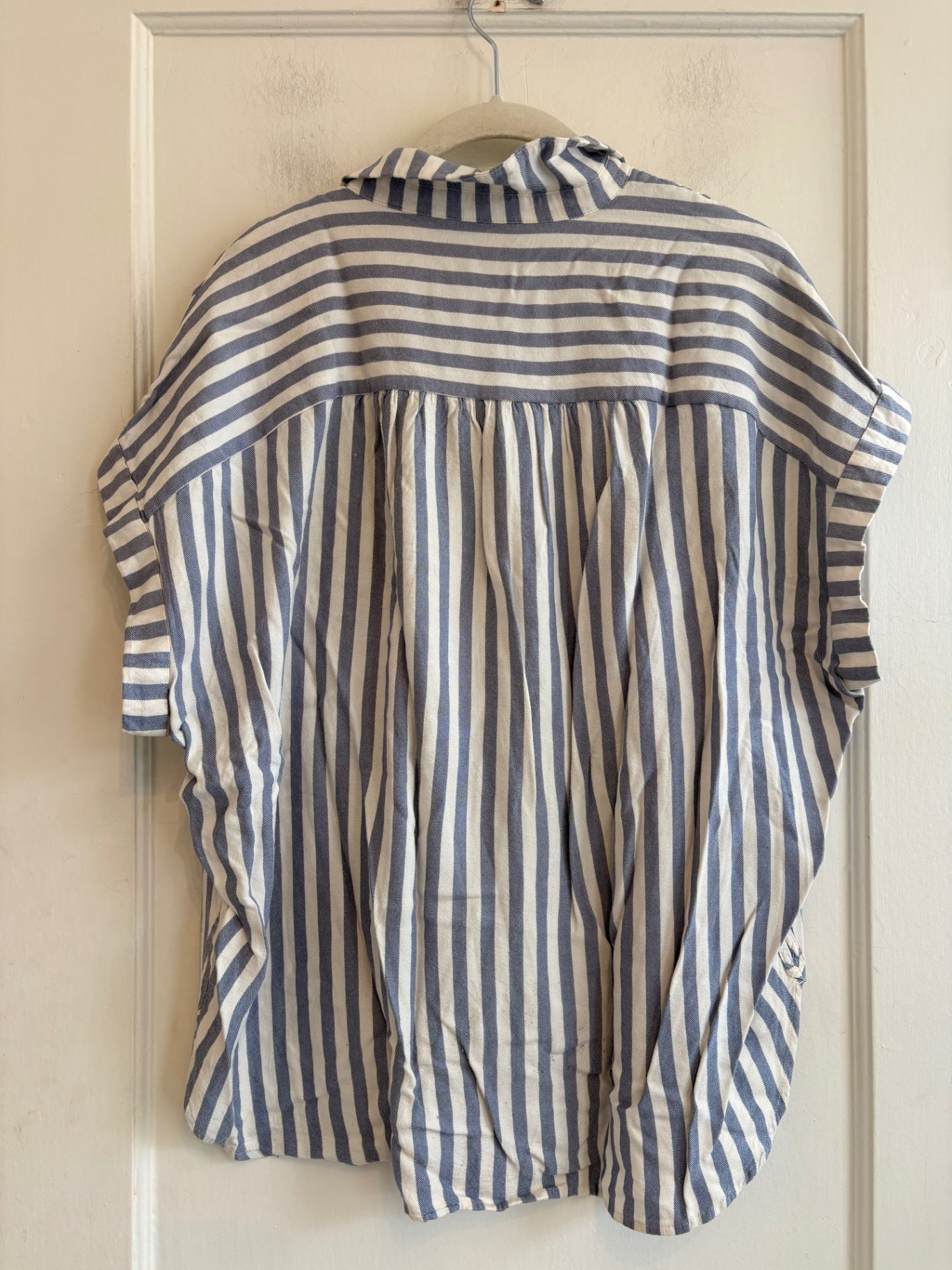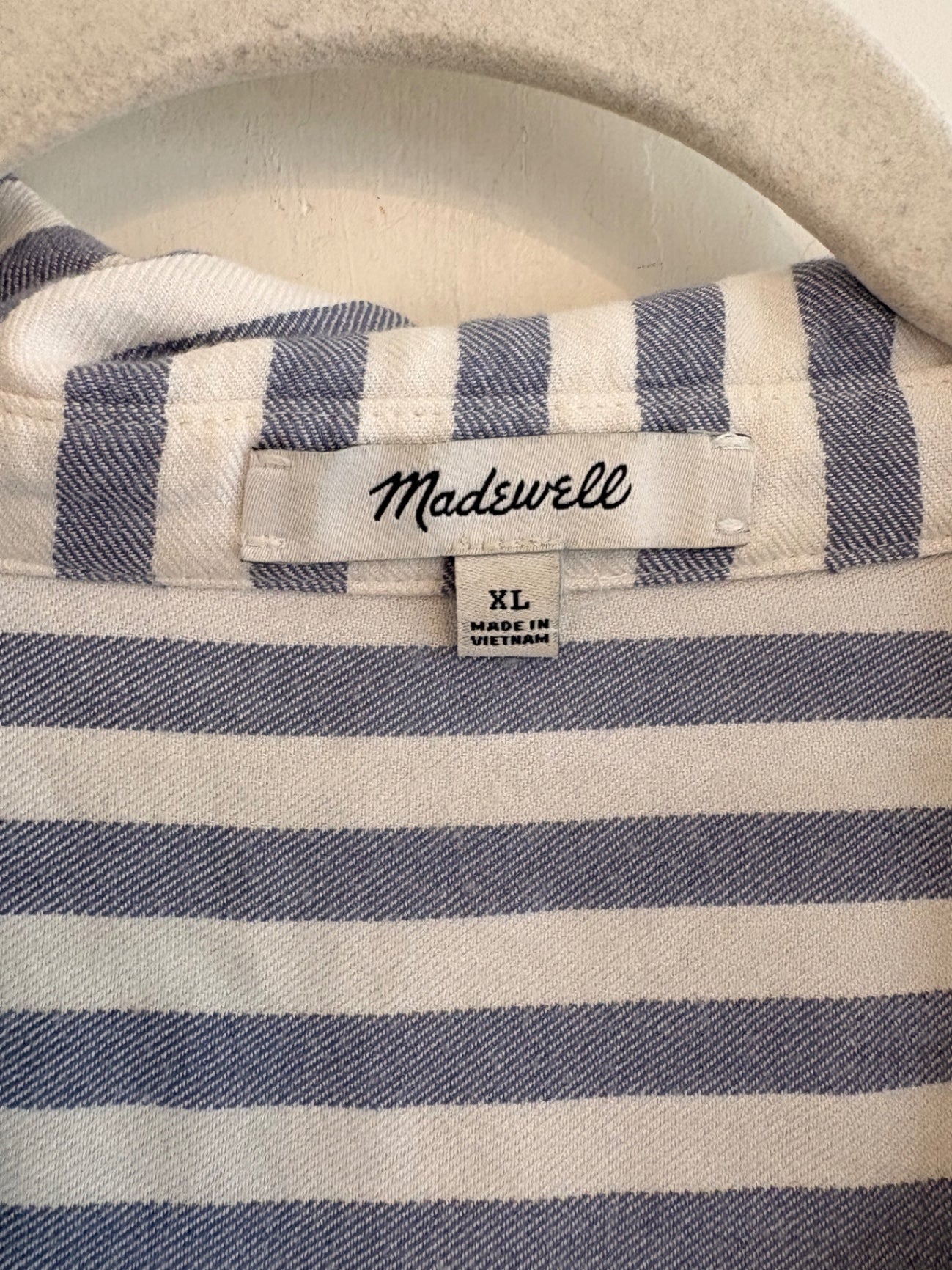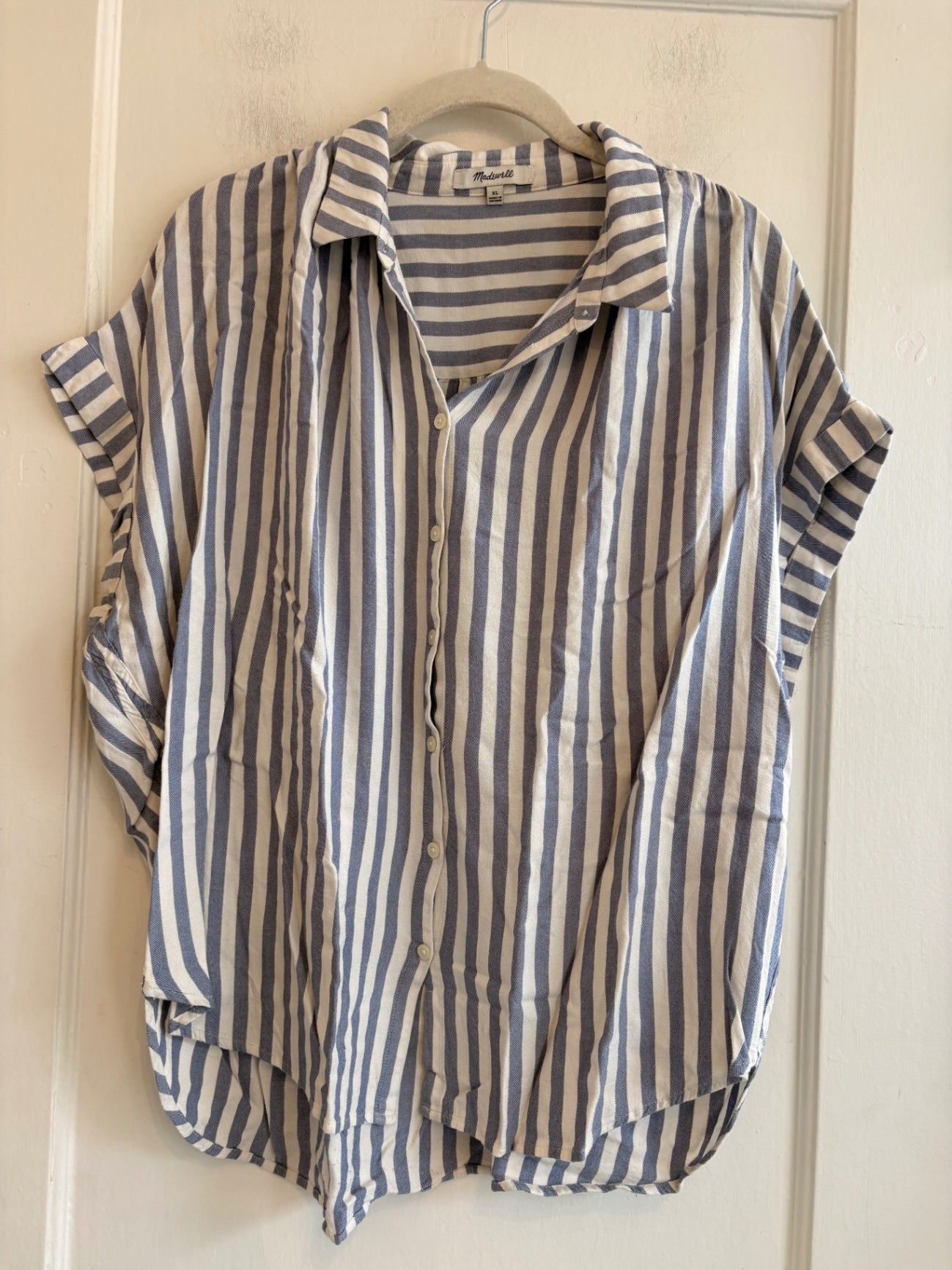 This relaxed fit linen blouse from Madewell features a classic striped pattern in beige and navy blue. It has a casual button-down front with short rolled sleeves and a lightweight, breathable fabric perfect for warm weather. The design includes a simple collar and subtle pleats at the back, adding a touch of texture. Ideal for a laid-back day out or casual office wear, it pairs well with jeans or chinos for an effortless look.