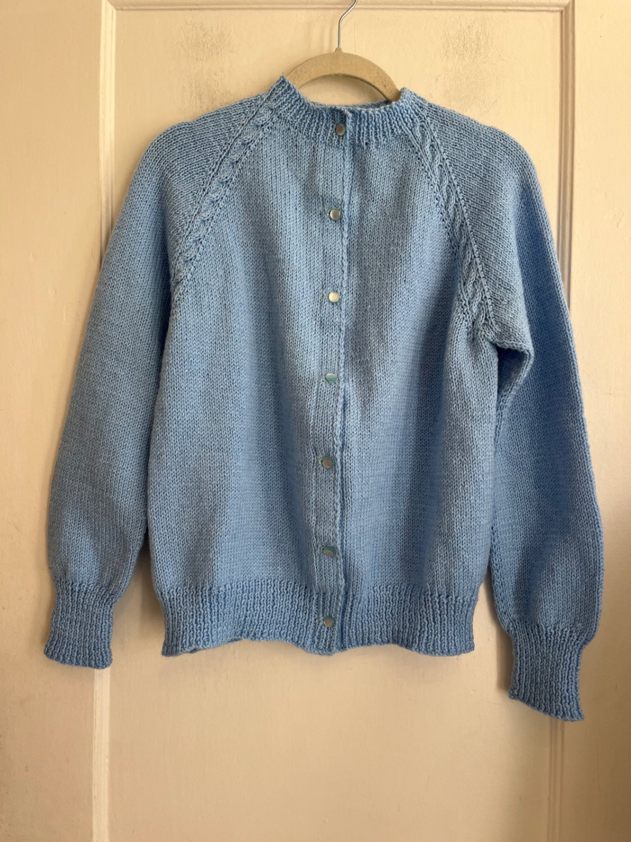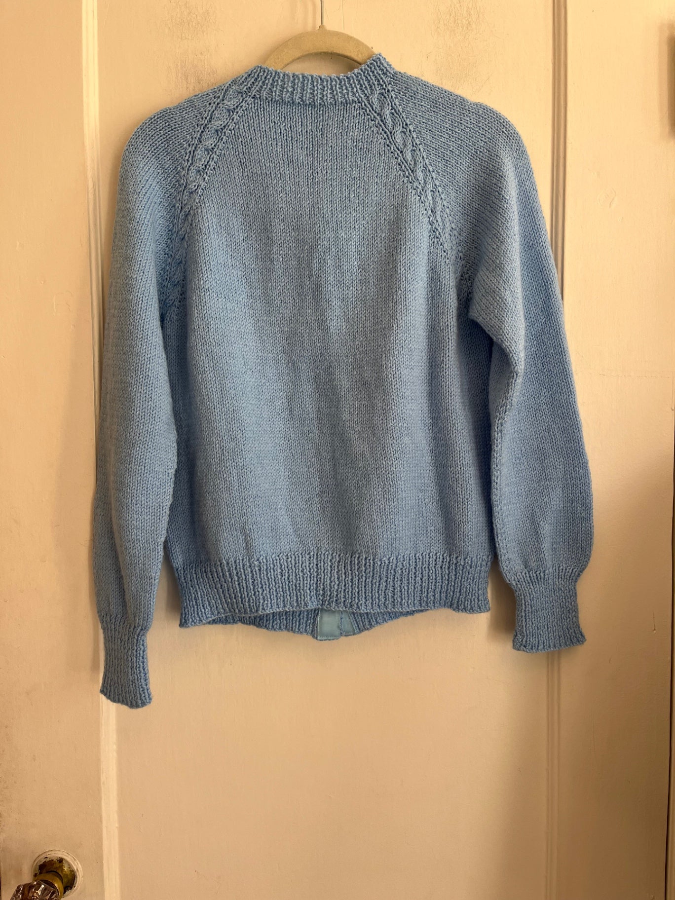 Hand-knit light blue cardigan with a classic button-front design. Features ribbed cuffs and hem.
