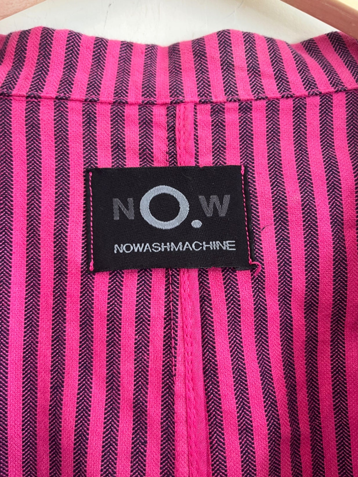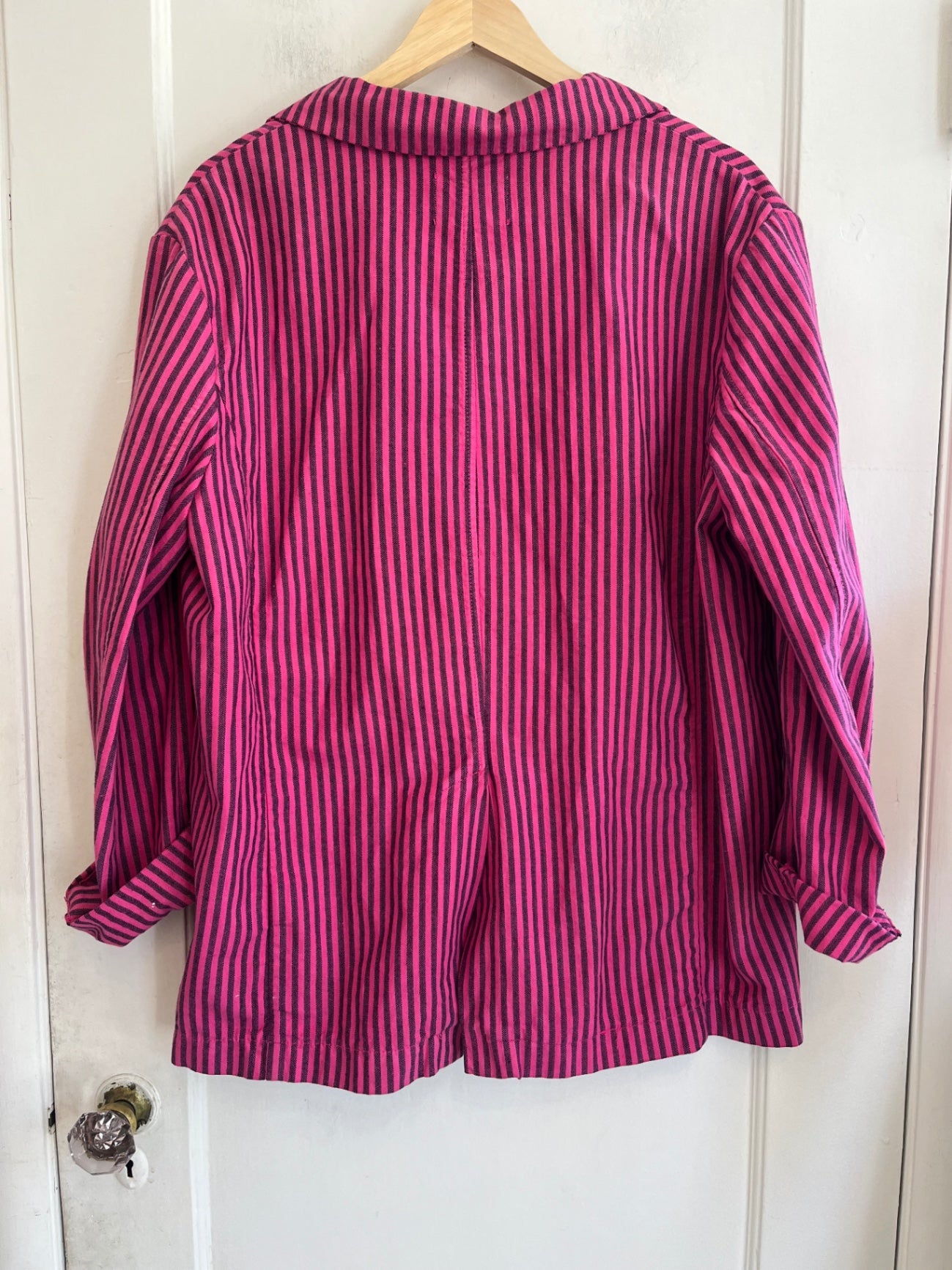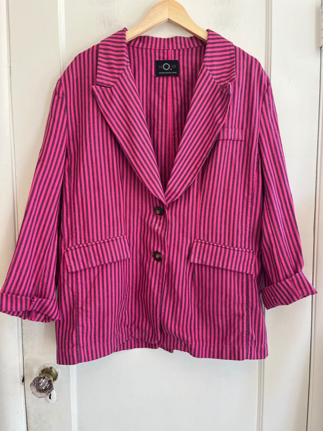 Pink and black striped blazer with relaxed fit and two-button closure. Lightweight cotton.