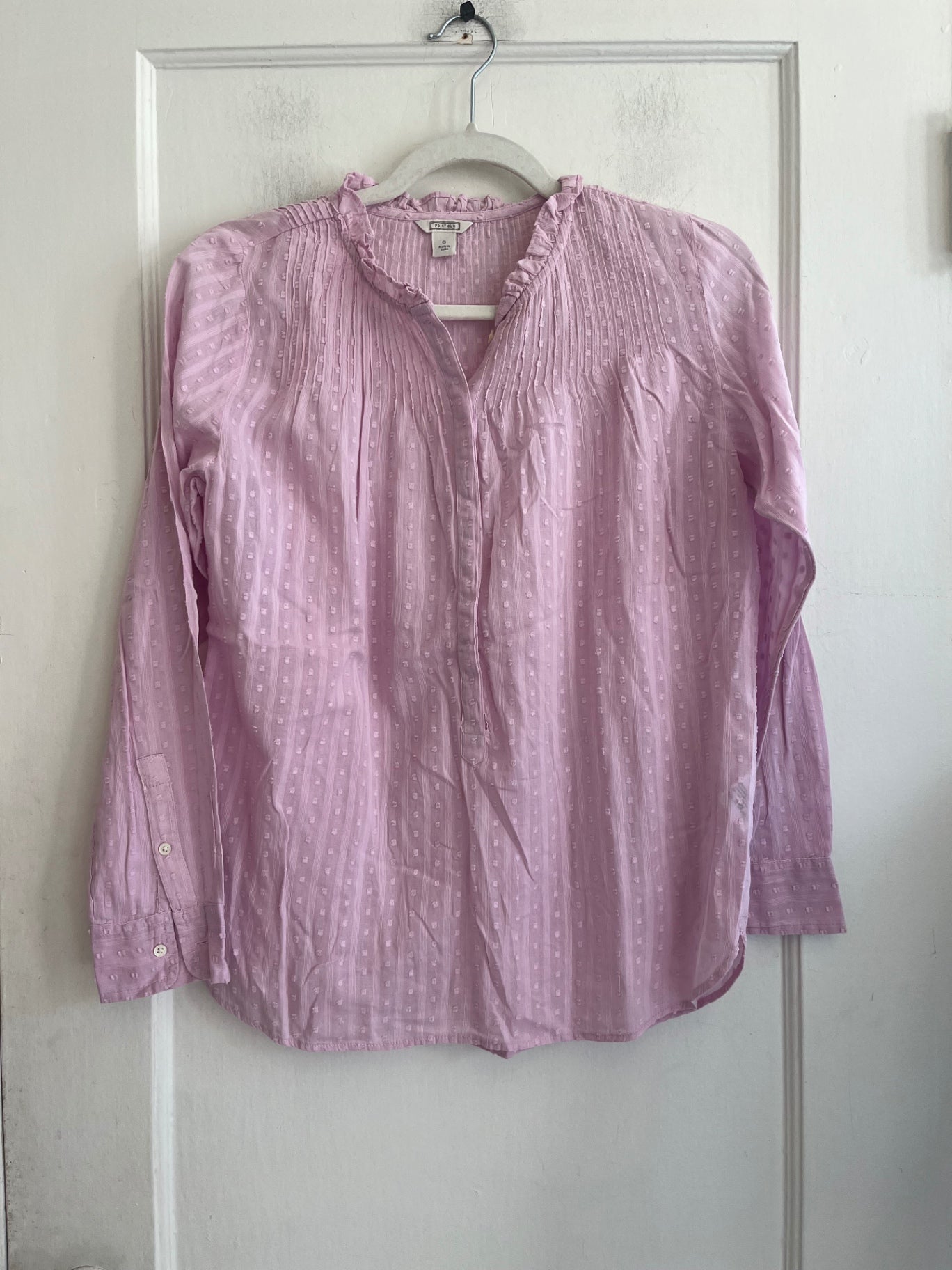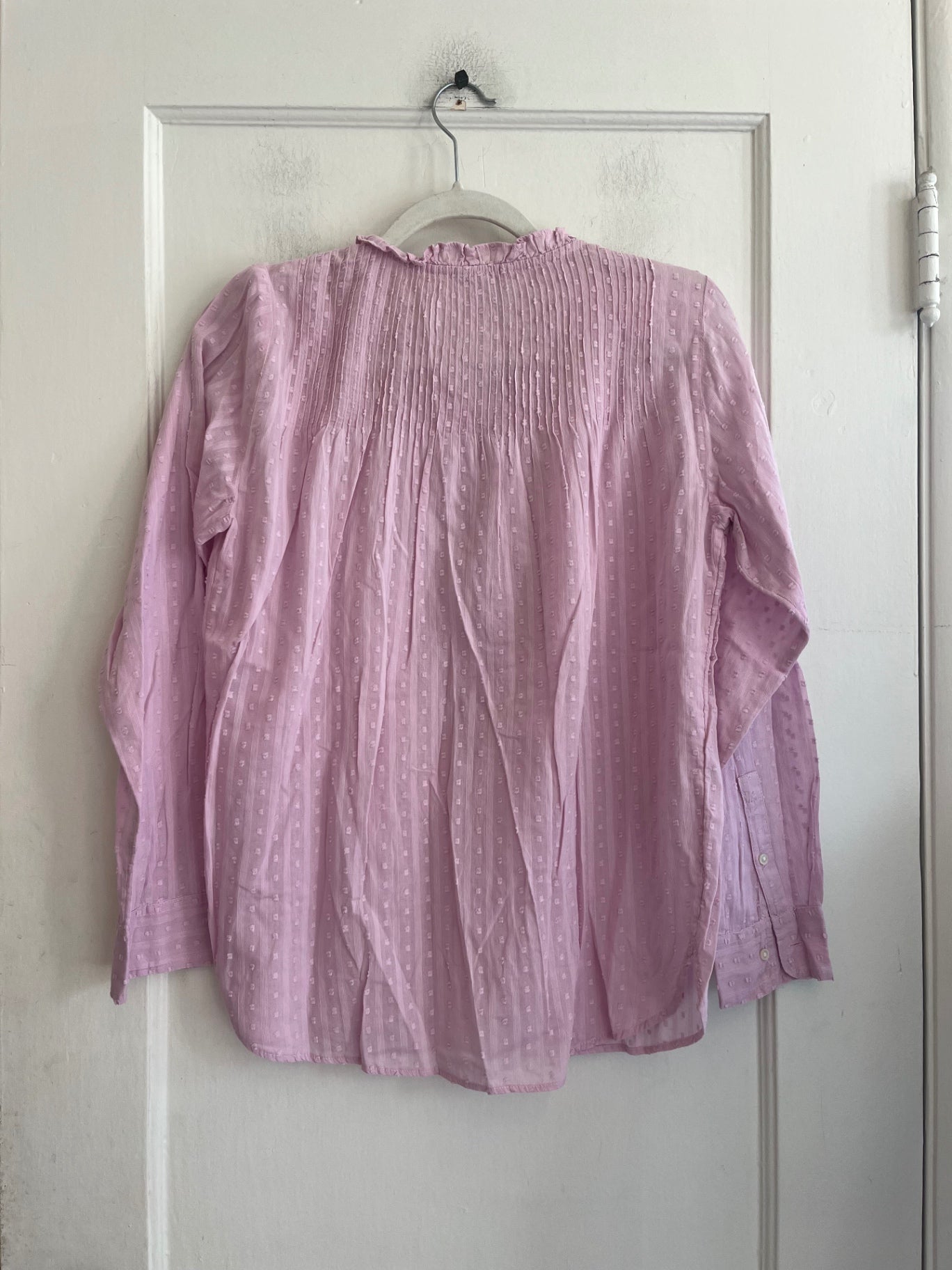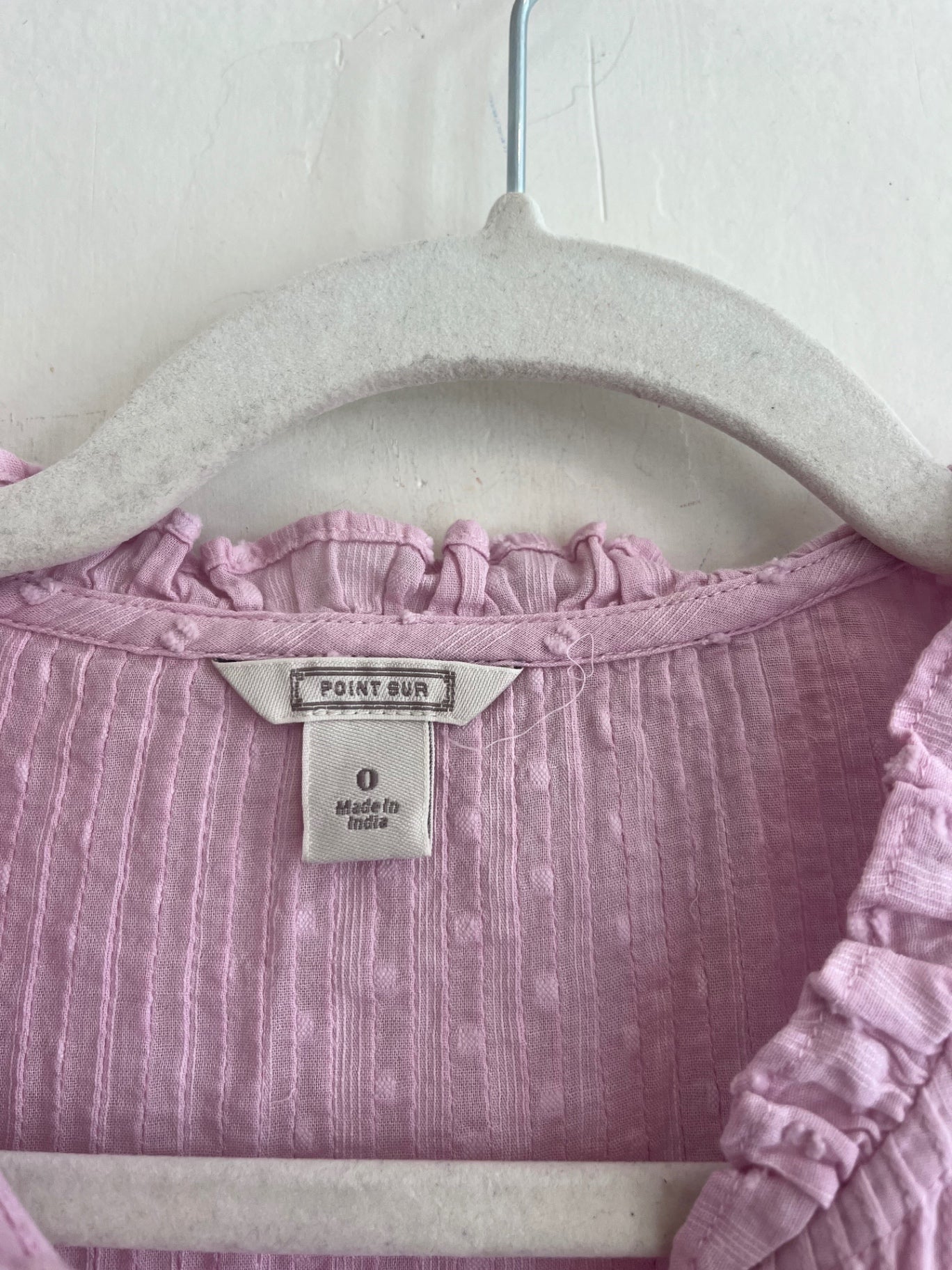 Soft pink swiss dot blouse by Point Sur featuring delicate pintuck detailing and a subtle ruffled neckline. Lightweight and airy with relaxed fit.