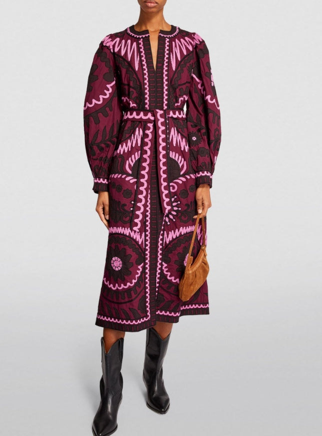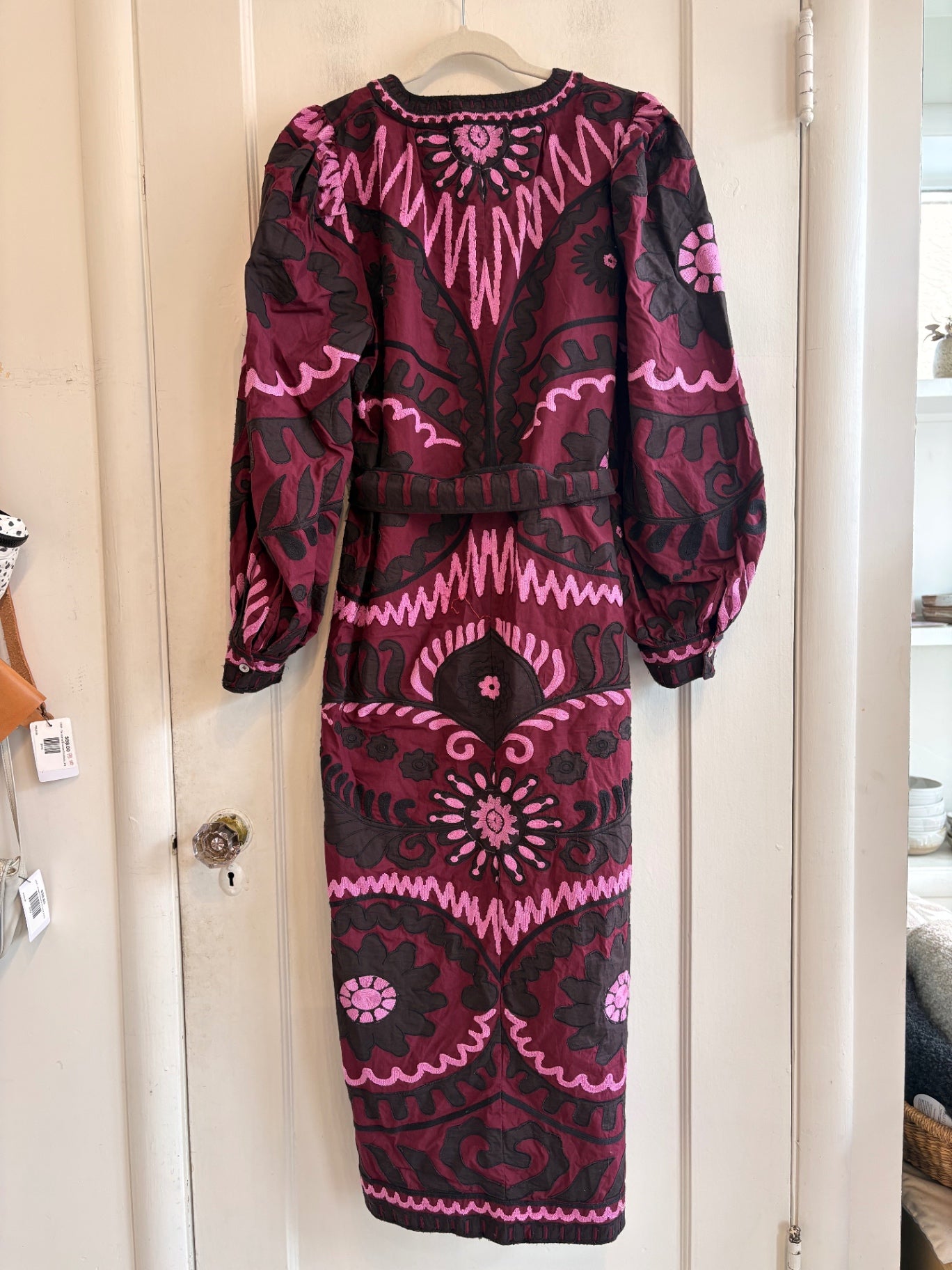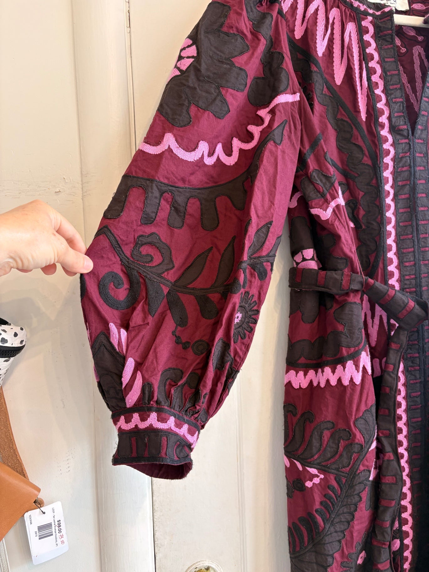 Embroidered caftan featuring long puff sleeves, split V-neckline, center front slit and removable belt.