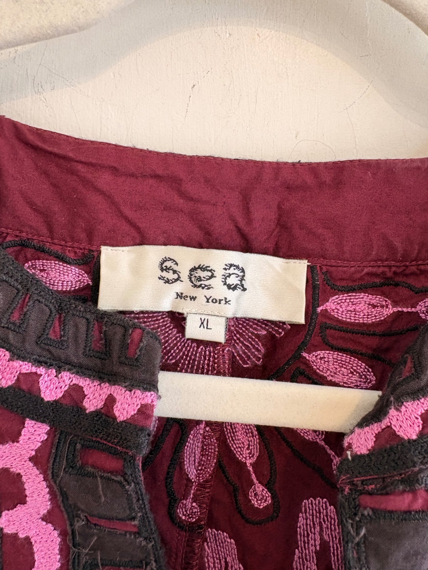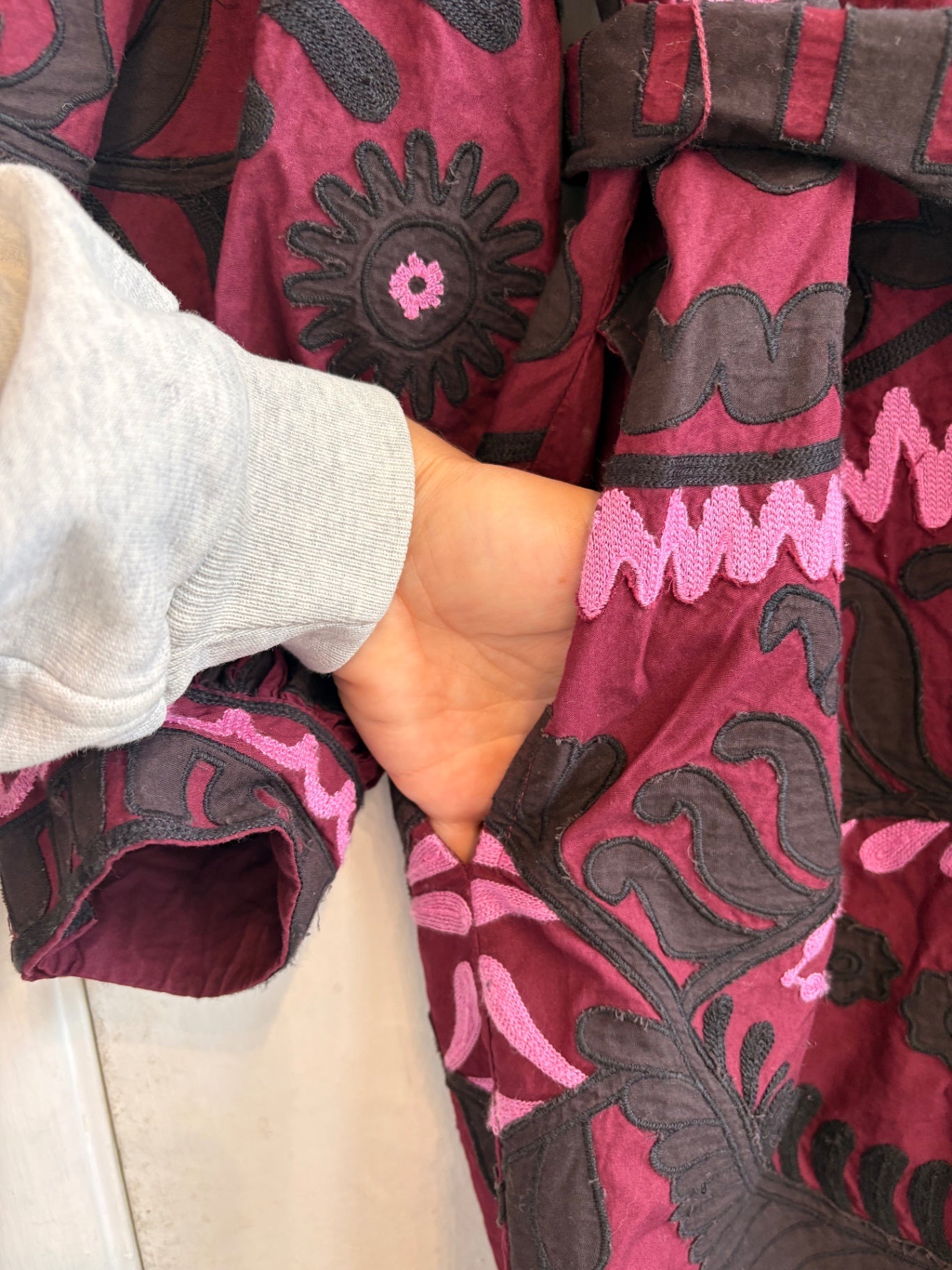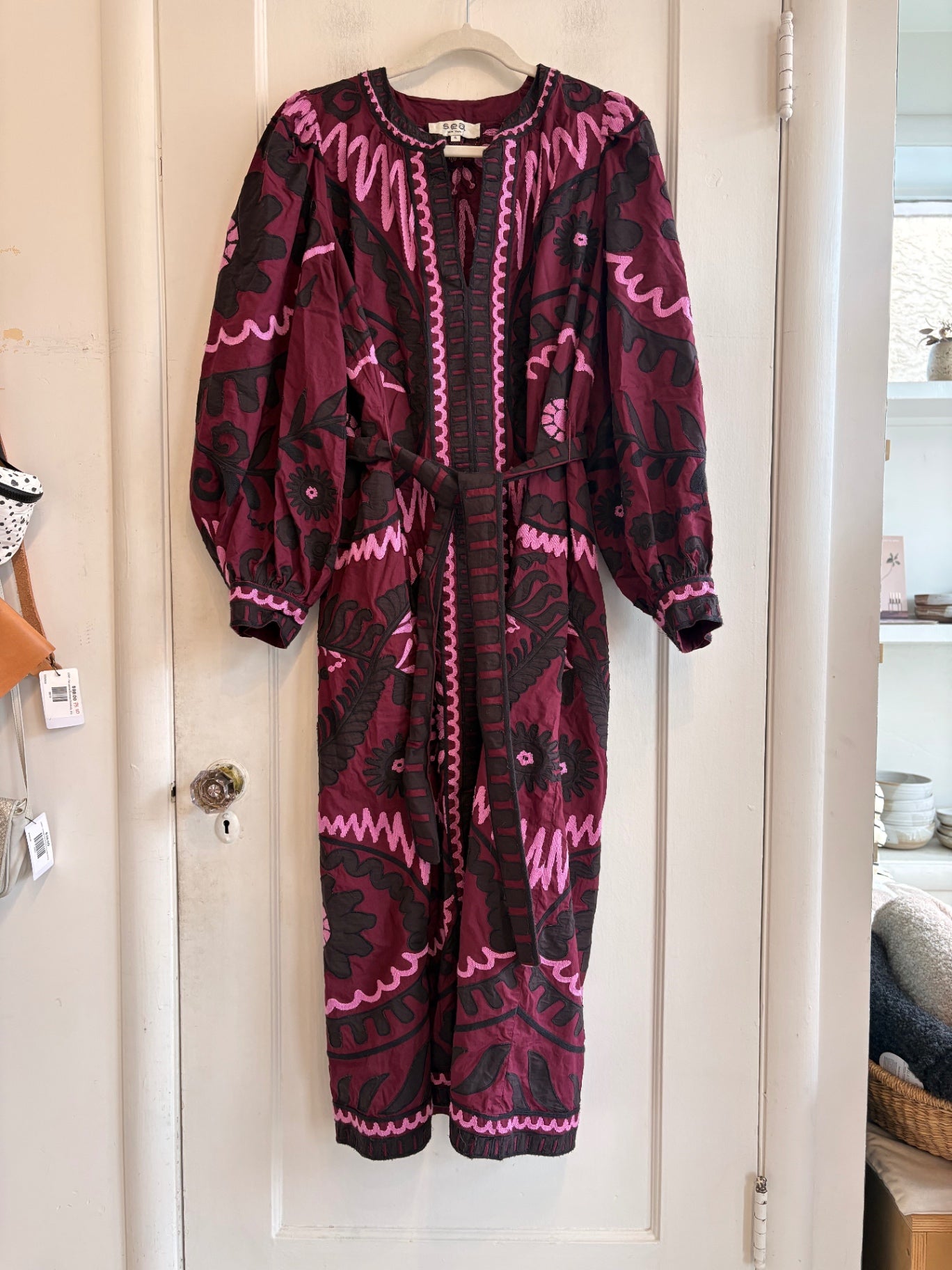 Embroidered caftan featuring long puff sleeves, split V-neckline, center front slit and removable belt.