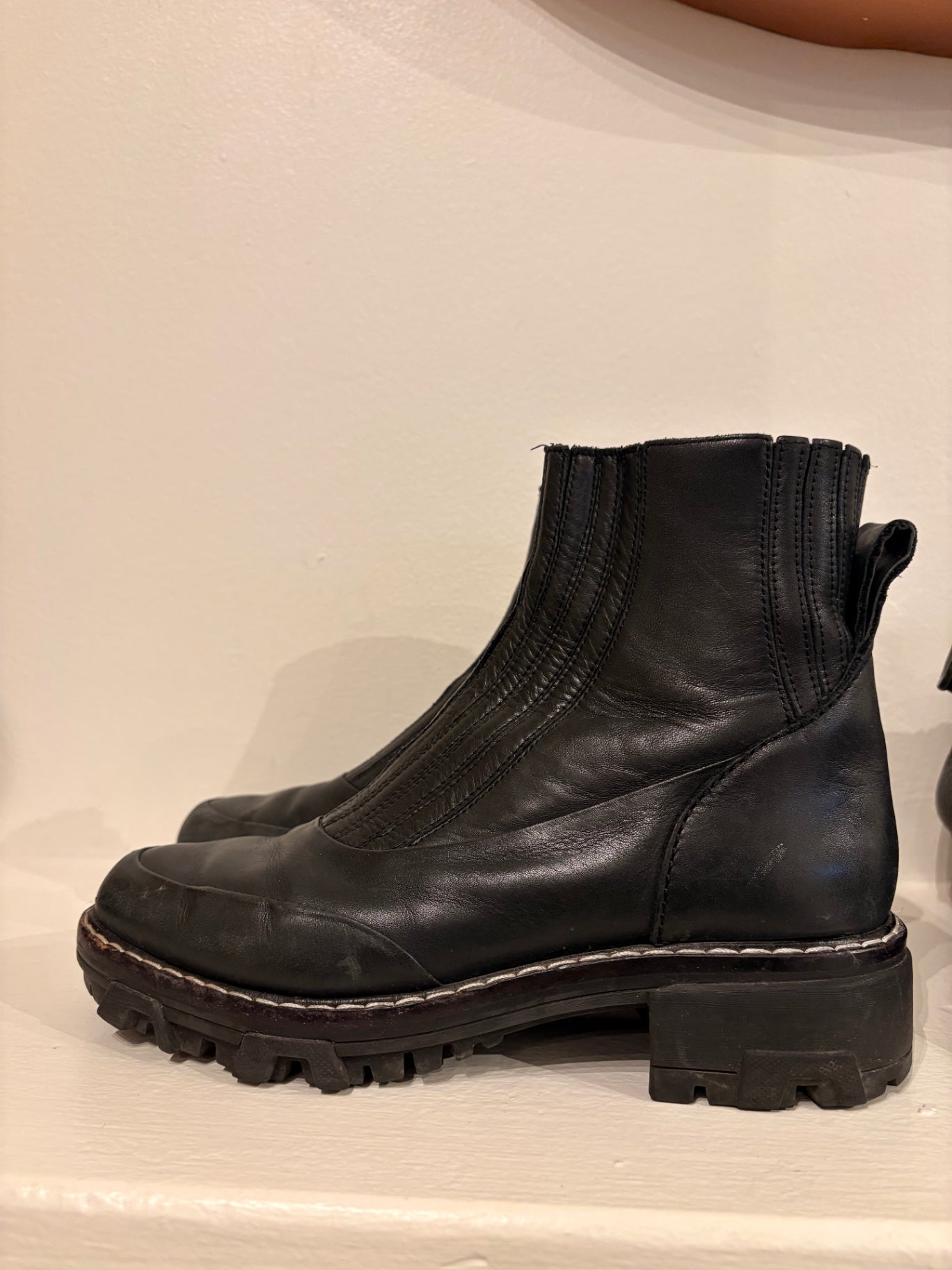 These black leather boots exude an edgy appeal with their chunky soles and structured design. Perfect for adding a bold statement to your winter wardrobe, they combine durability with style. The elastic side panels allow for easy wear, making them both practical and fashionable.