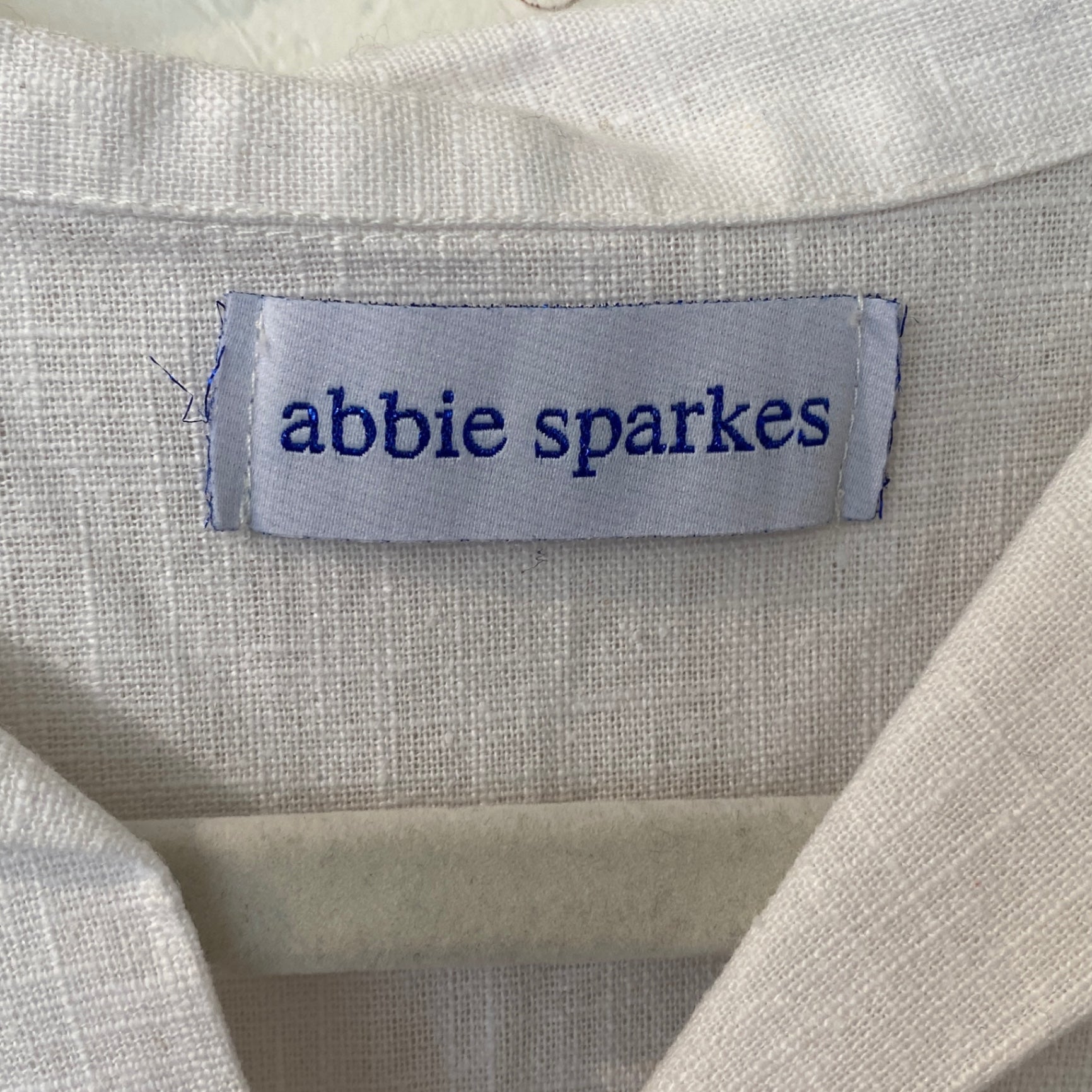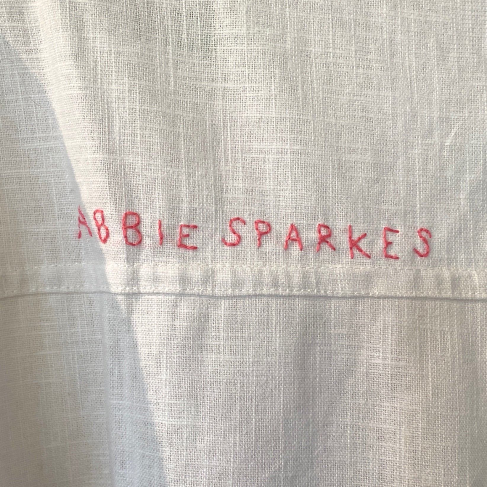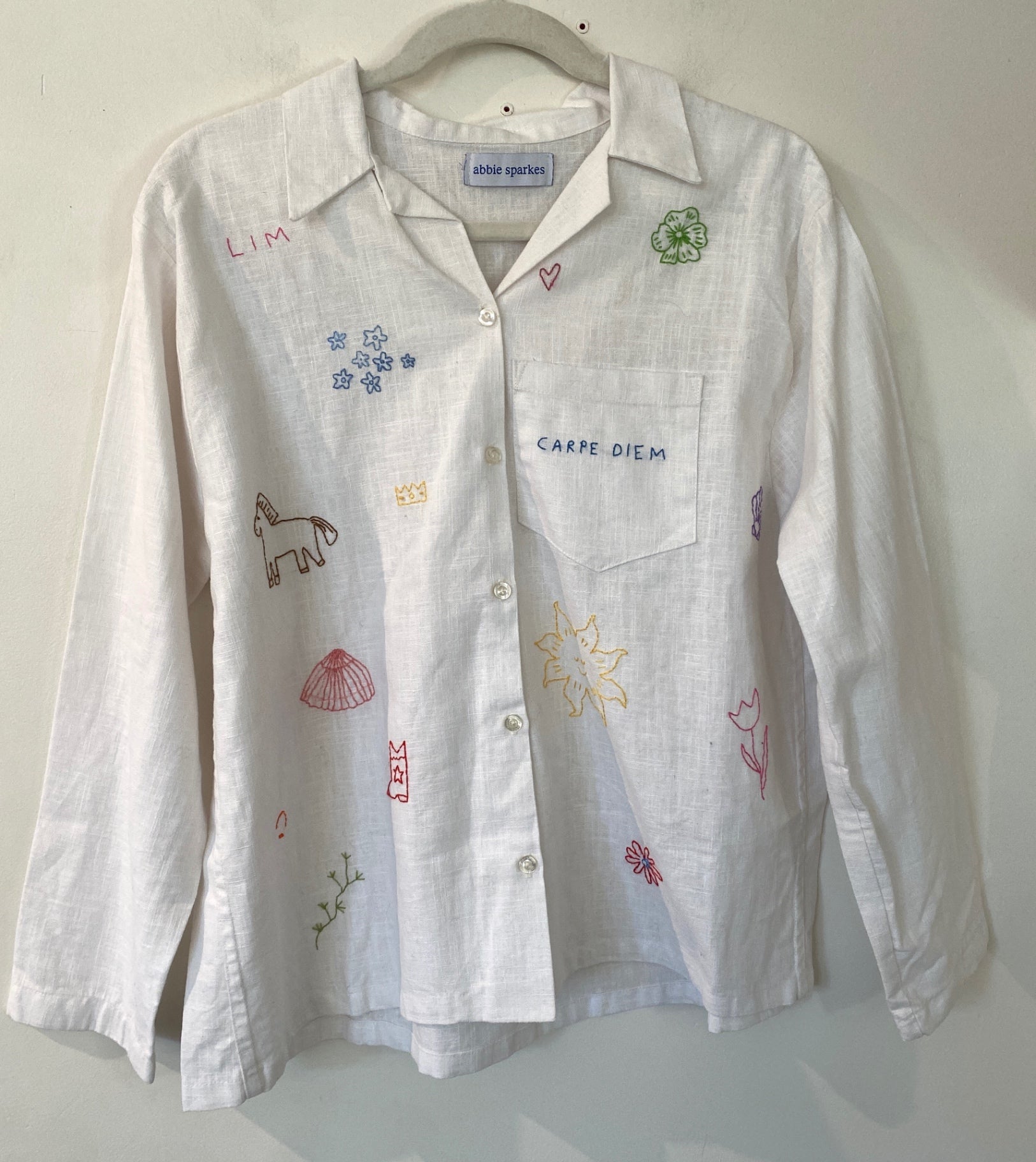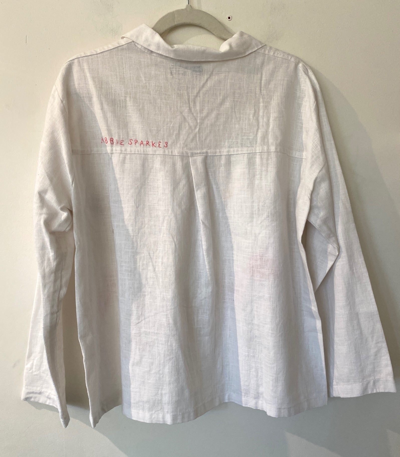 This charming white linen blouse by abbie sparkes features delicate hand-embroidered designs with whimsical floral and animal motifs. Embellished with playful embroidery in bright colors, it adds a touch of fun to any casual wardrobe. The relaxed fit and lightweight fabric make it perfect for warm weather days. Subtle details like the front pocket and soft collar enhance its laid-back elegance. A must-have for those who love unique, handcrafted style.