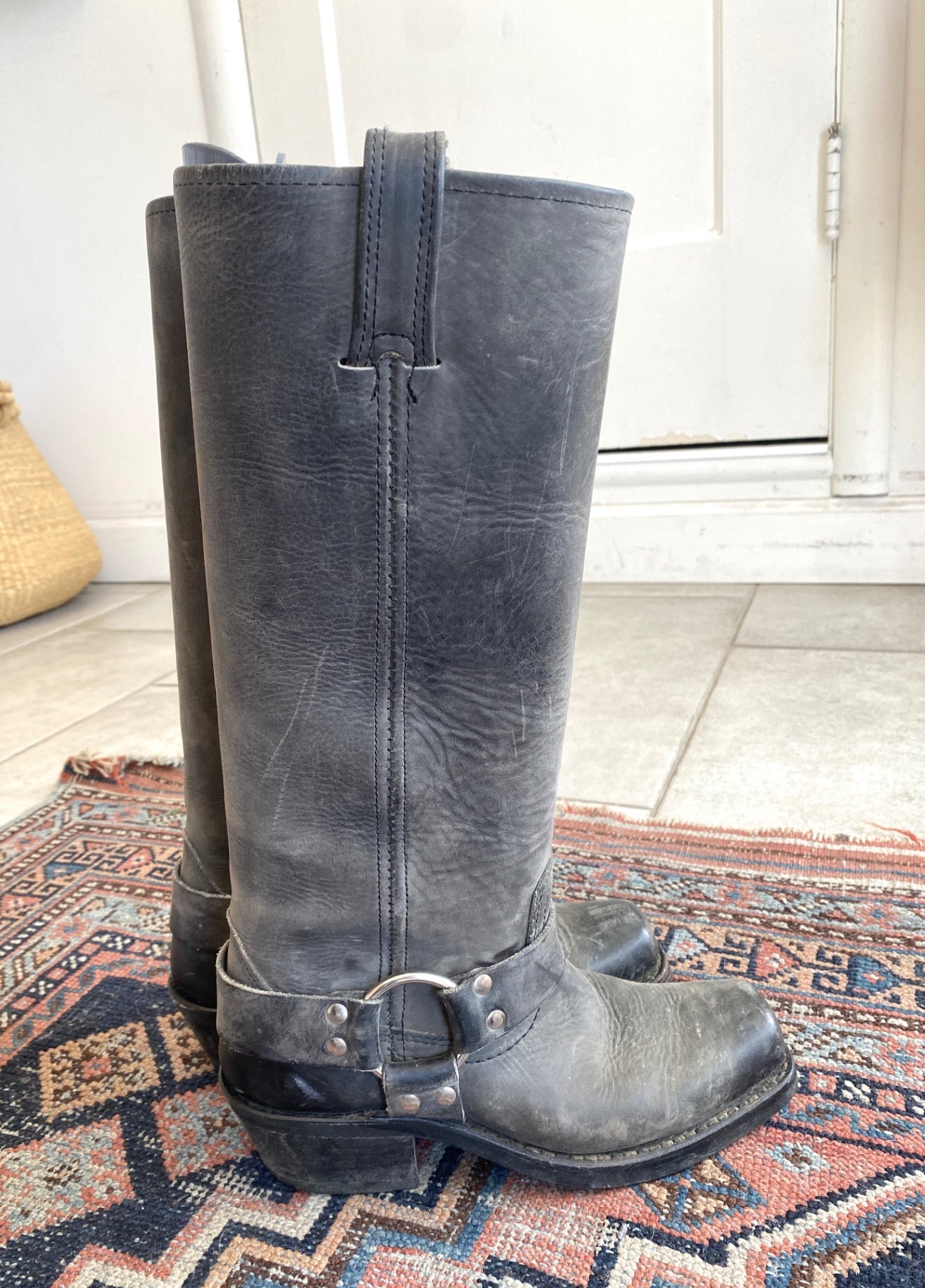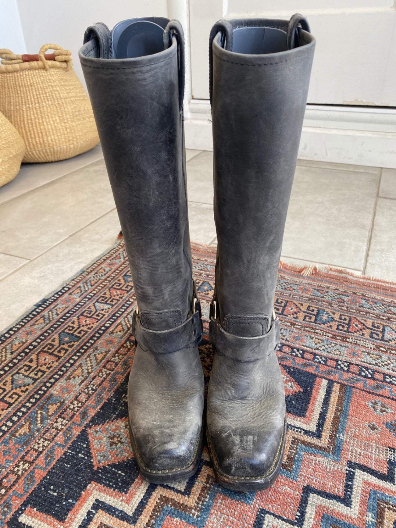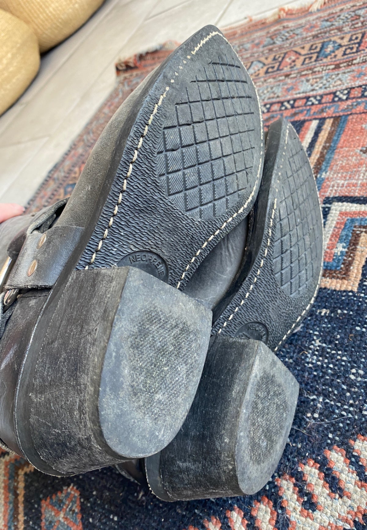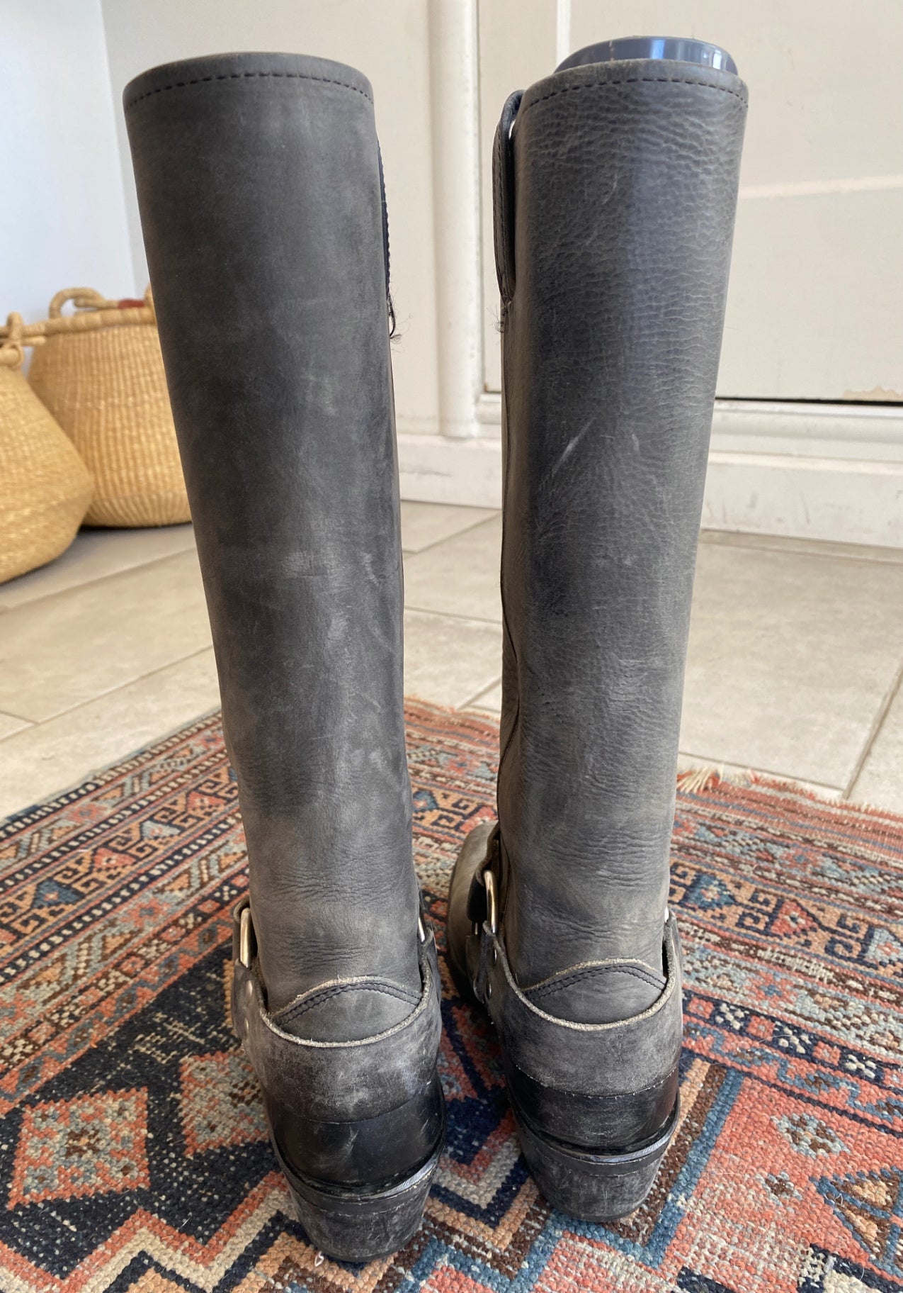 These are tall, rugged leather boots with a squared toe and a thick block heel. They feature decorative straps with metal rings around the ankle for added style. The boots show signs of wear, giving them a vintage, distressed look. Ideal for outdoor activities or making a fashion statement with a tough, edgy vibe.