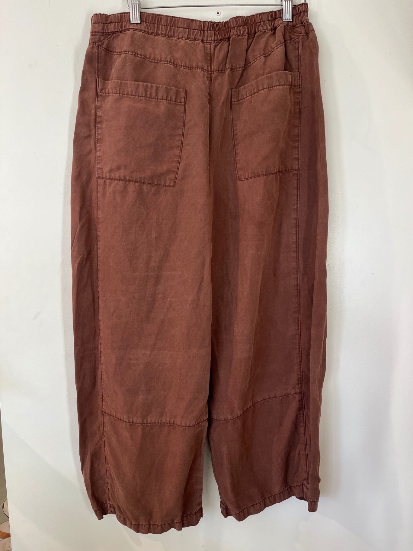 Soft, lightweight rust colored wide-leg pant with elastic waist and side pockets.