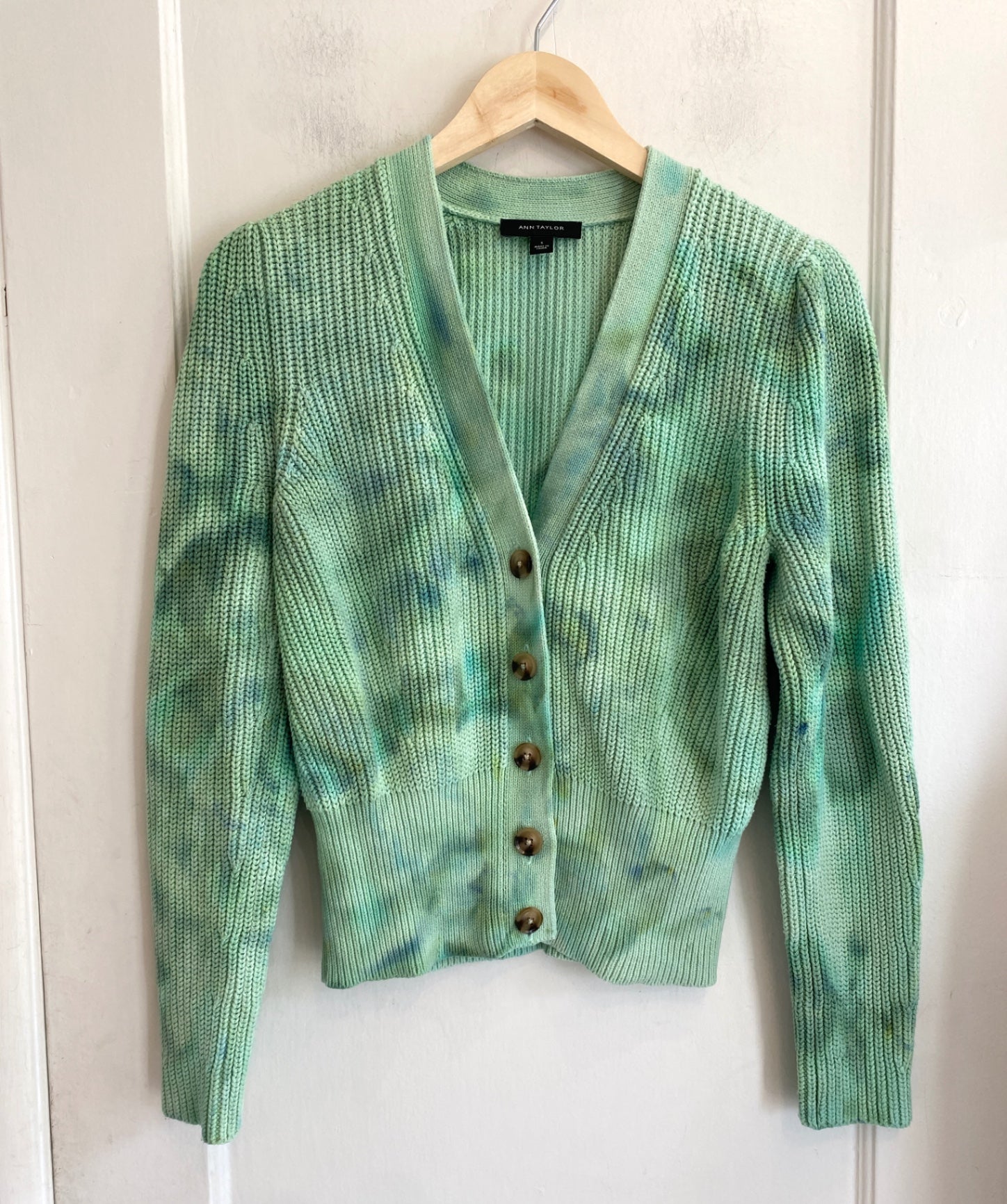 One-of-a-kind, reimagined cardigan sweater, hand ice-dyed in Oakland, CA.